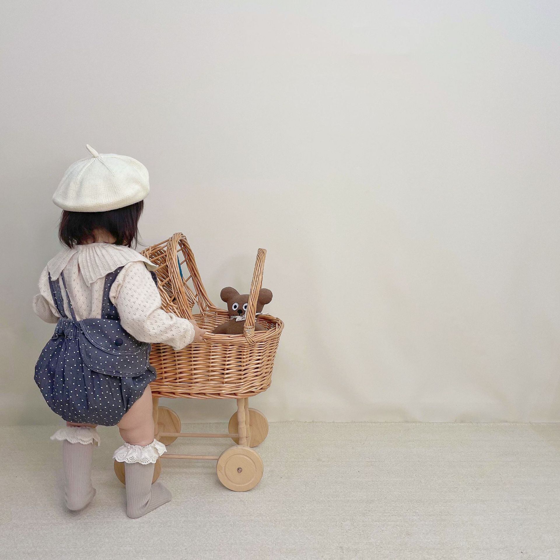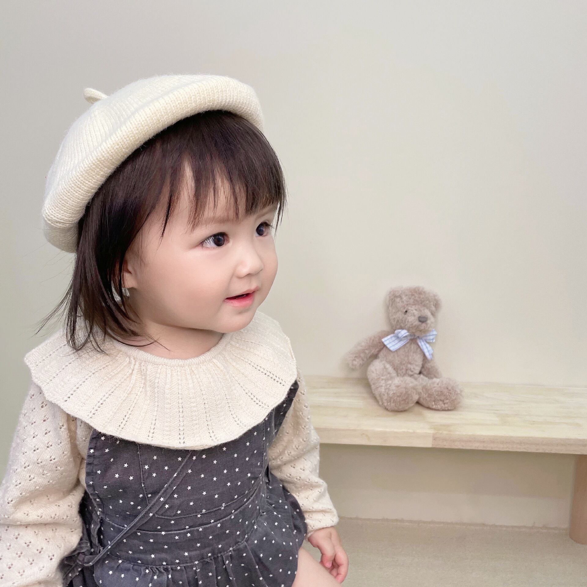 色:スターオーバーオール,ベージュのフリルカラートップ,スターオーバーオール+ニットトップス