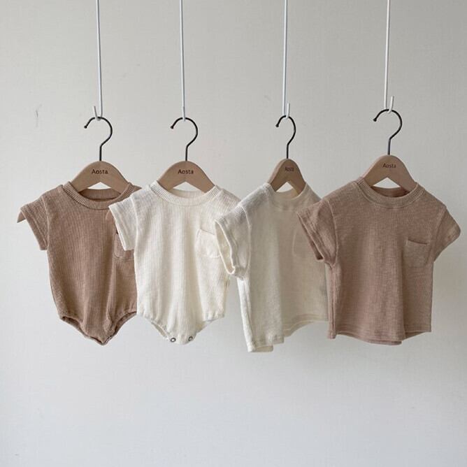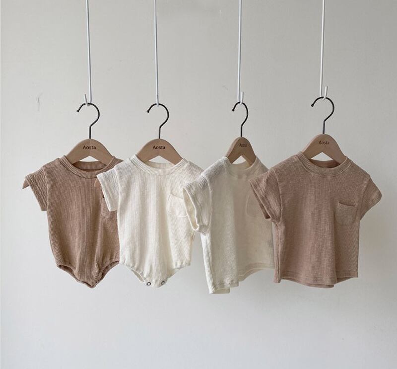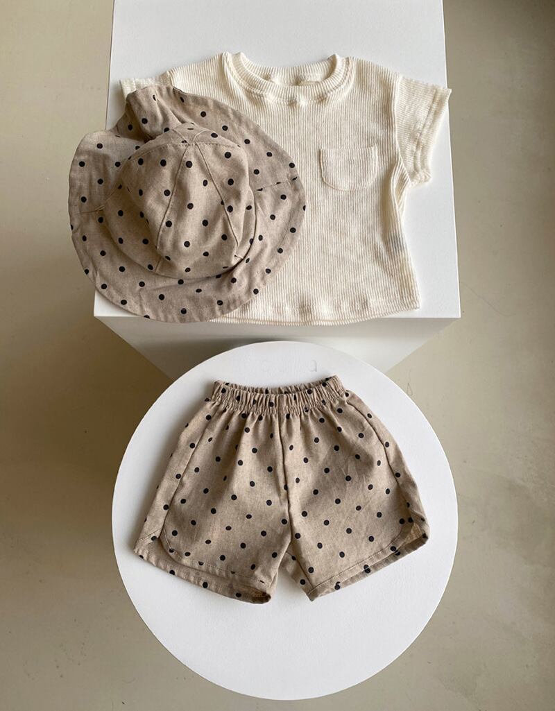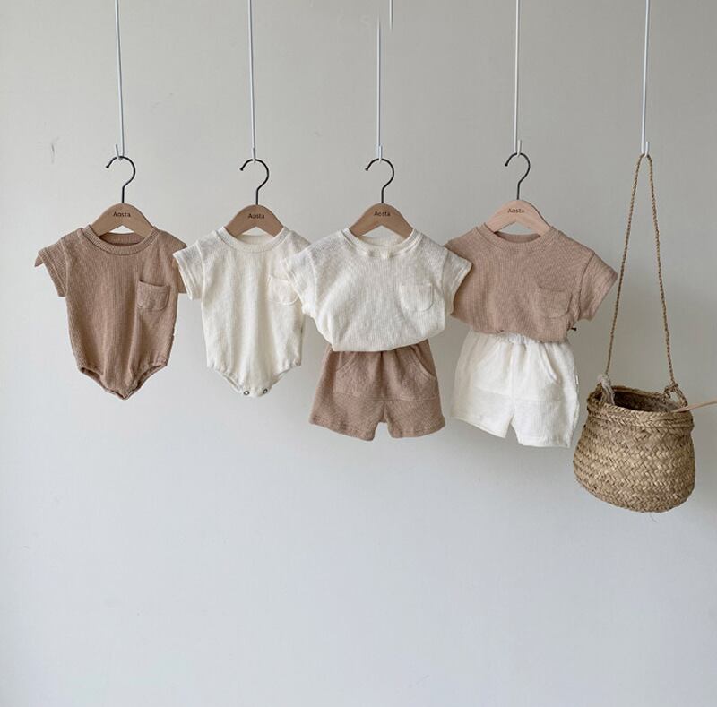 色:ベイバイハイ,カーキロンパース,ベージュTシャツ,カーキTシャツ,オフホワイトのショーツ,カーキショートパンツ