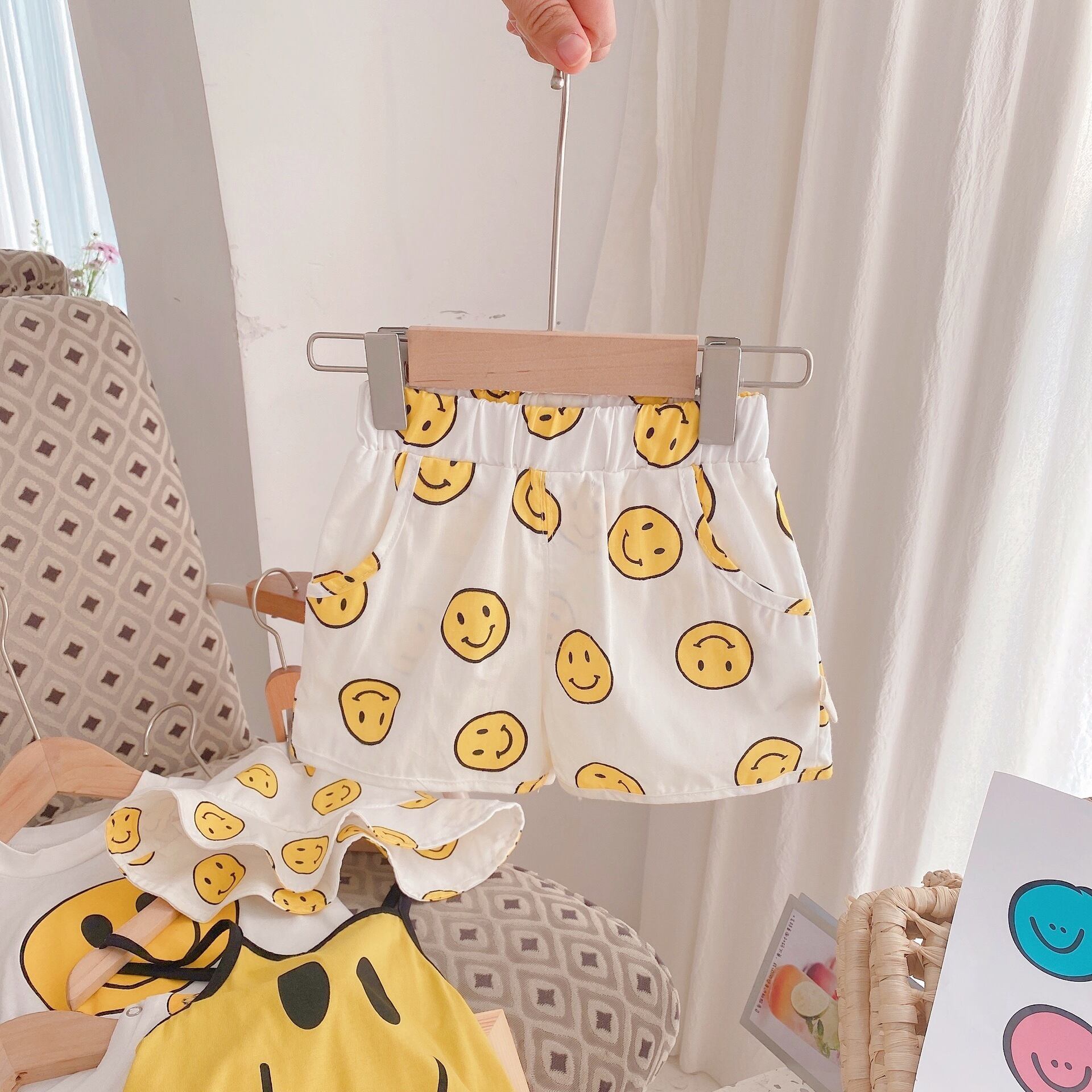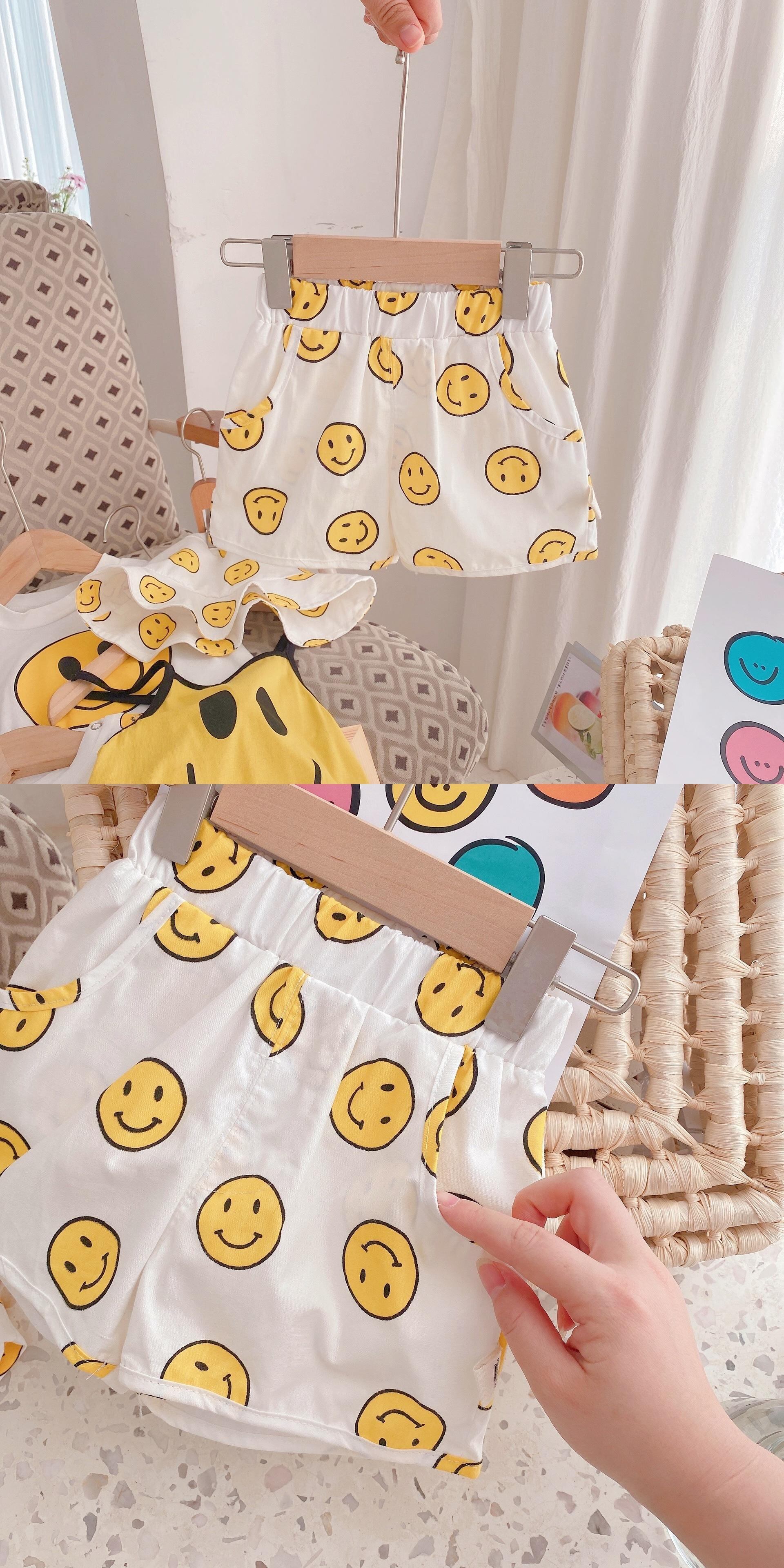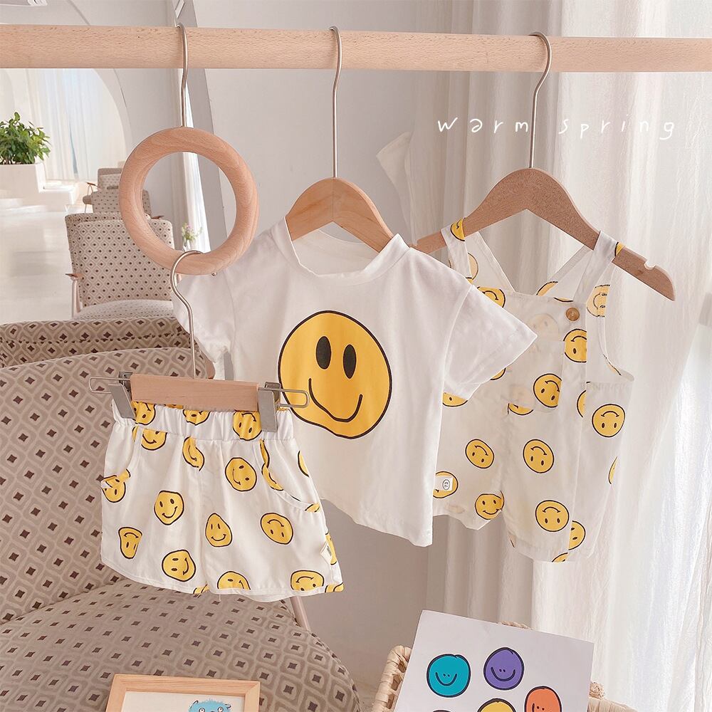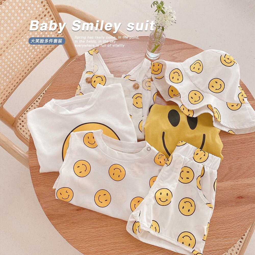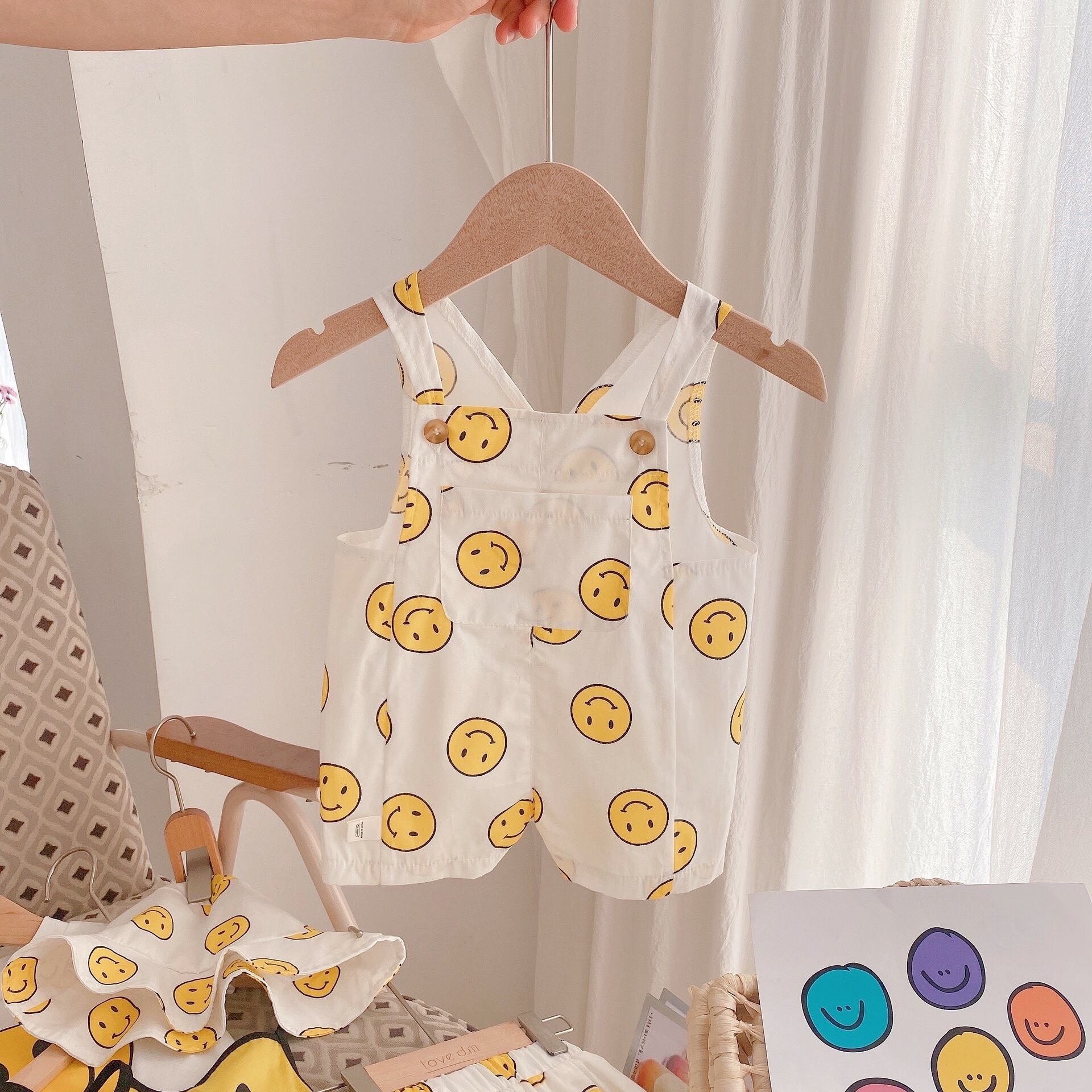 色:コート,ショートパンツ,ビブシャム,スマイリーハット,スマイリーロンパースをスリング