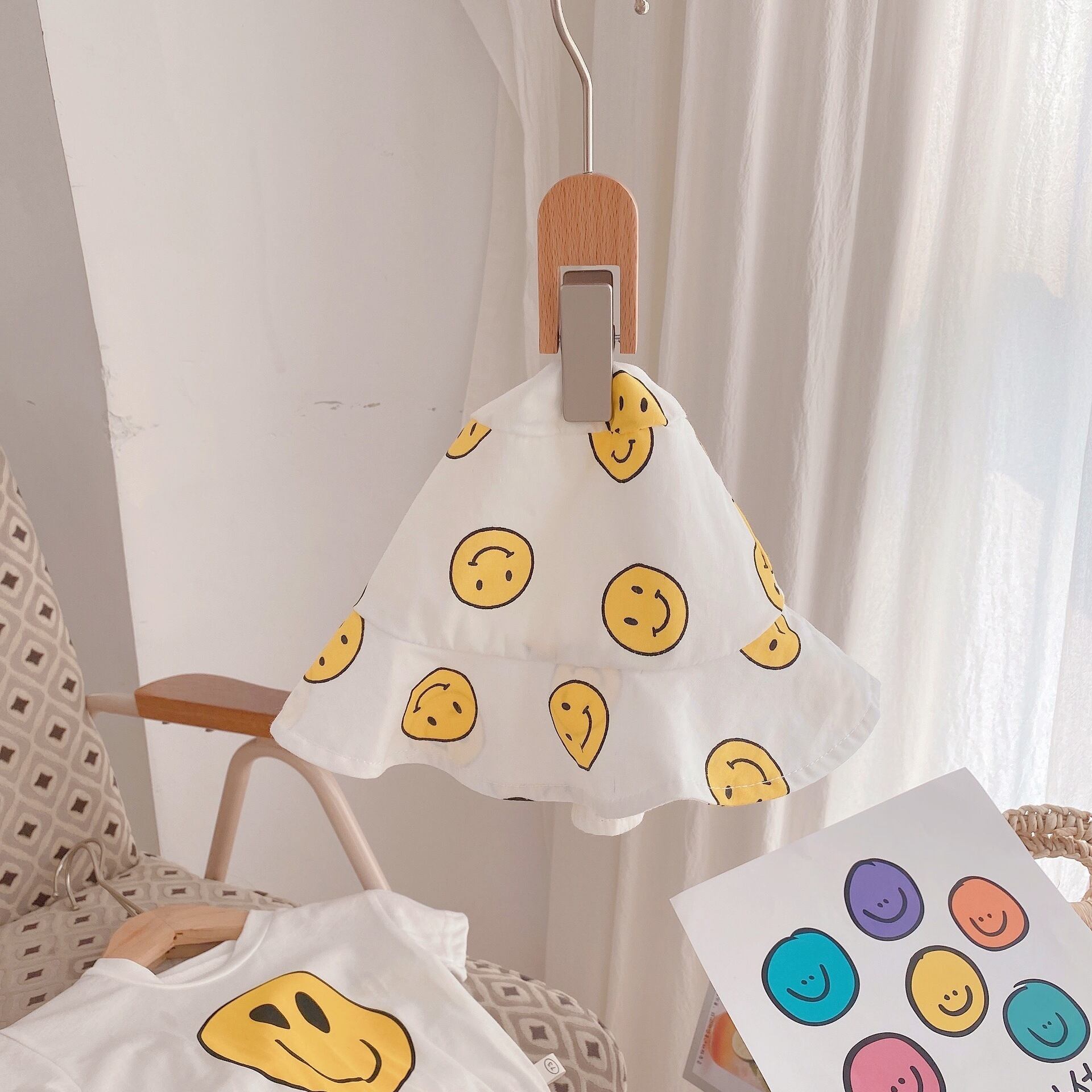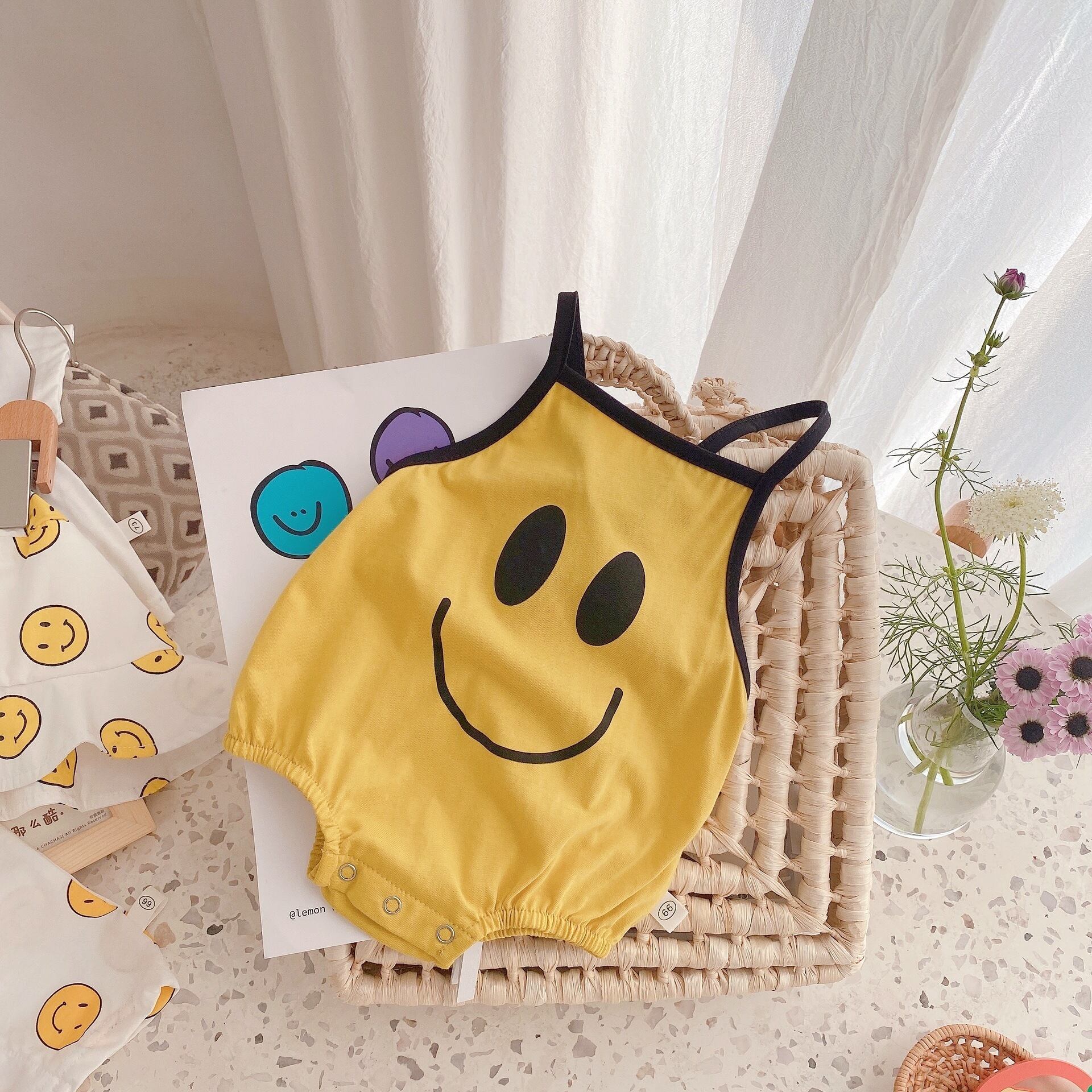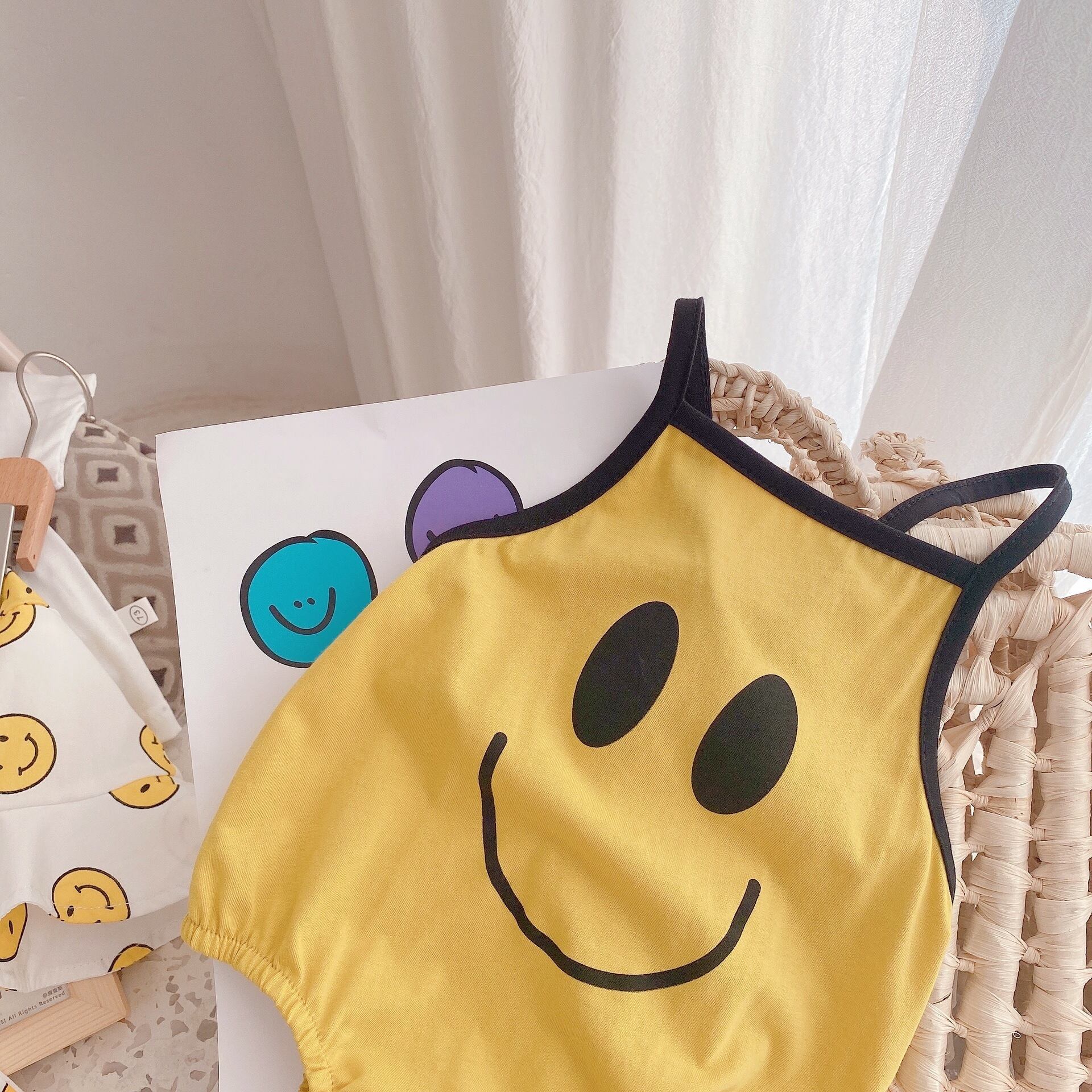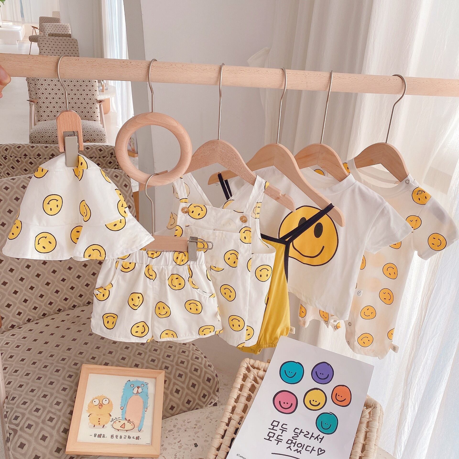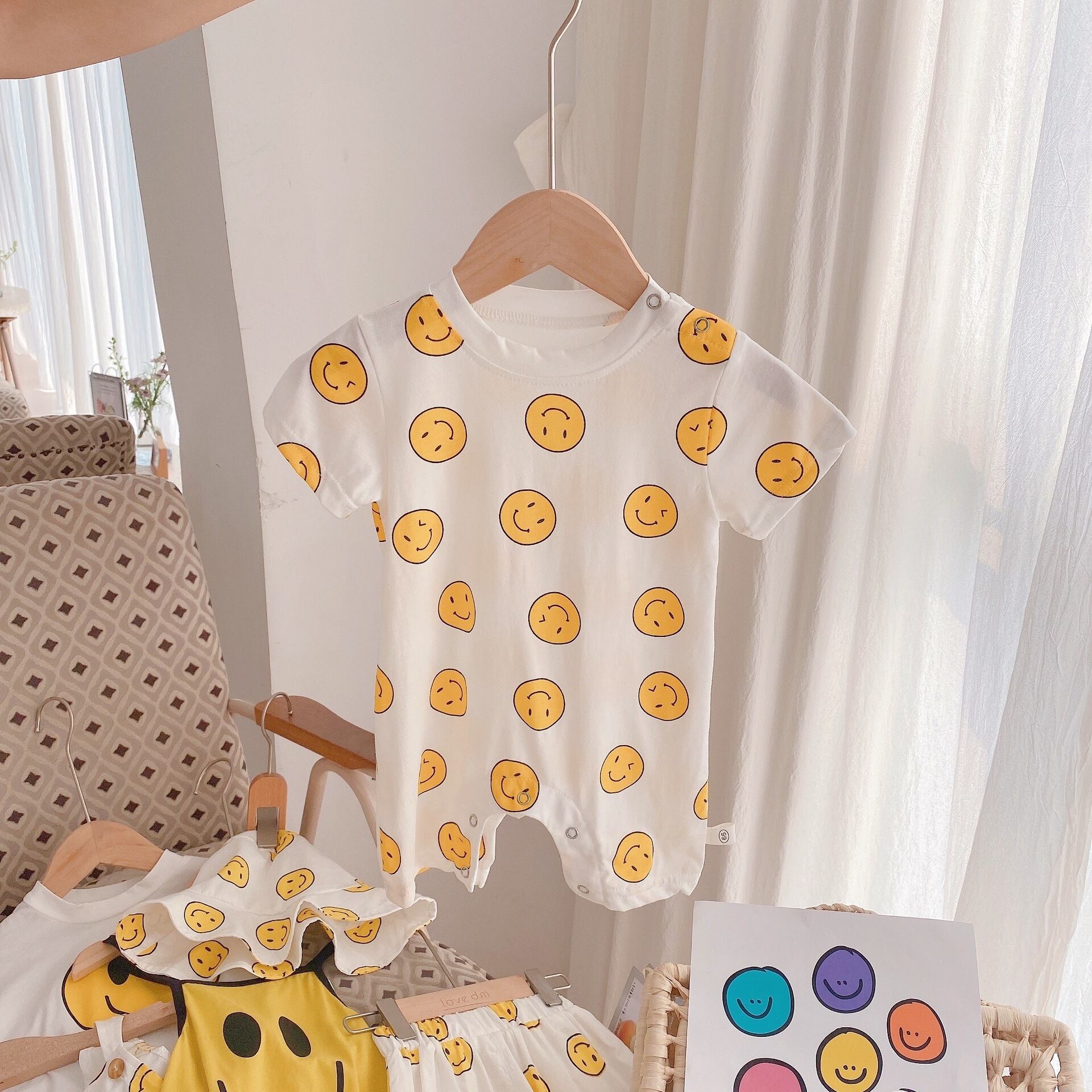 色:コート,ショートパンツ,ビブシャム,スマイリーハット,スマイリーロンパースをスリング