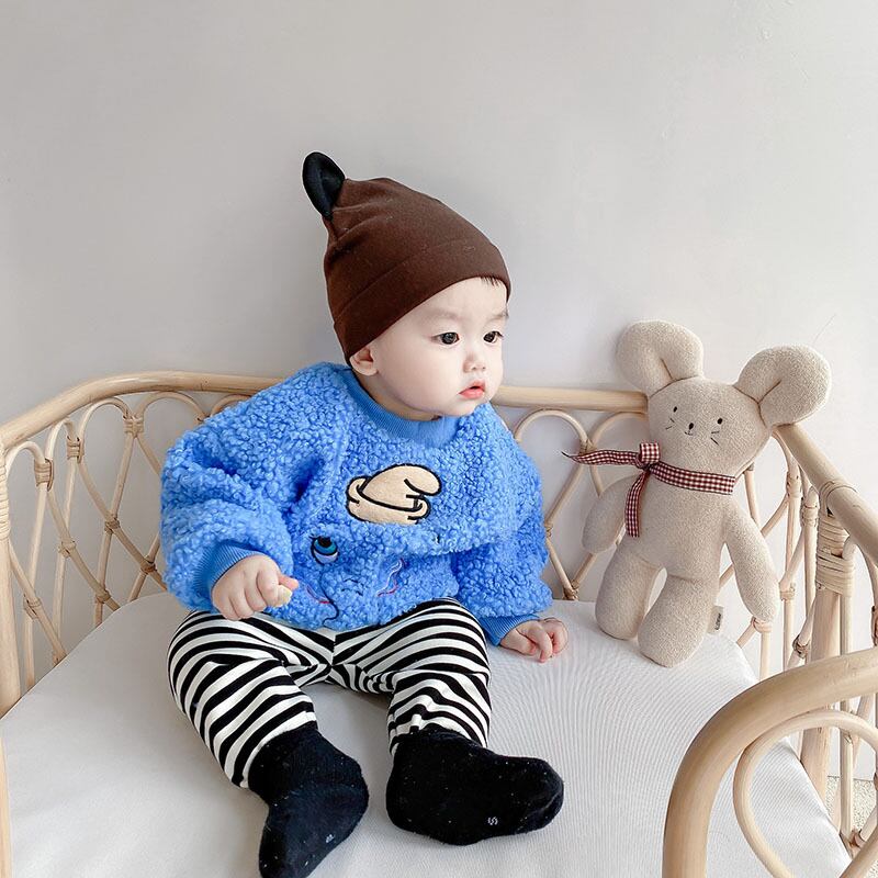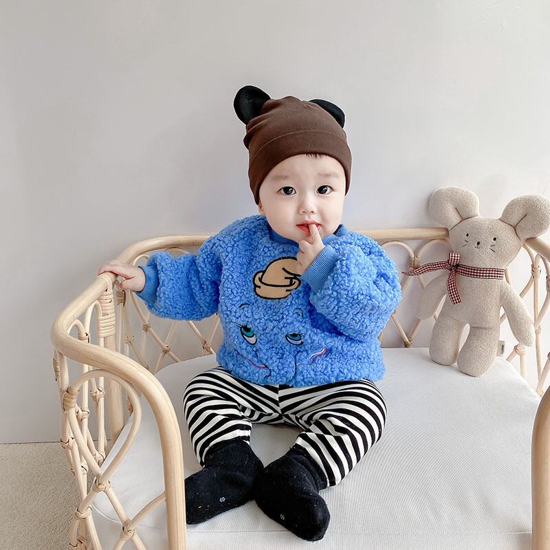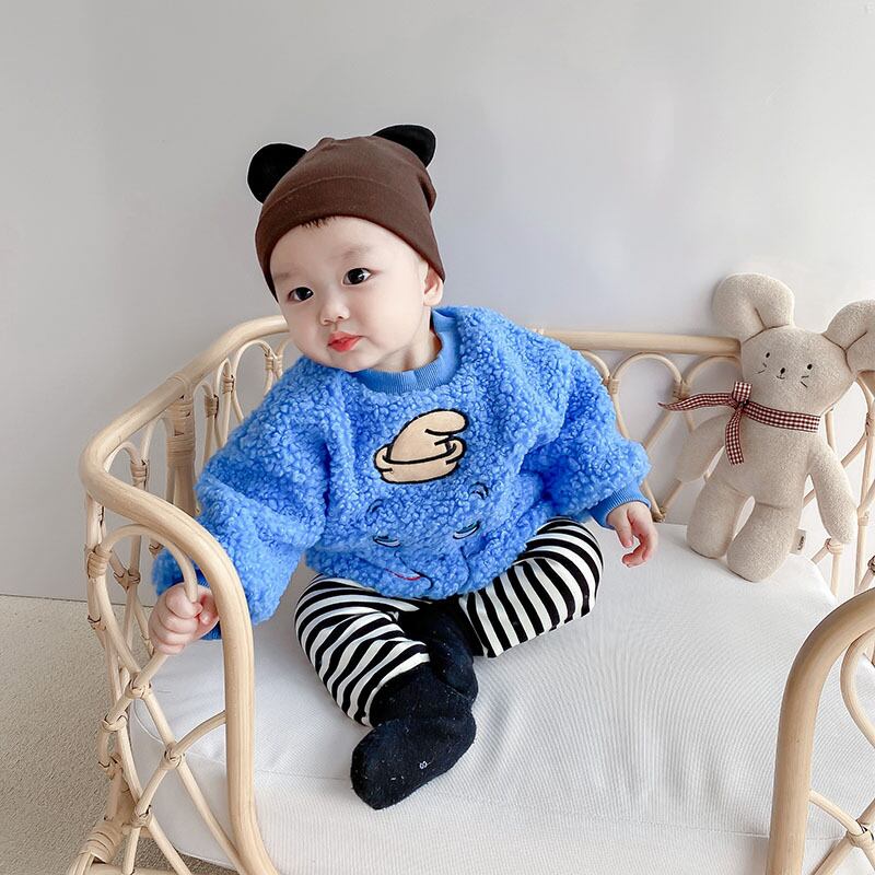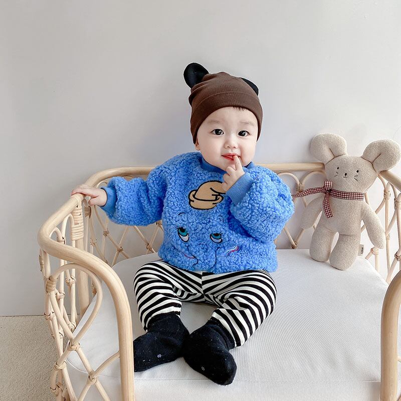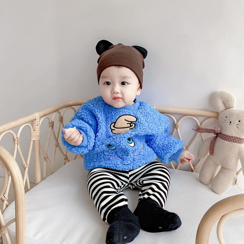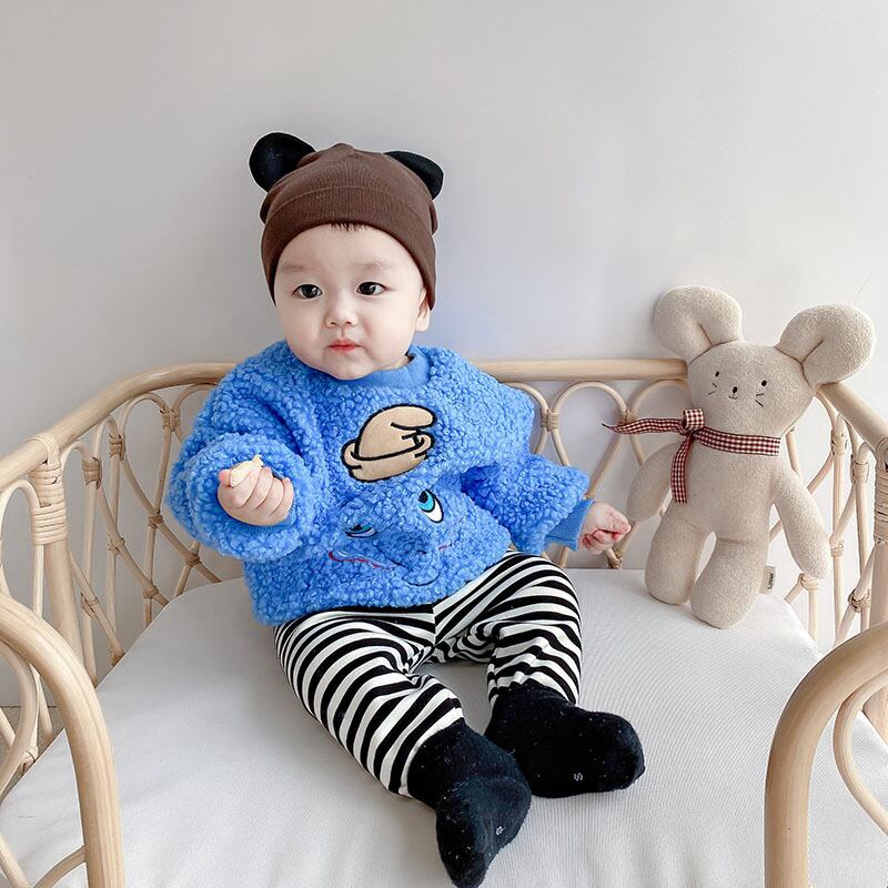色:ブルーエレファントトップ,黒と白のストライプパンツ