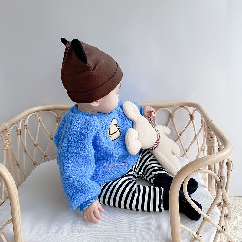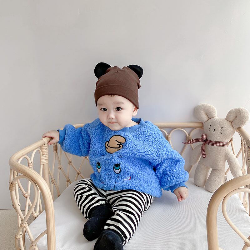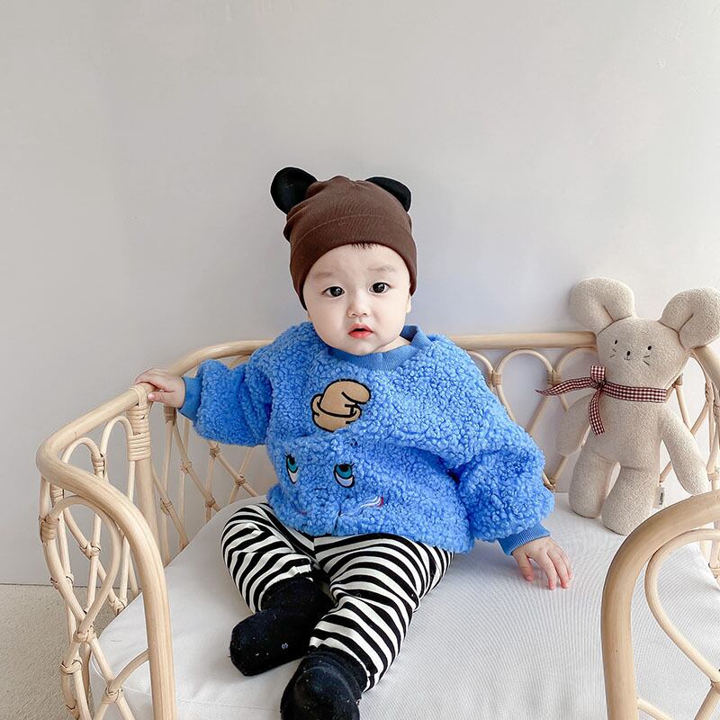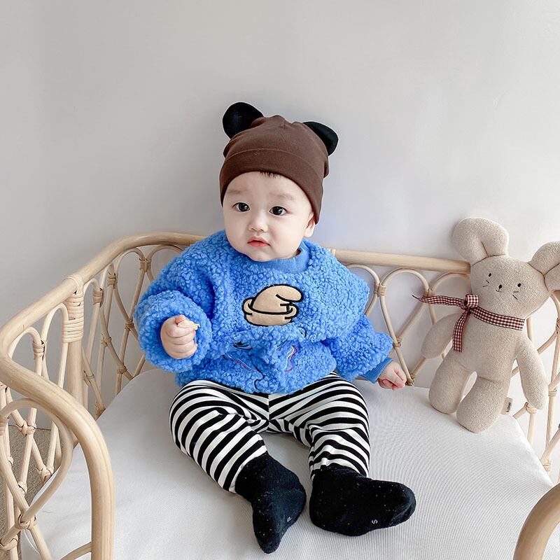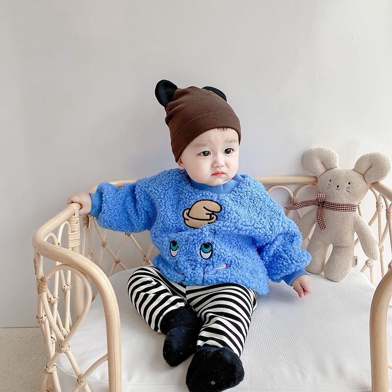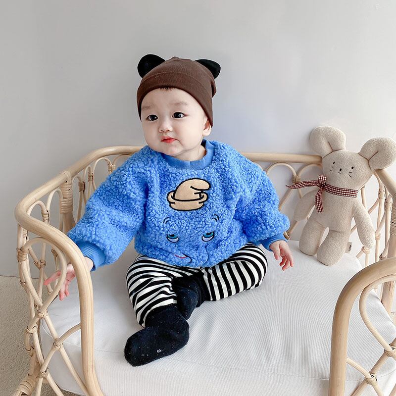 色:ブルーエレファントトップ,黒と白のストライプパンツ