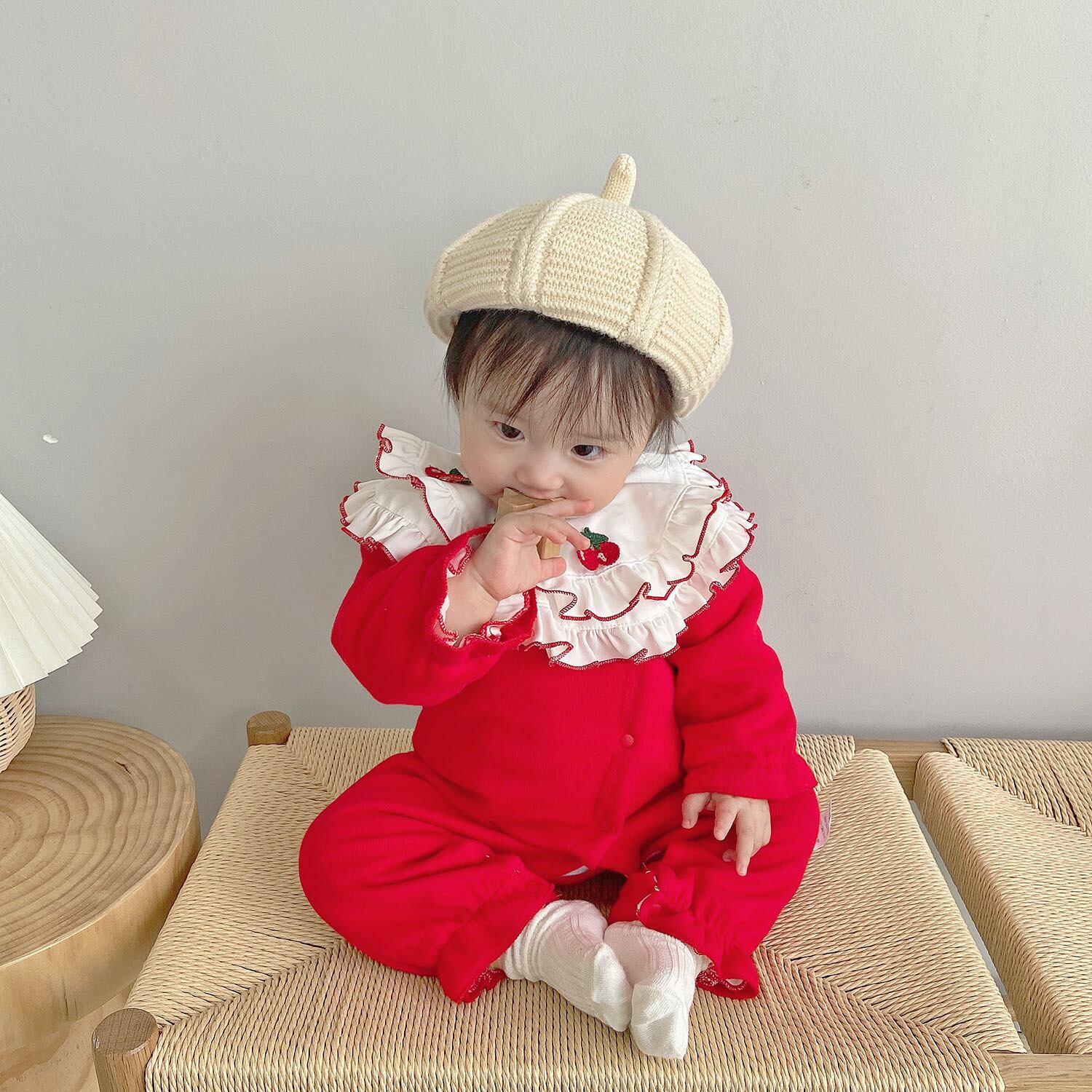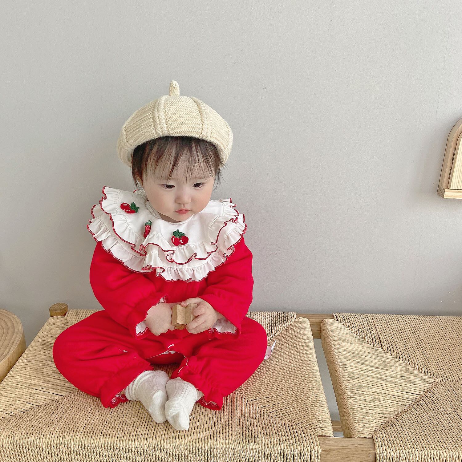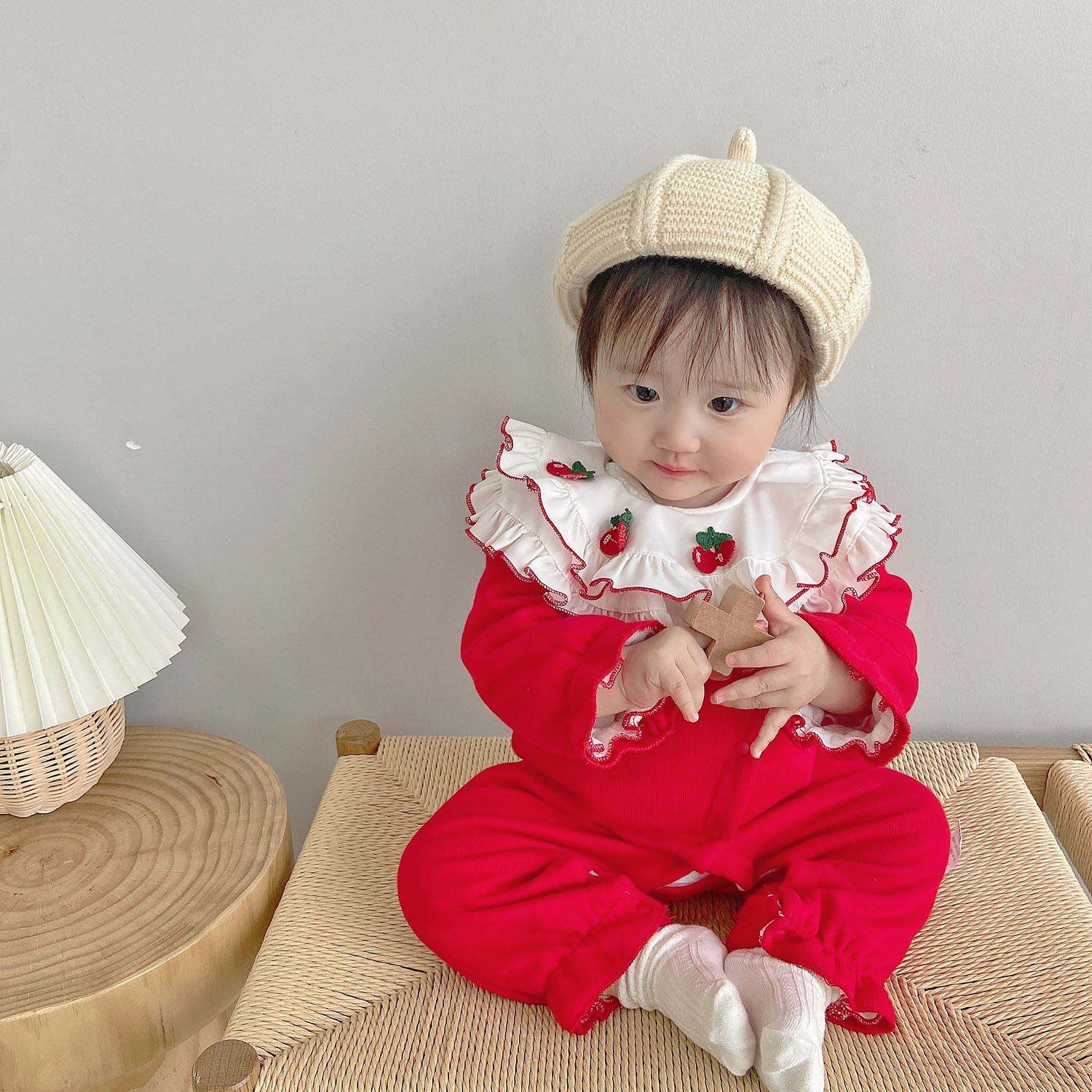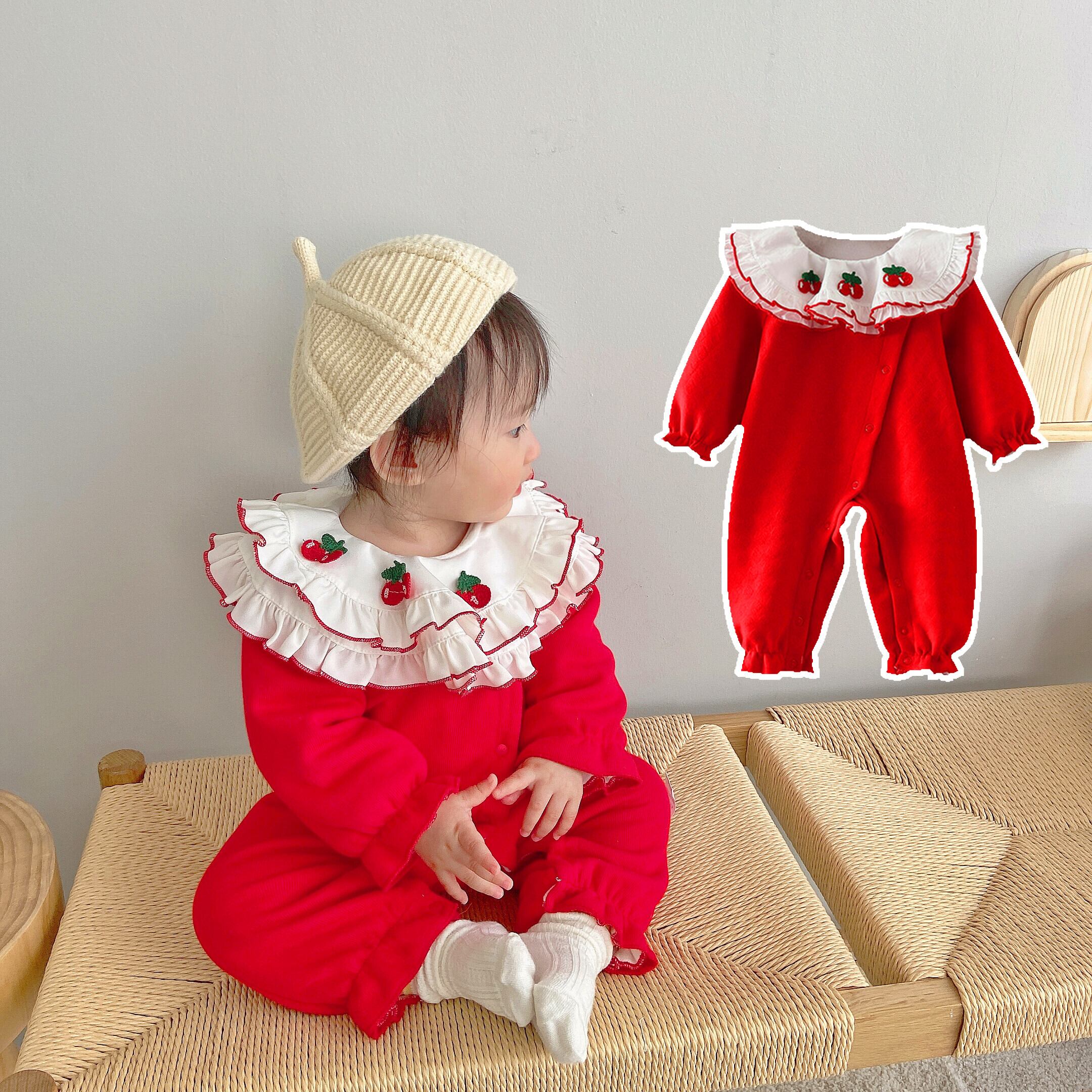 色:温かみのあるチェリーレッドのロンパース