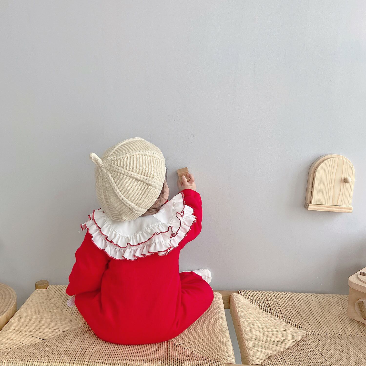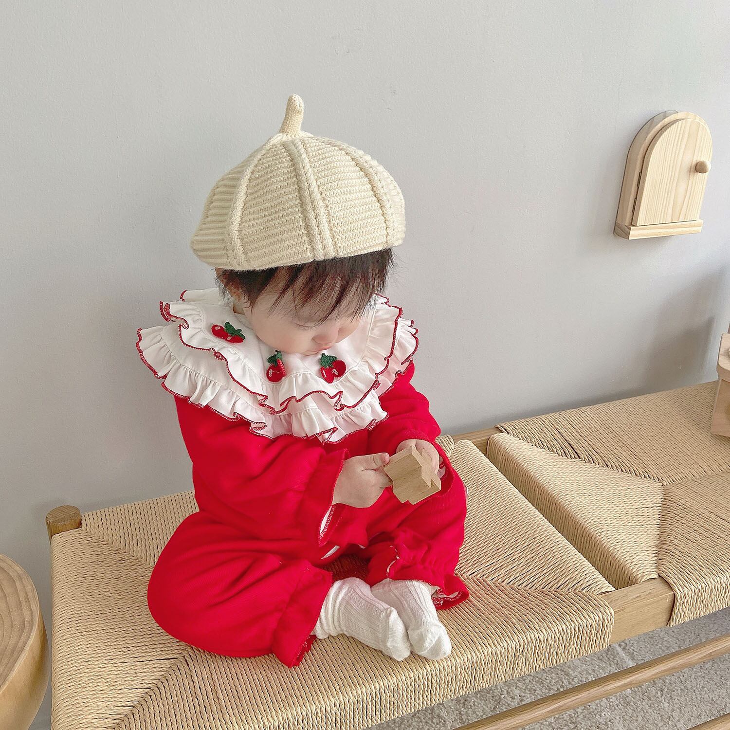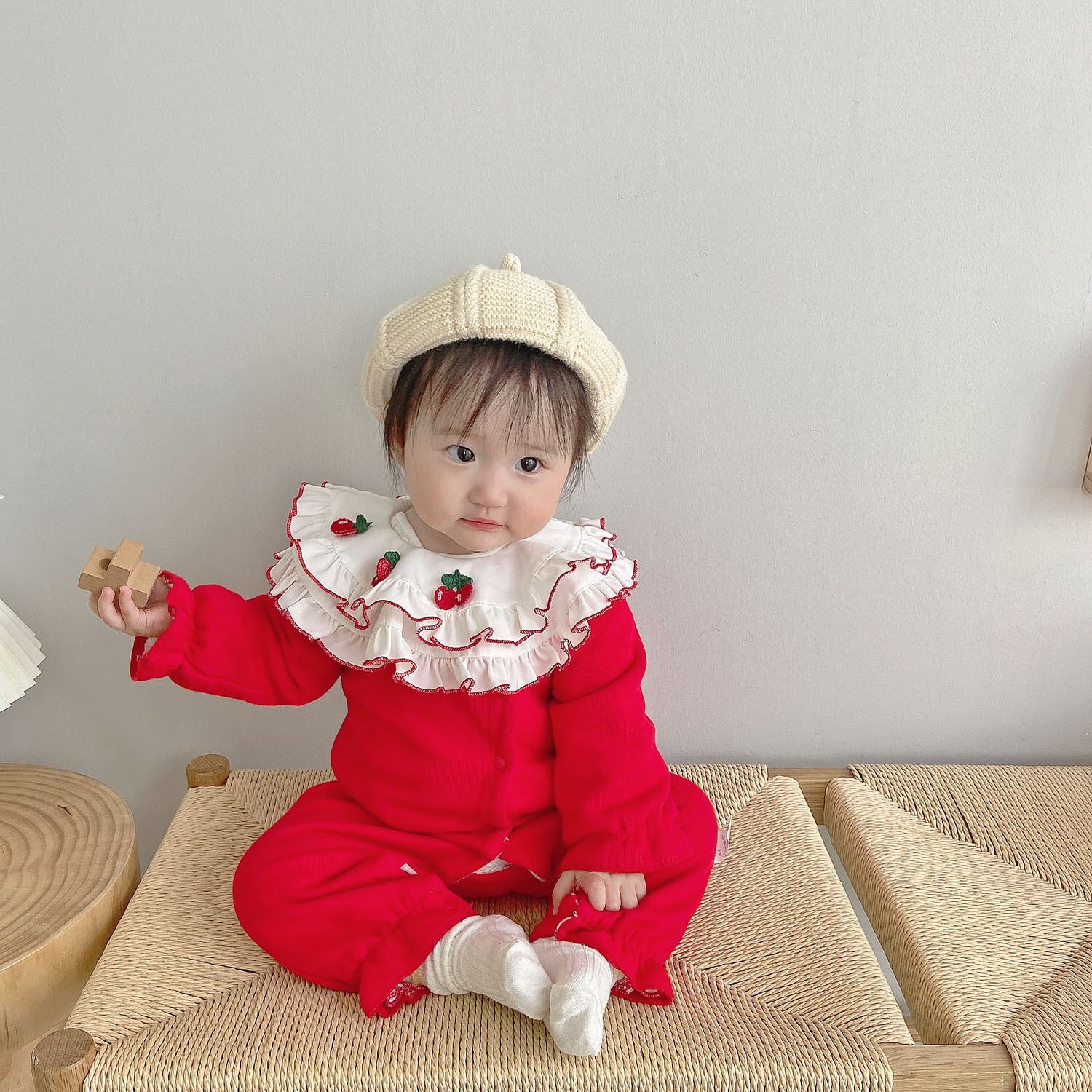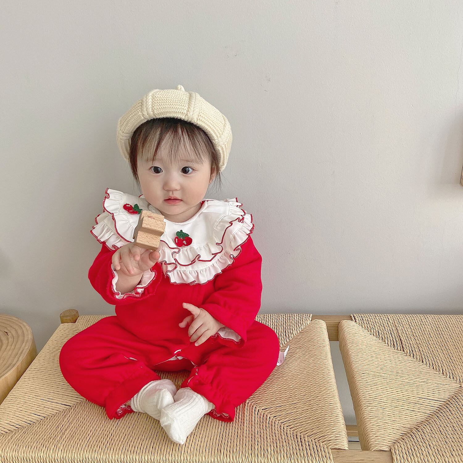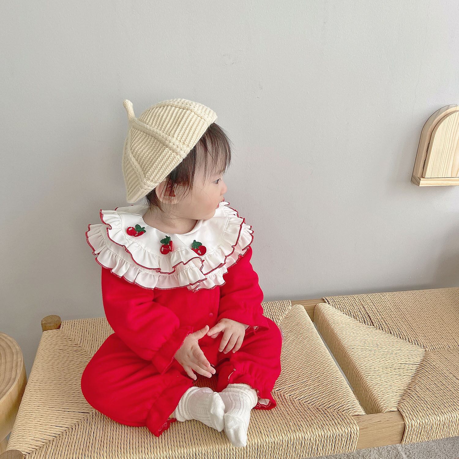 色:温かみのあるチェリーレッドのロンパース