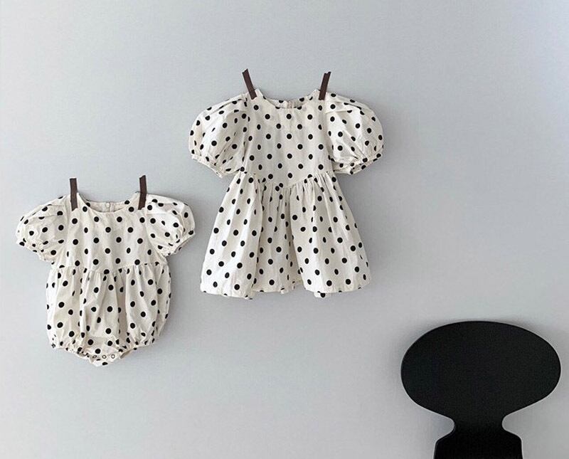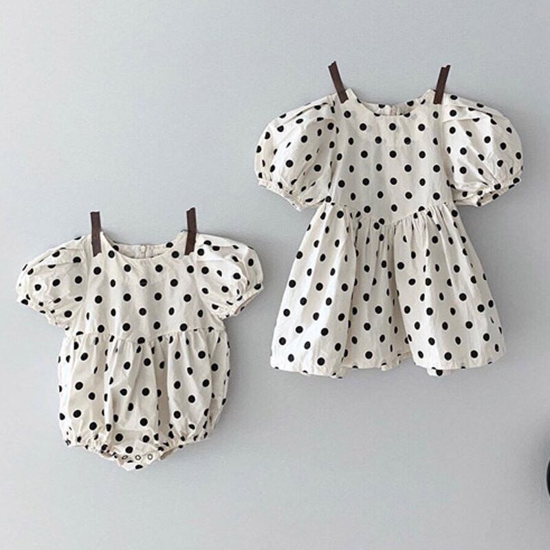 色:シスターポルカドット半袖ロンパース,姉妹水玉ドレス