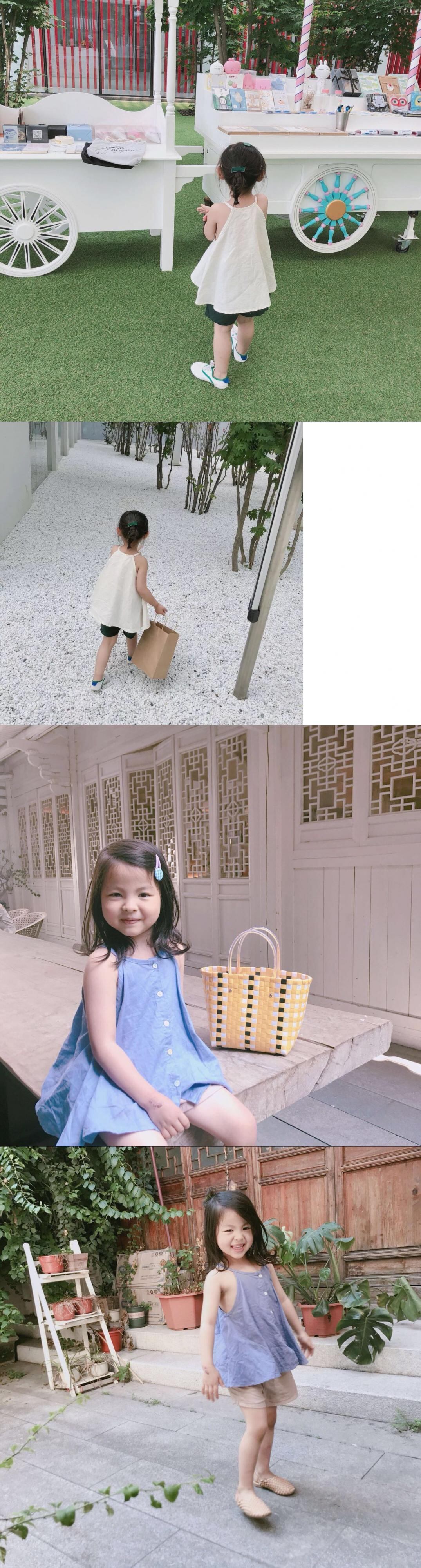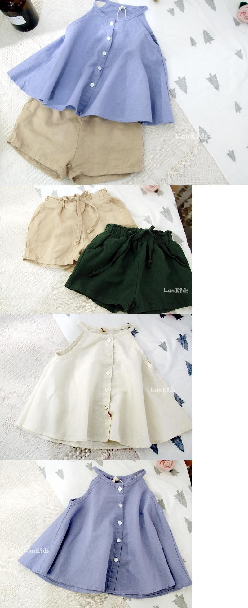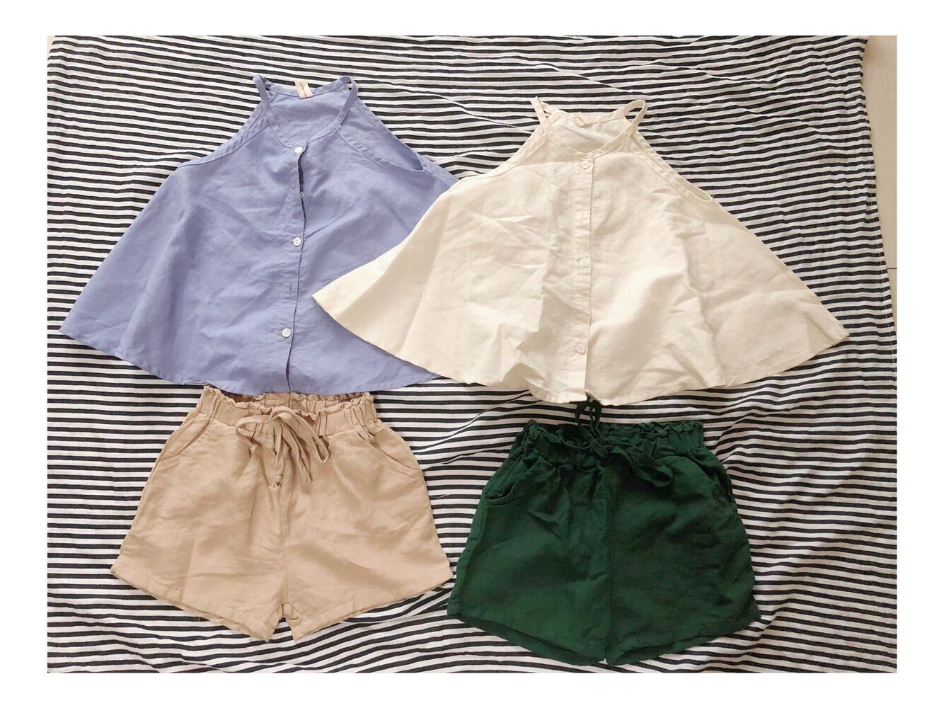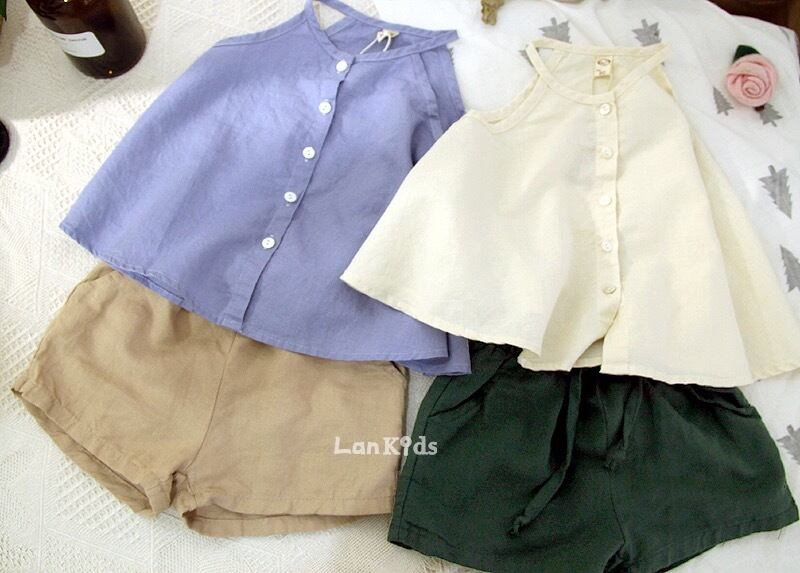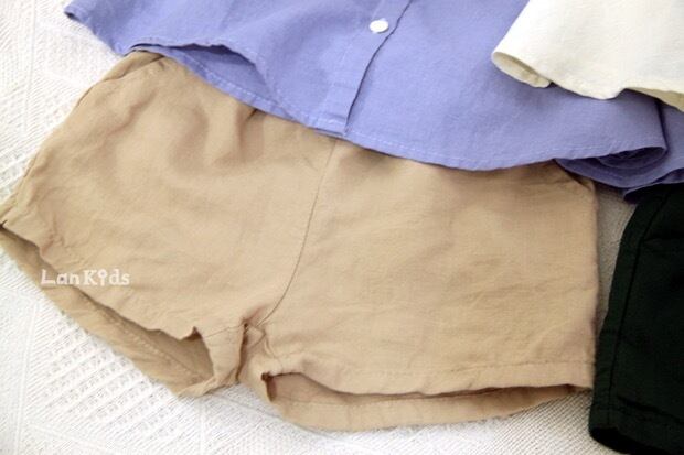 色:紫のサスペンダー,アプリコットショーツ,ダークグリーンのショートパンツ,ベージュのスリング