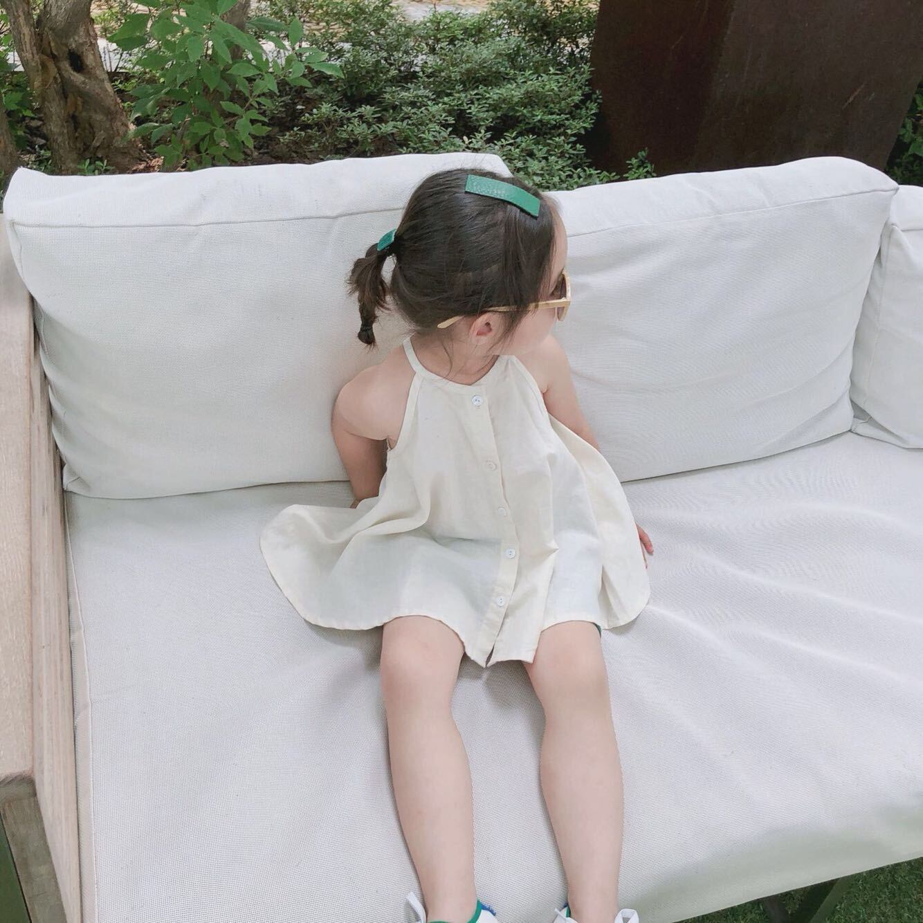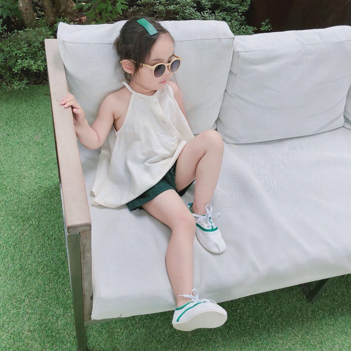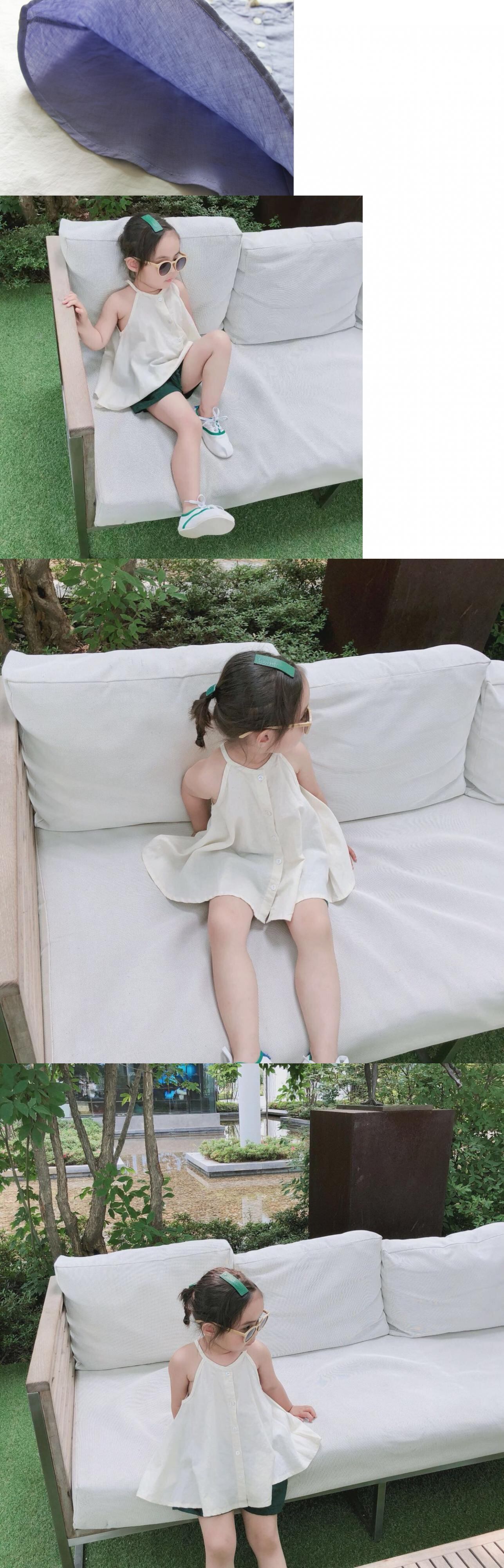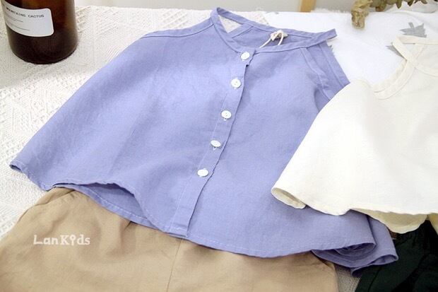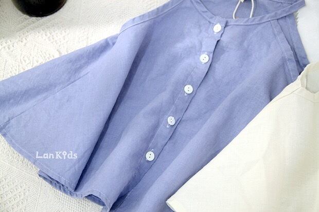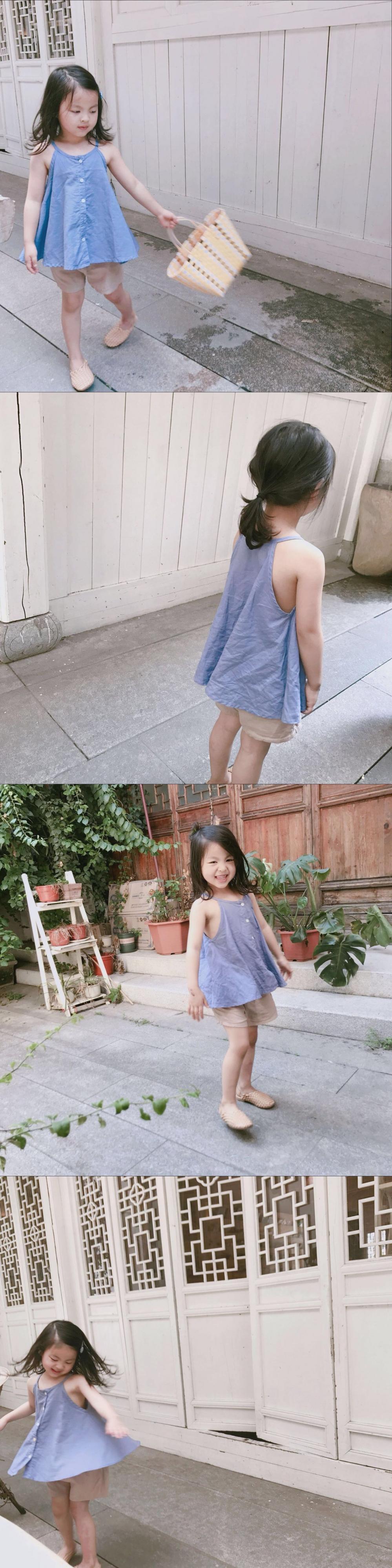 色:紫のサスペンダー,アプリコットショーツ,ダークグリーンのショートパンツ,ベージュのスリング