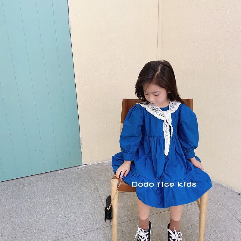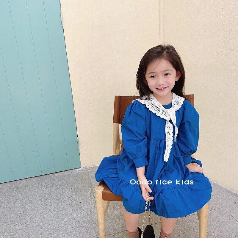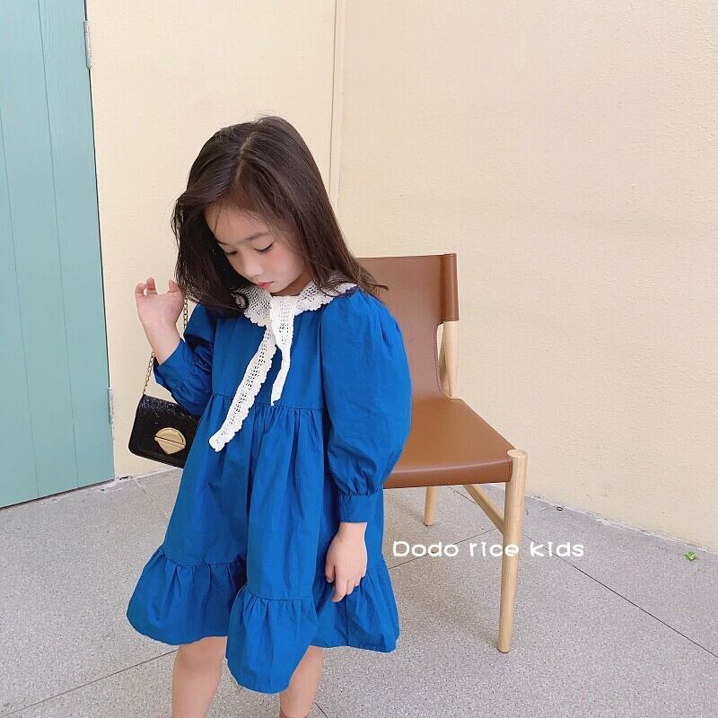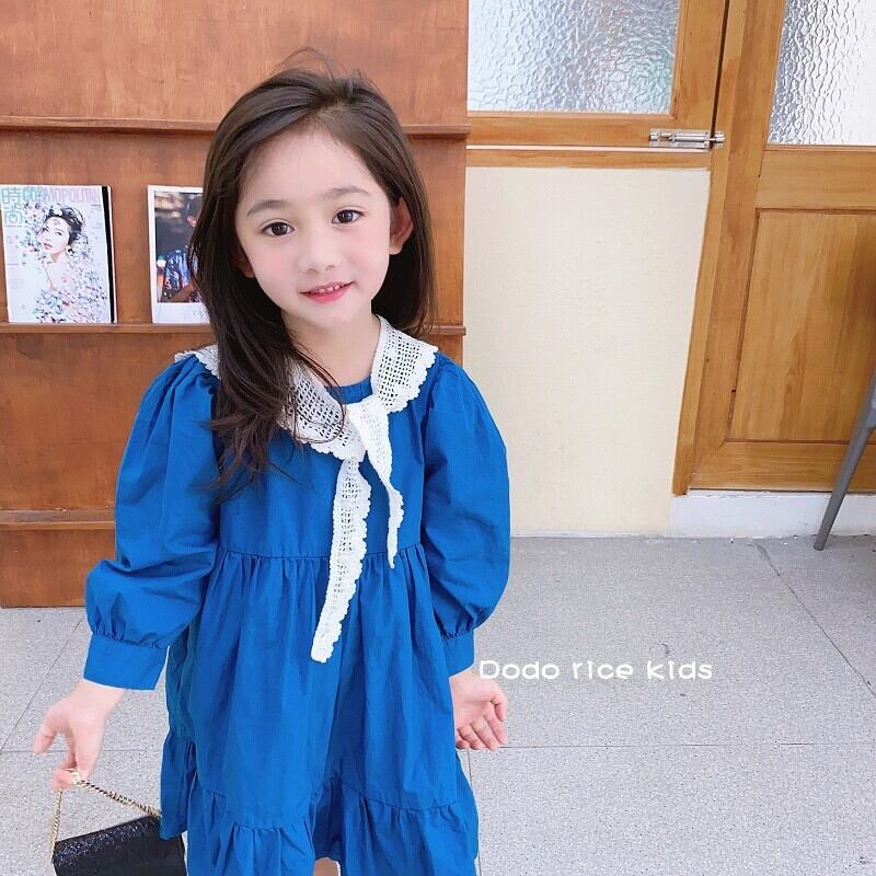 色:レースの襟付きの青いドレス