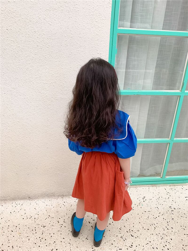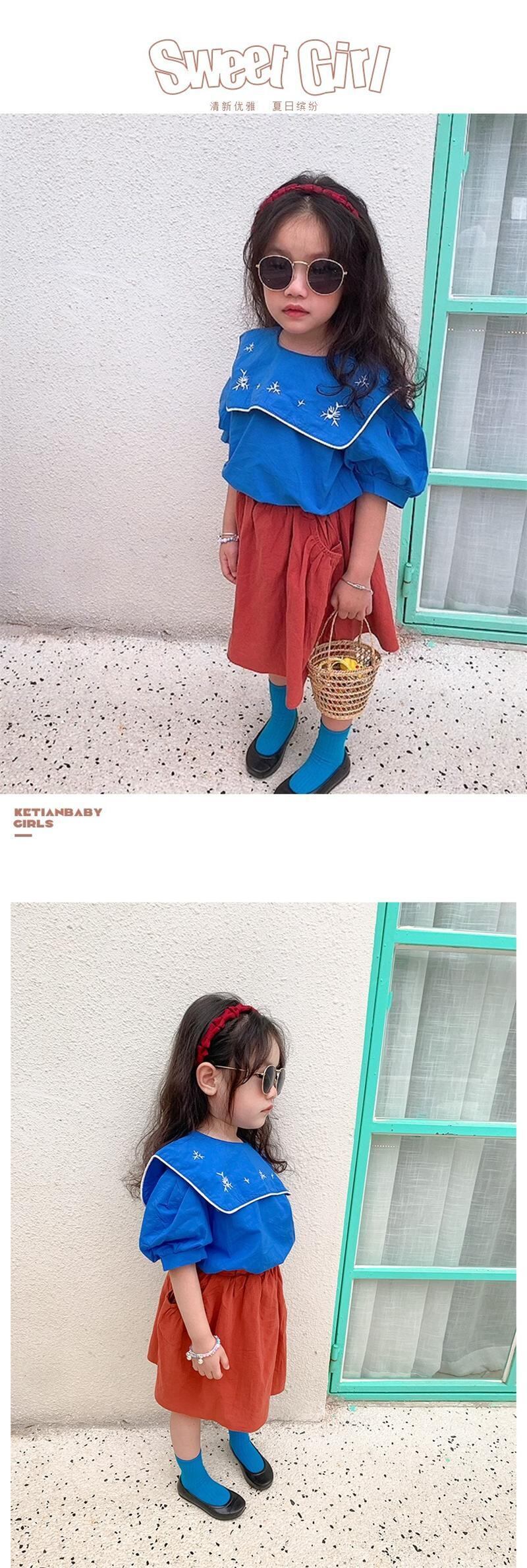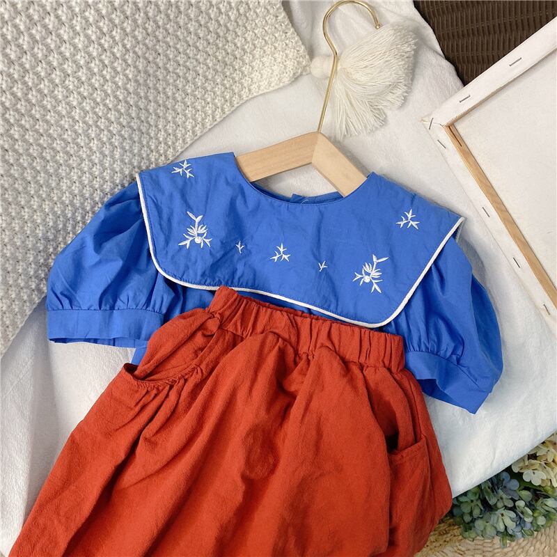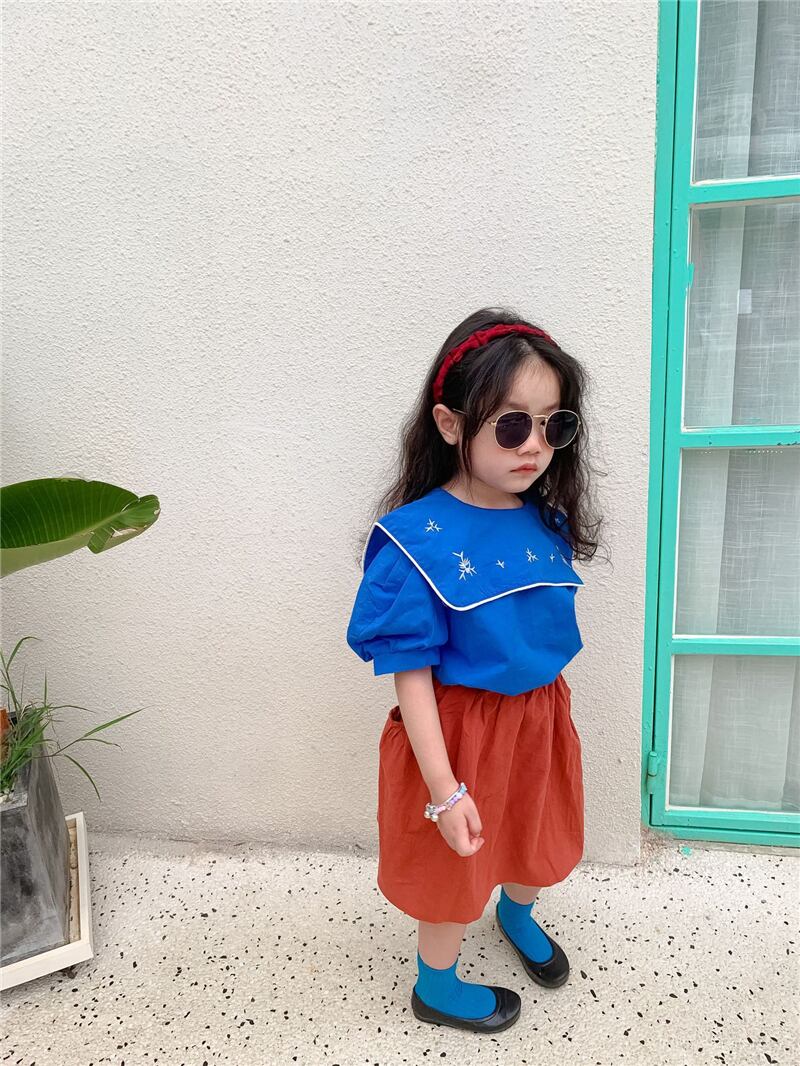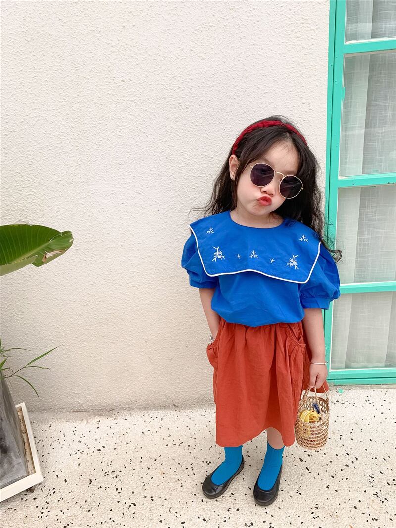 色:LBBネイビーカラー刺繡シャツ(ブルー),LBBネイビーカラー刺繡シャツ(アプリコット),コットンとリネンのスカート(赤),コットンとリネンのスカート(ベージュベージュ)