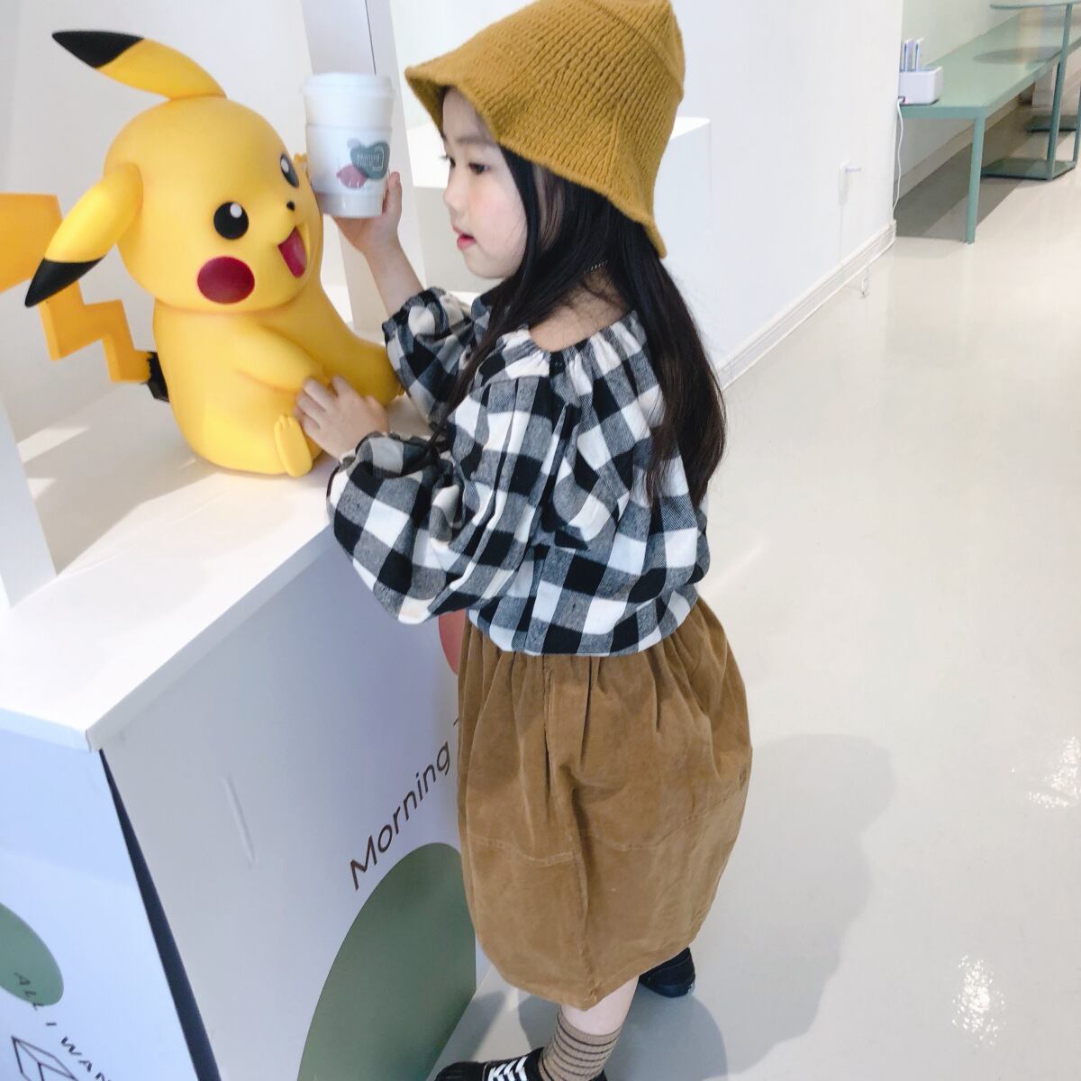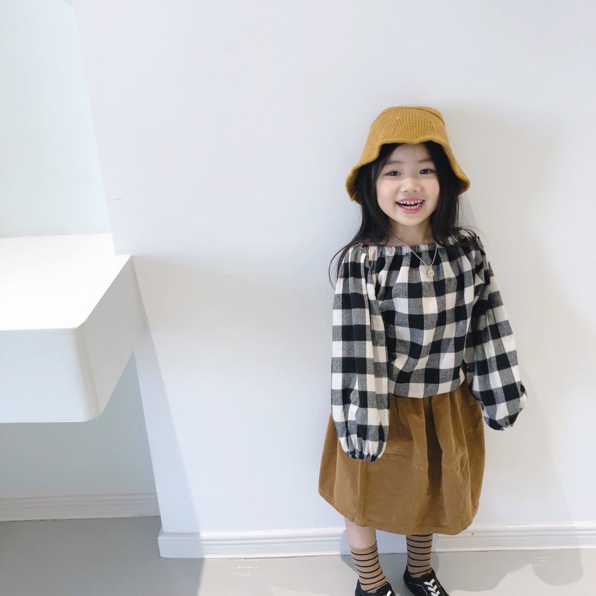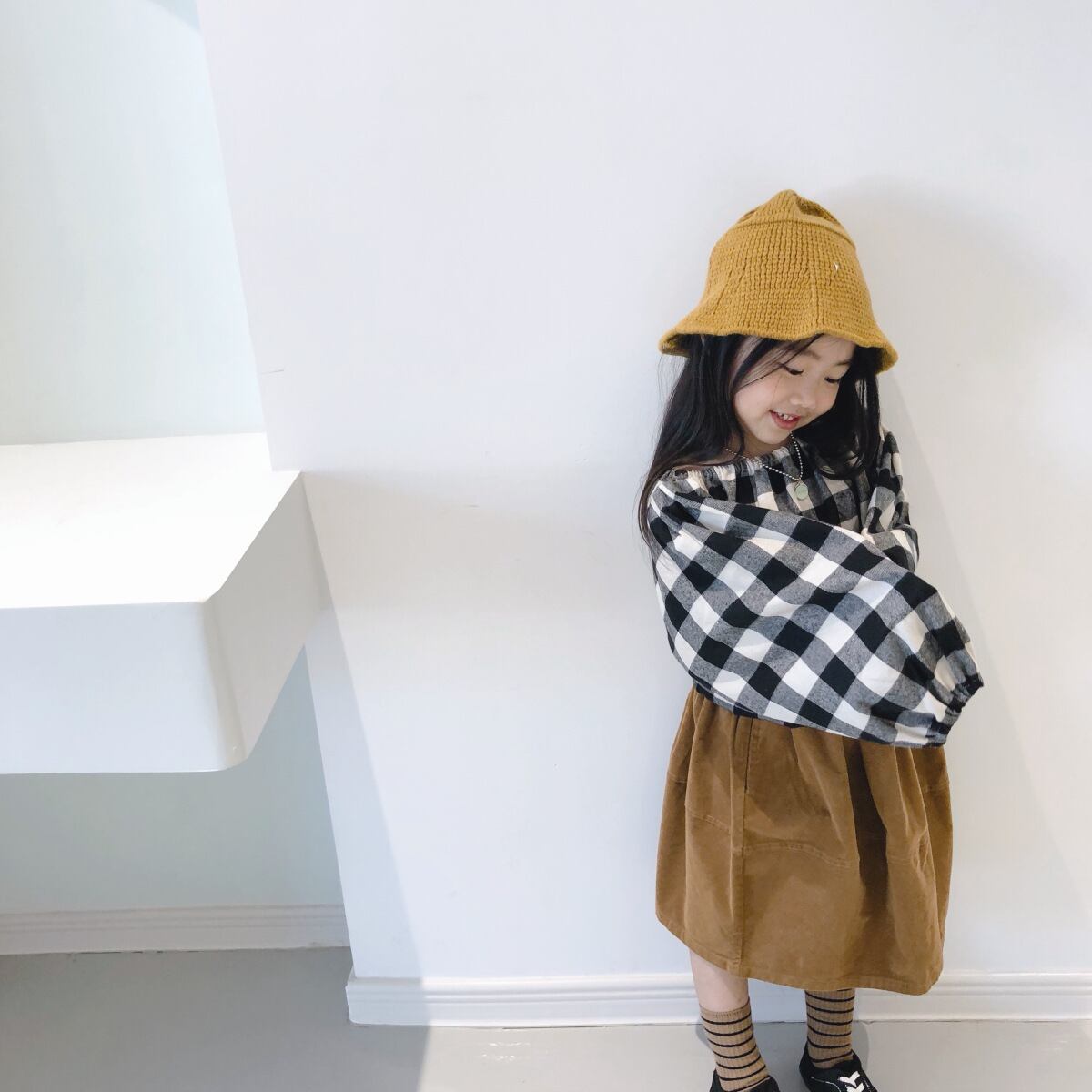 色:黒と白のチェックシャツ,キャラメルコーデュロイスカート
