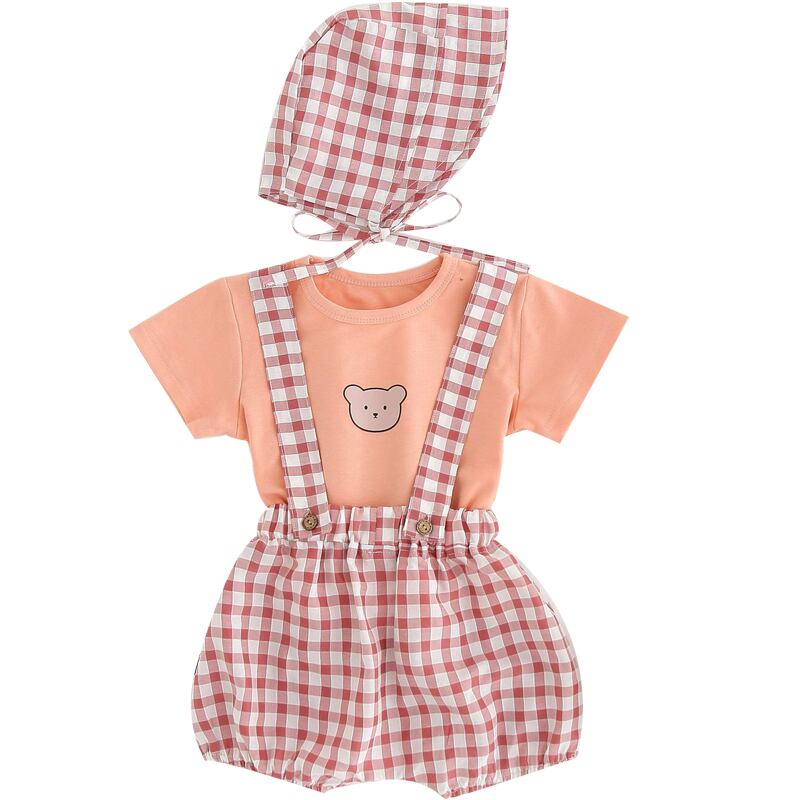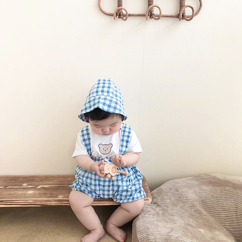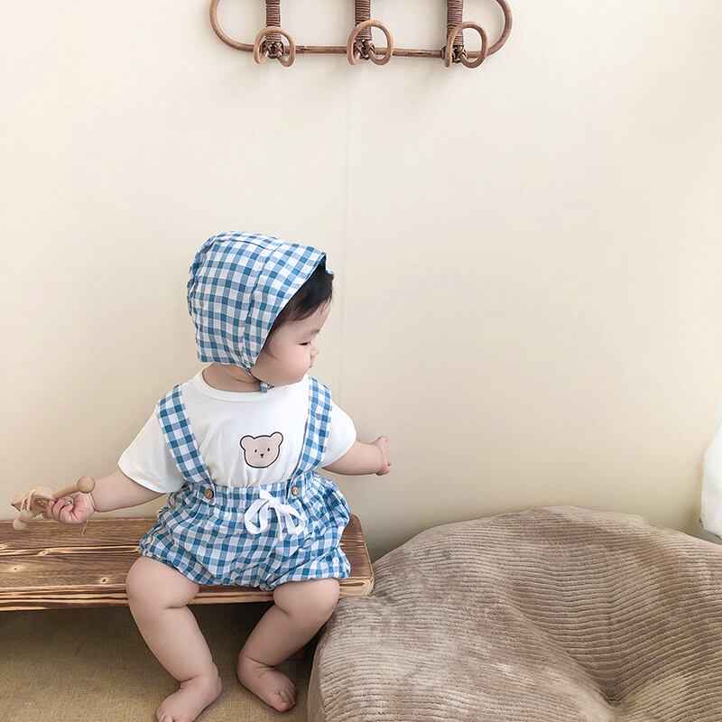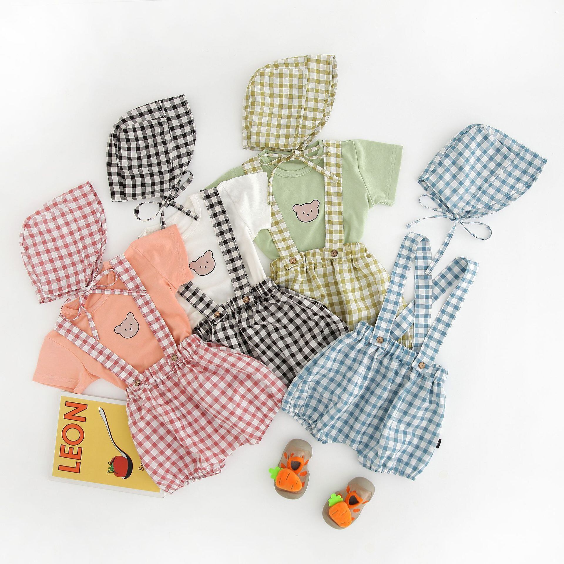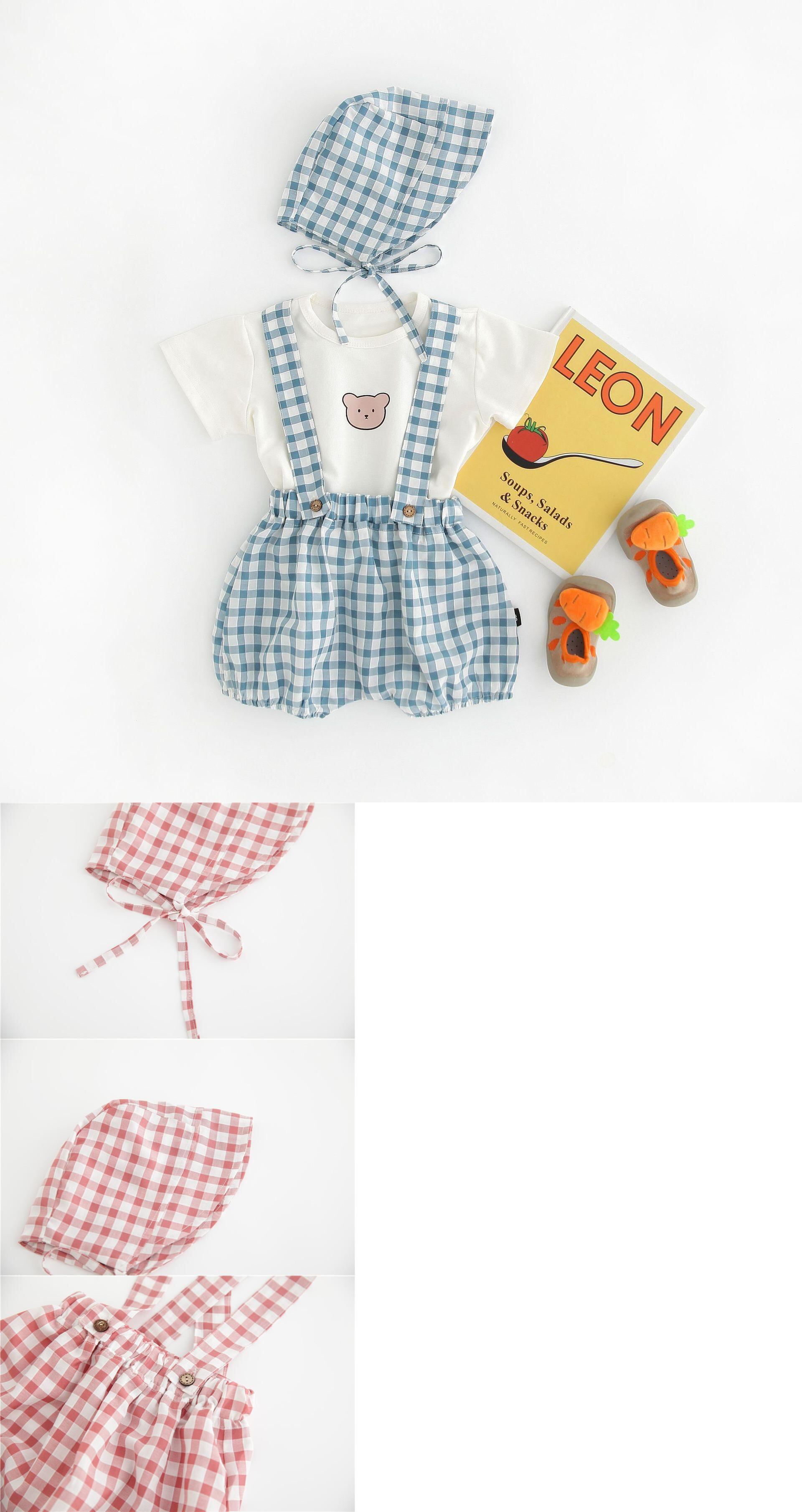 色:白Tシャツ+青チェックオーバーオール+帽子,ピンクのTシャツ+赤いチェックのオーバーオール+帽子,グリーンTシャツ+グリーンチェックオーバーオール+帽子,白のTシャツ+黒のチェック柄のオーバーオール+帽子