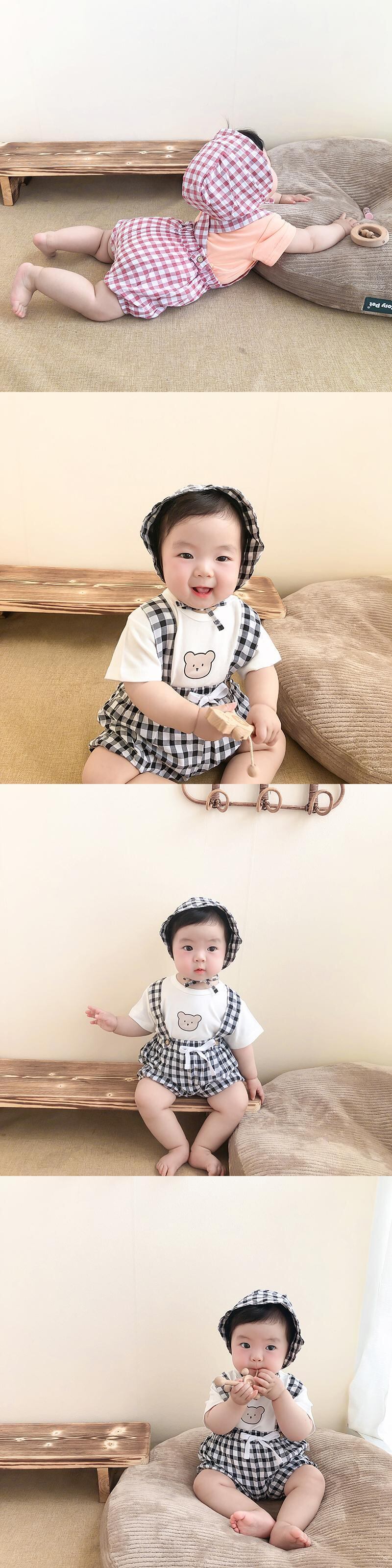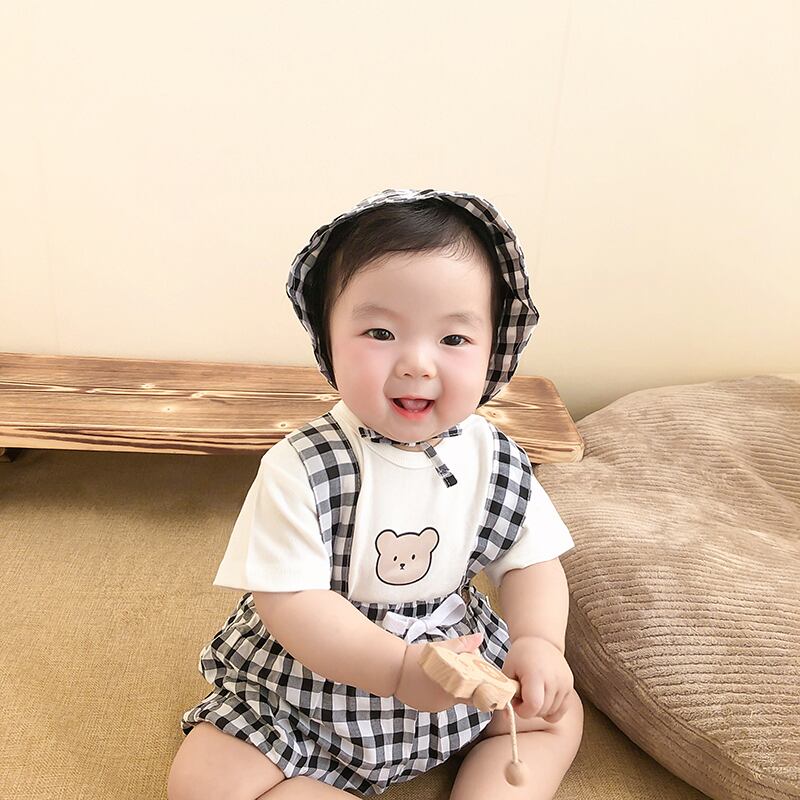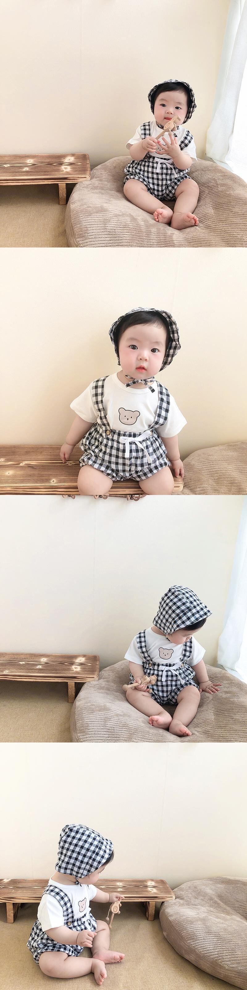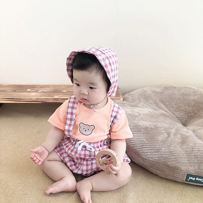 色:白Tシャツ+青チェックオーバーオール+帽子,ピンクのTシャツ+赤いチェックのオーバーオール+帽子,グリーンTシャツ+グリーンチェックオーバーオール+帽子,白のTシャツ+黒のチェック柄のオーバーオール+帽子