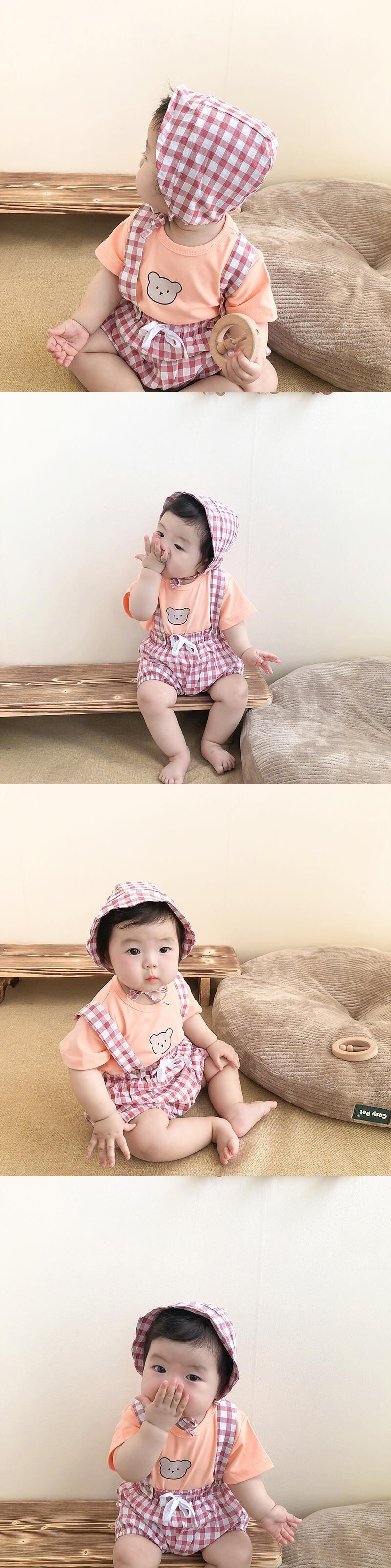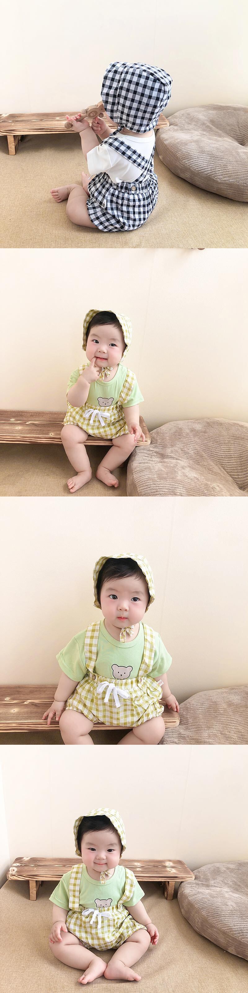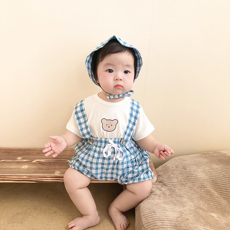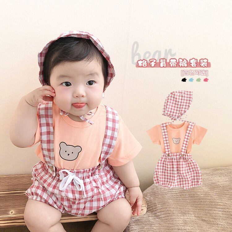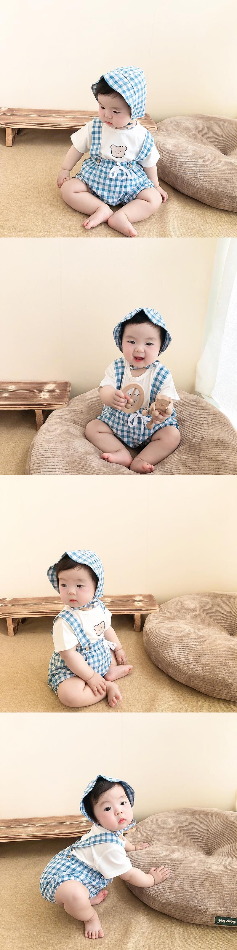 色:白Tシャツ+青チェックオーバーオール+帽子,ピンクのTシャツ+赤いチェックのオーバーオール+帽子,グリーンTシャツ+グリーンチェックオーバーオール+帽子,白のTシャツ+黒のチェック柄のオーバーオール+帽子