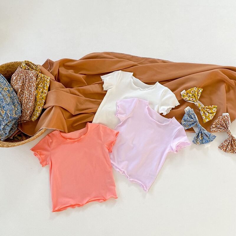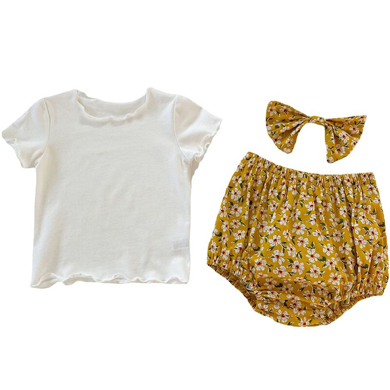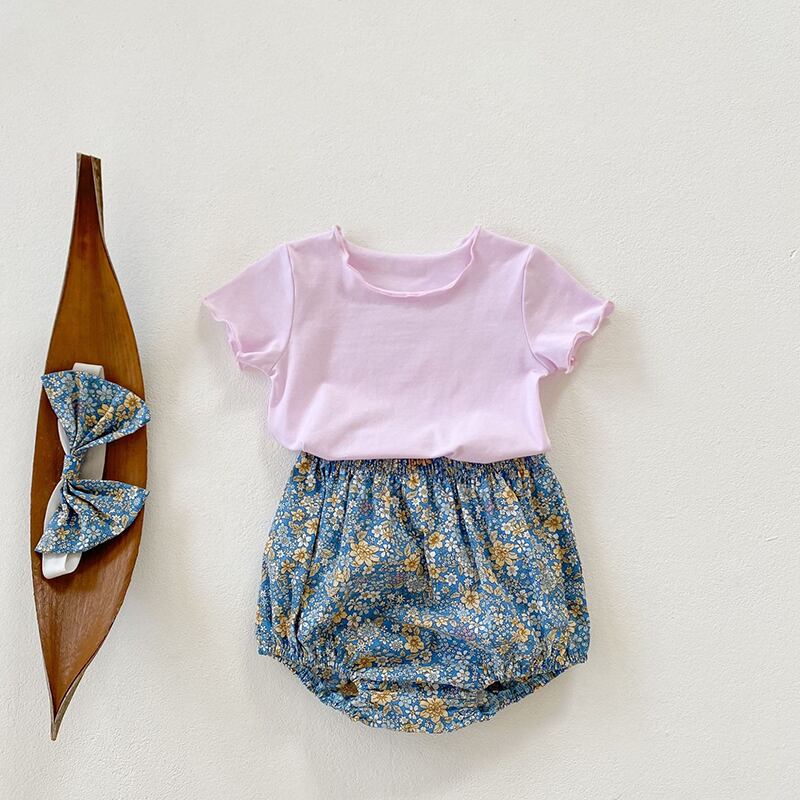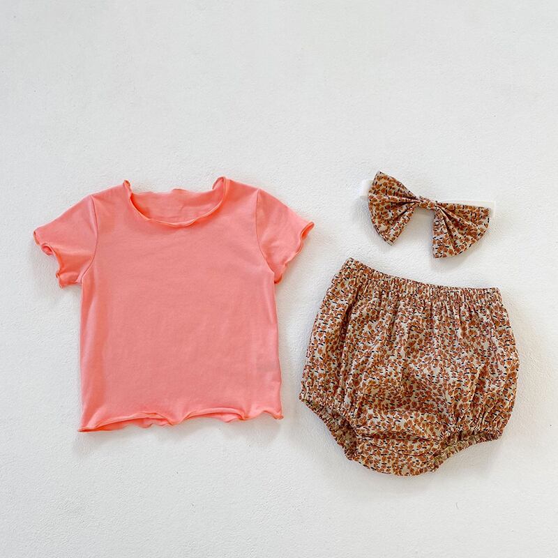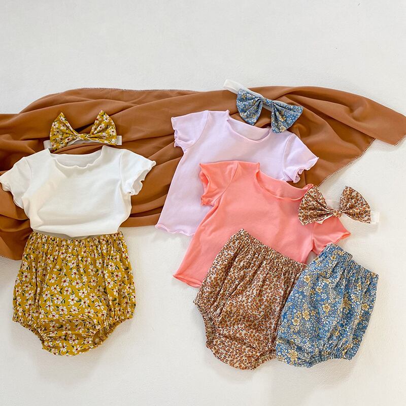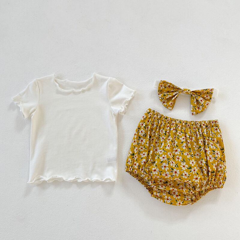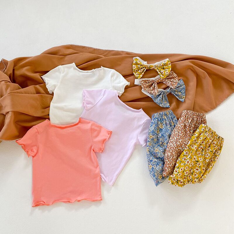 スタイルサマーソリッド カラーTシャツ フローラルショーツ ヘアバンド 夏物 ブルマー ヘアアクセサリー 花柄 ソリッドカラー 5/26 mi0977426478941