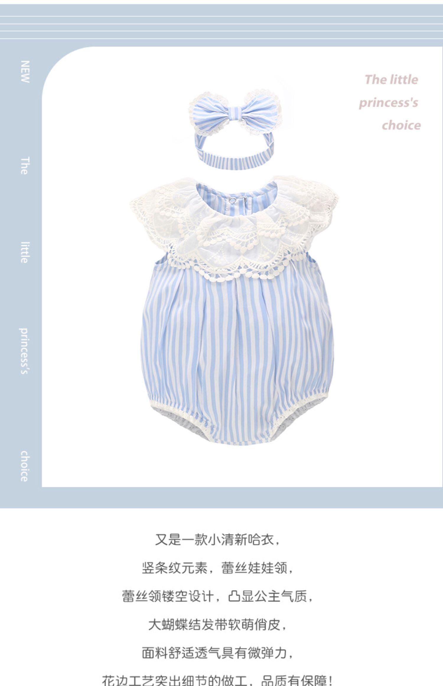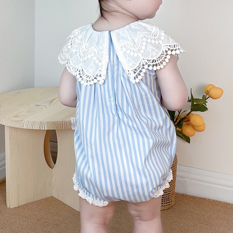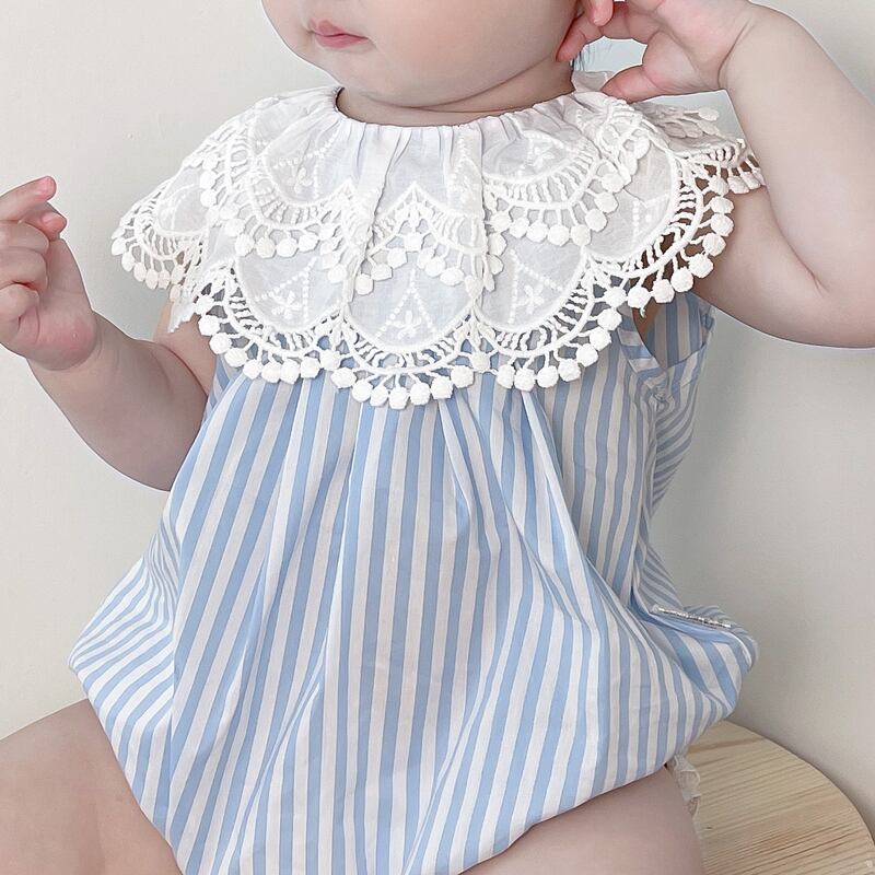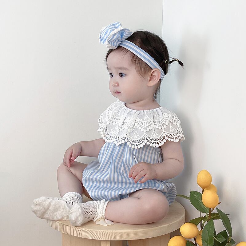 スタイルサマーレースカラーブルーホワイトストライプ薄手トライアングルロンパース オールインワン ヘアバンド 夏物 5/26 mi0941961422383