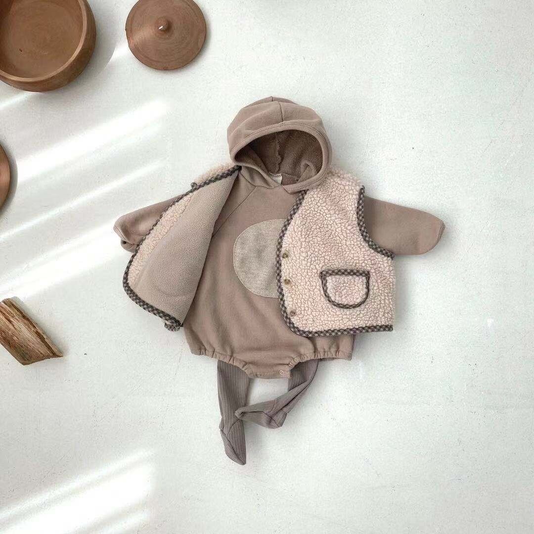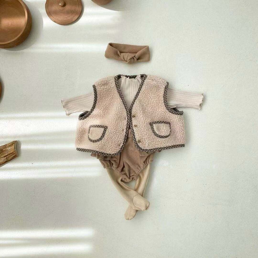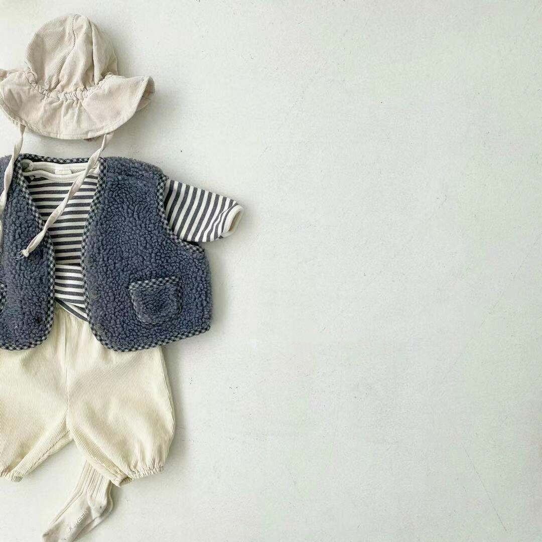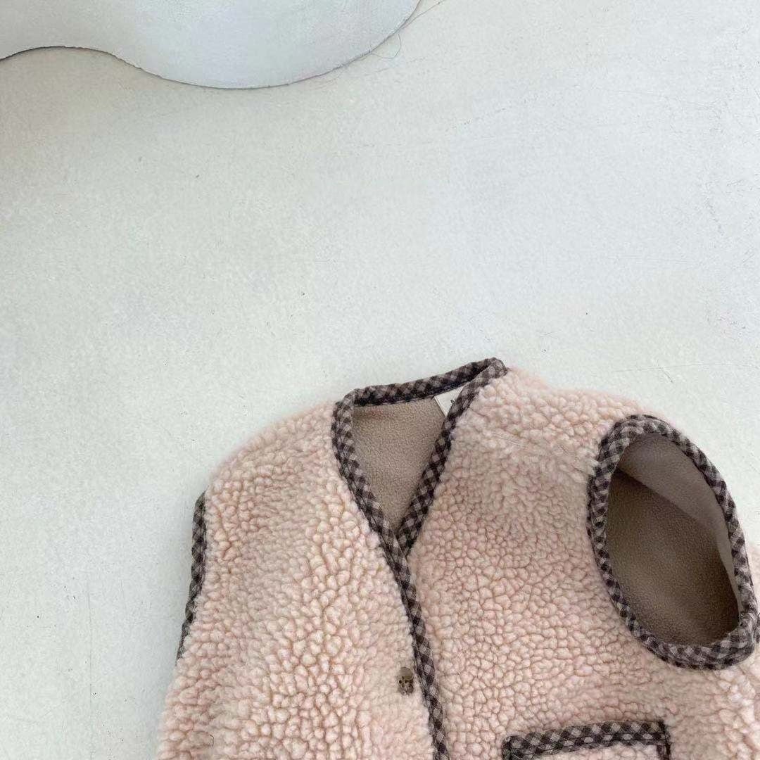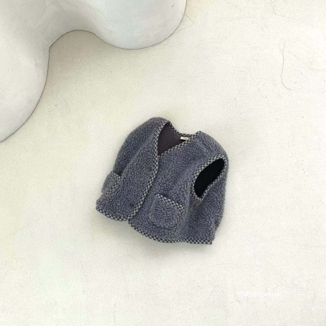 色:チェック柄のエッジングとデニムブルーのベスト,ラティスエッジングとディープライスベスト