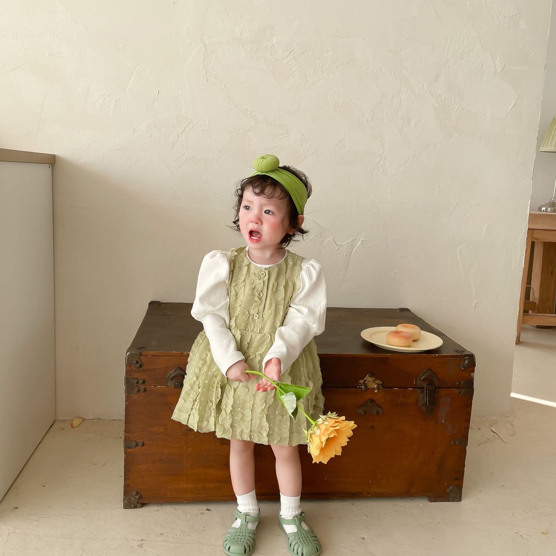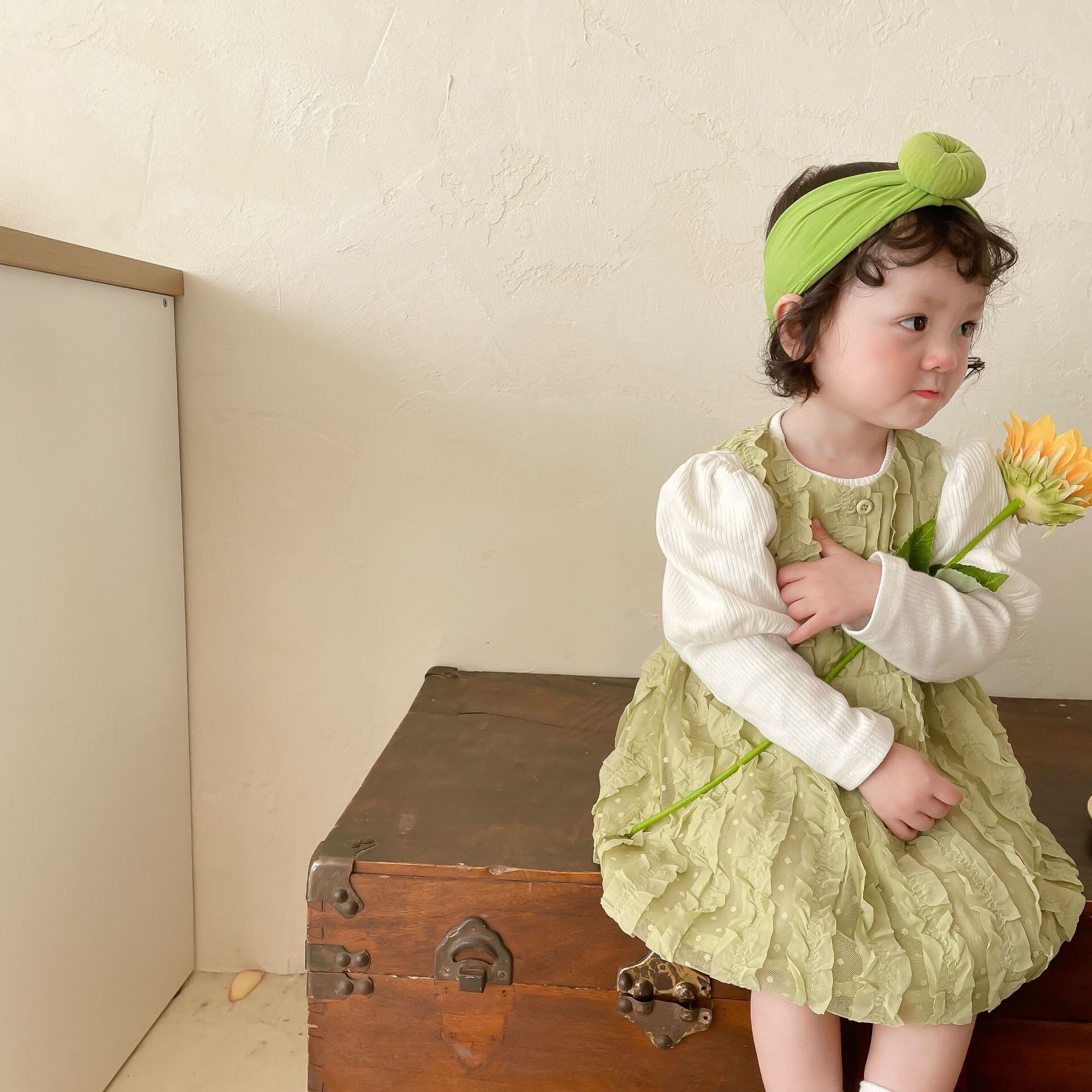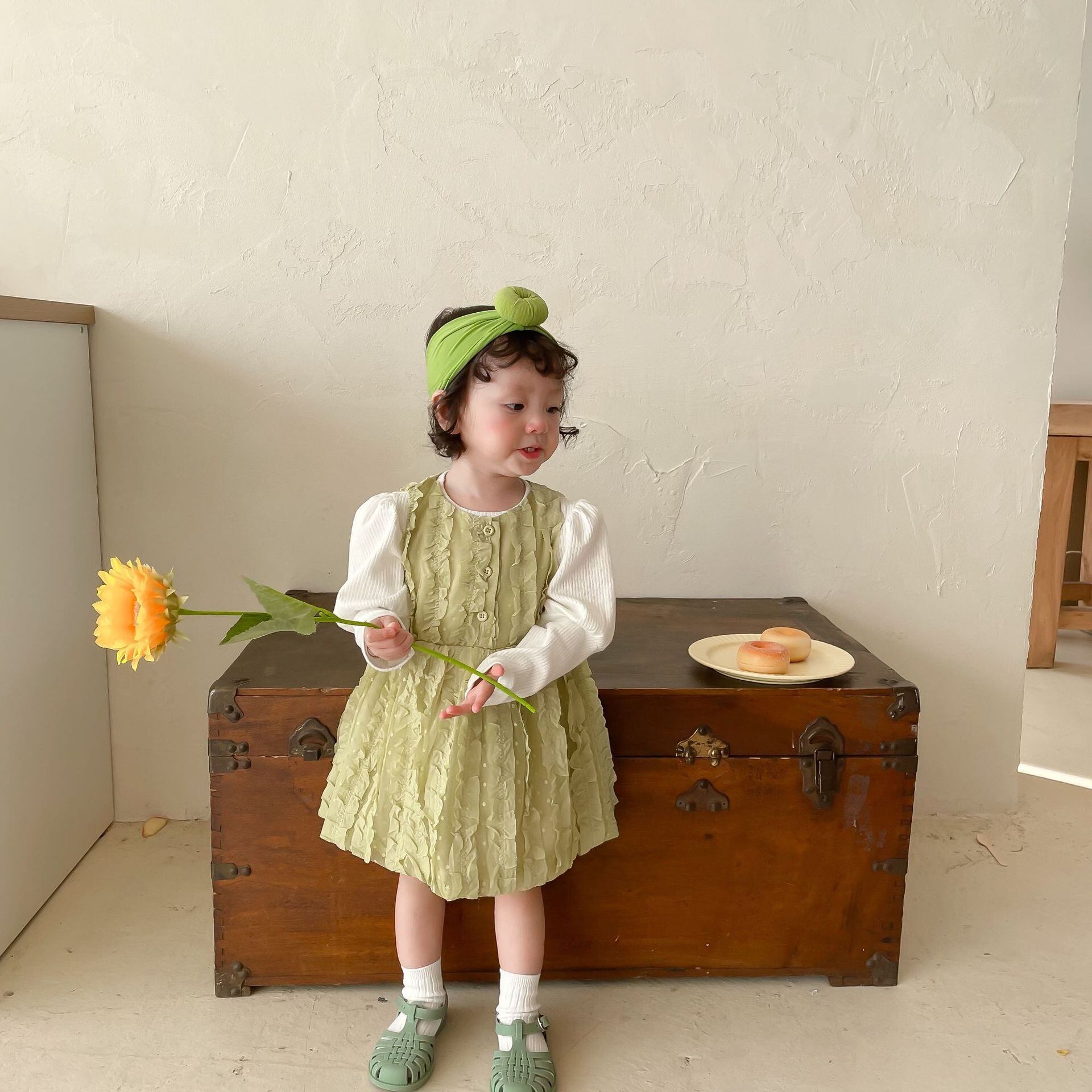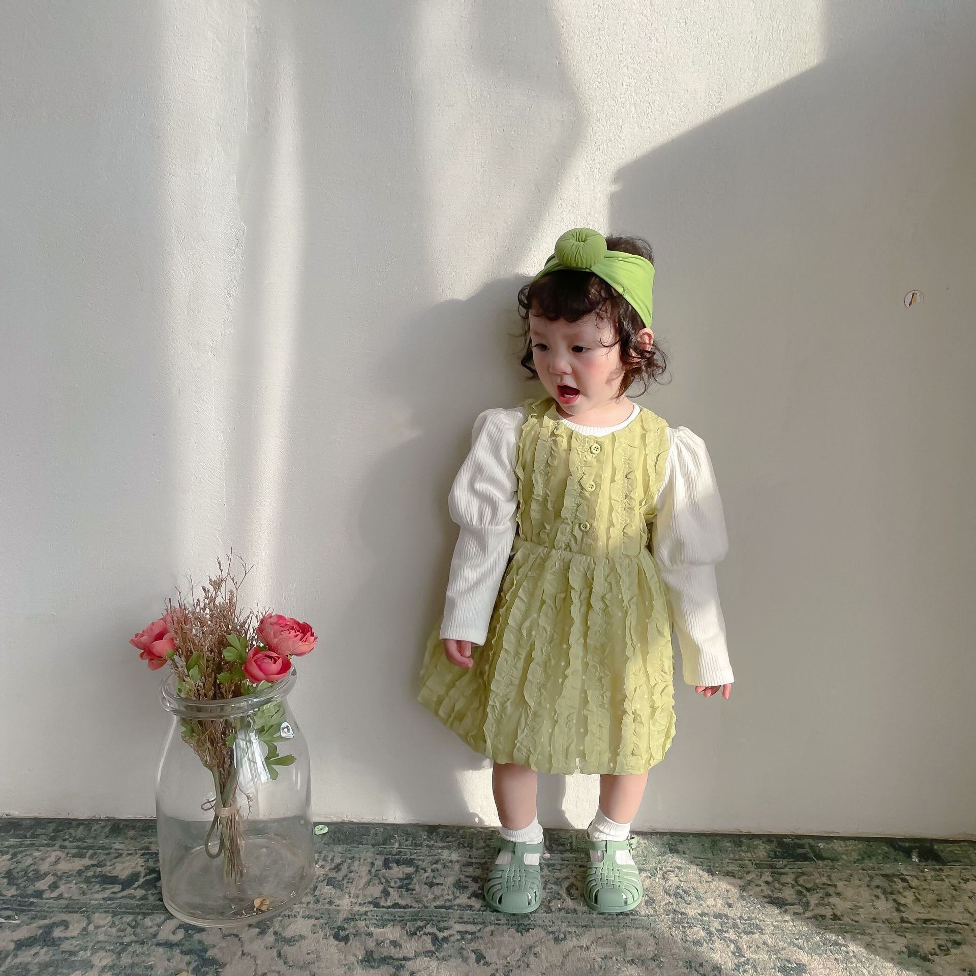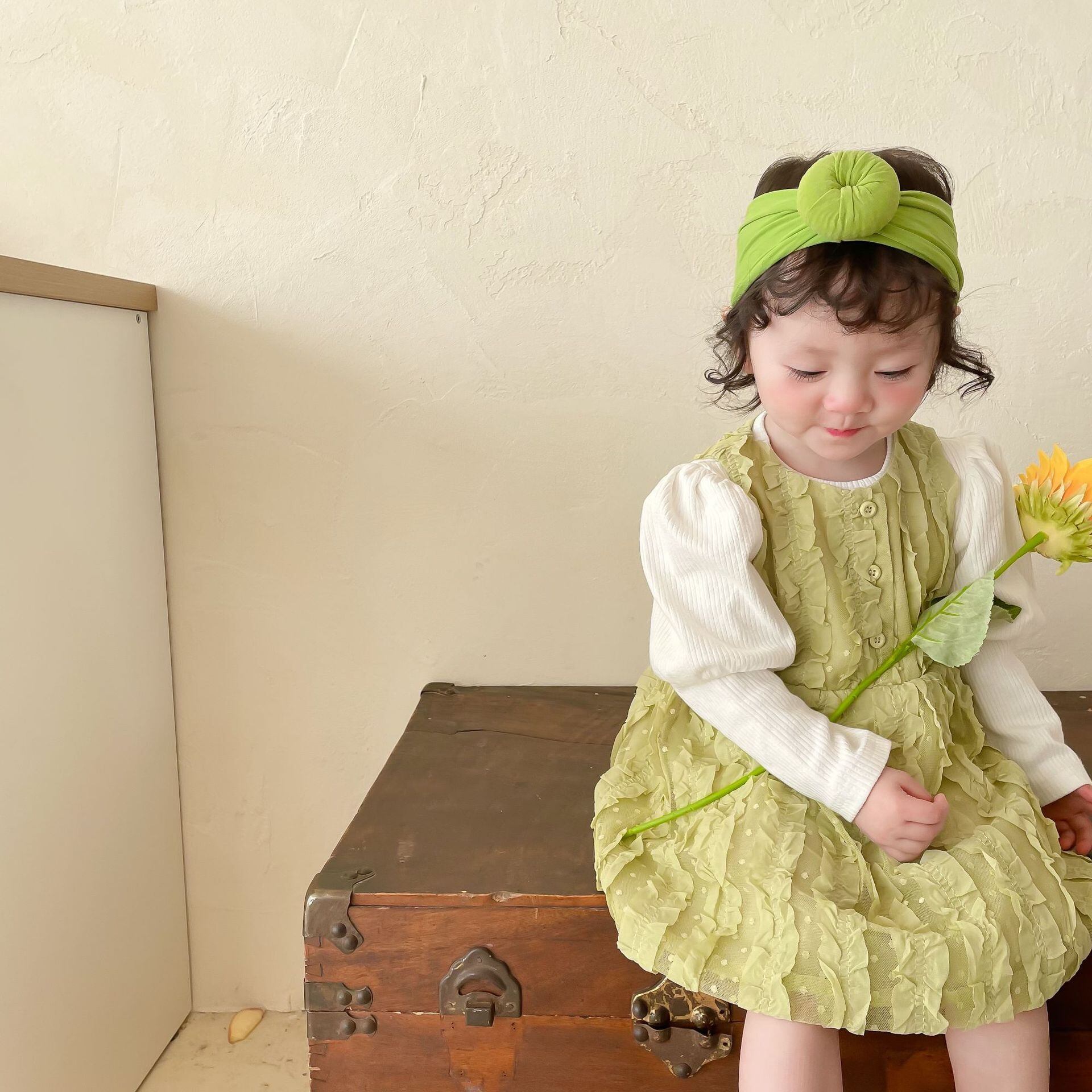 色:同じ段落のヘアバンド,ホワイトボトミングシャツ,緑のスカート
