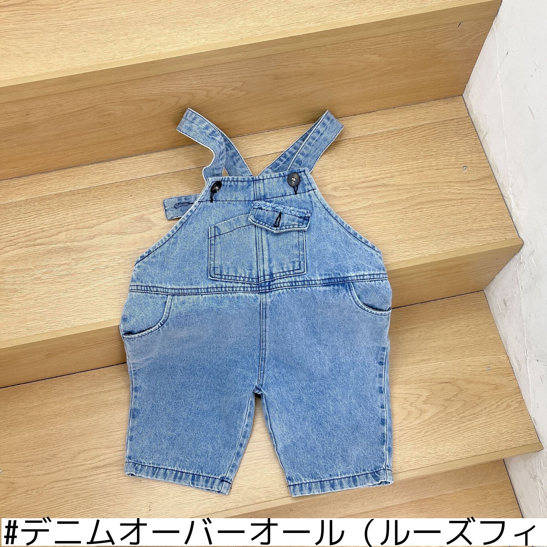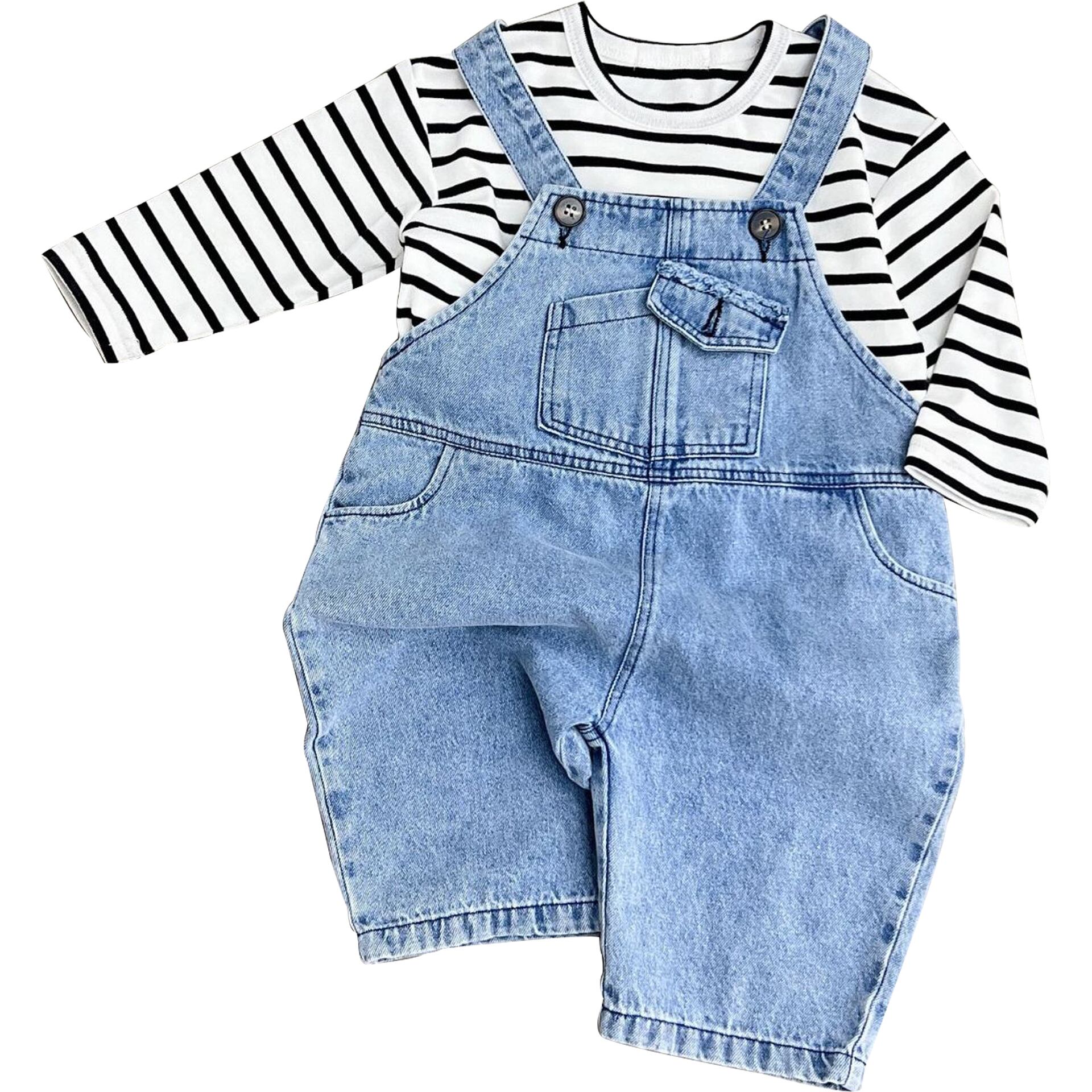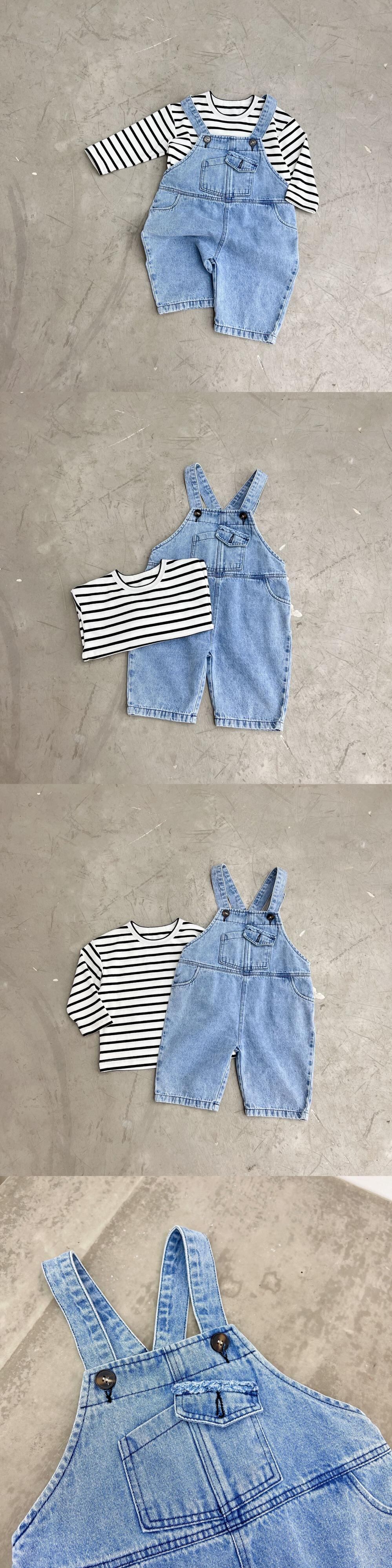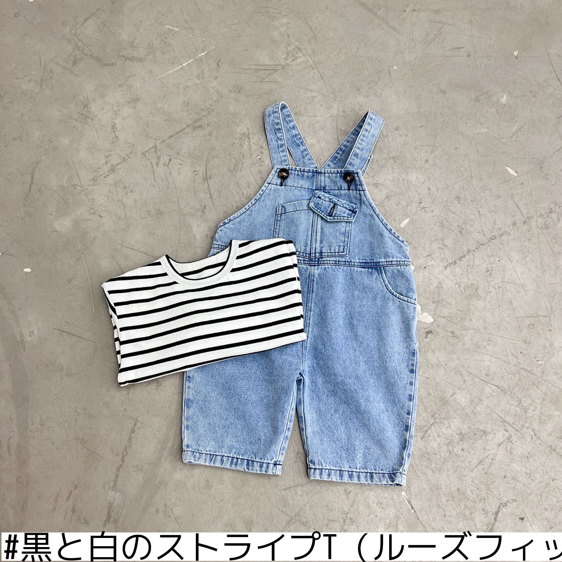 色:デニムオーバーオール(ルーズフィット),黒と白のストライプT(ルーズフィット)