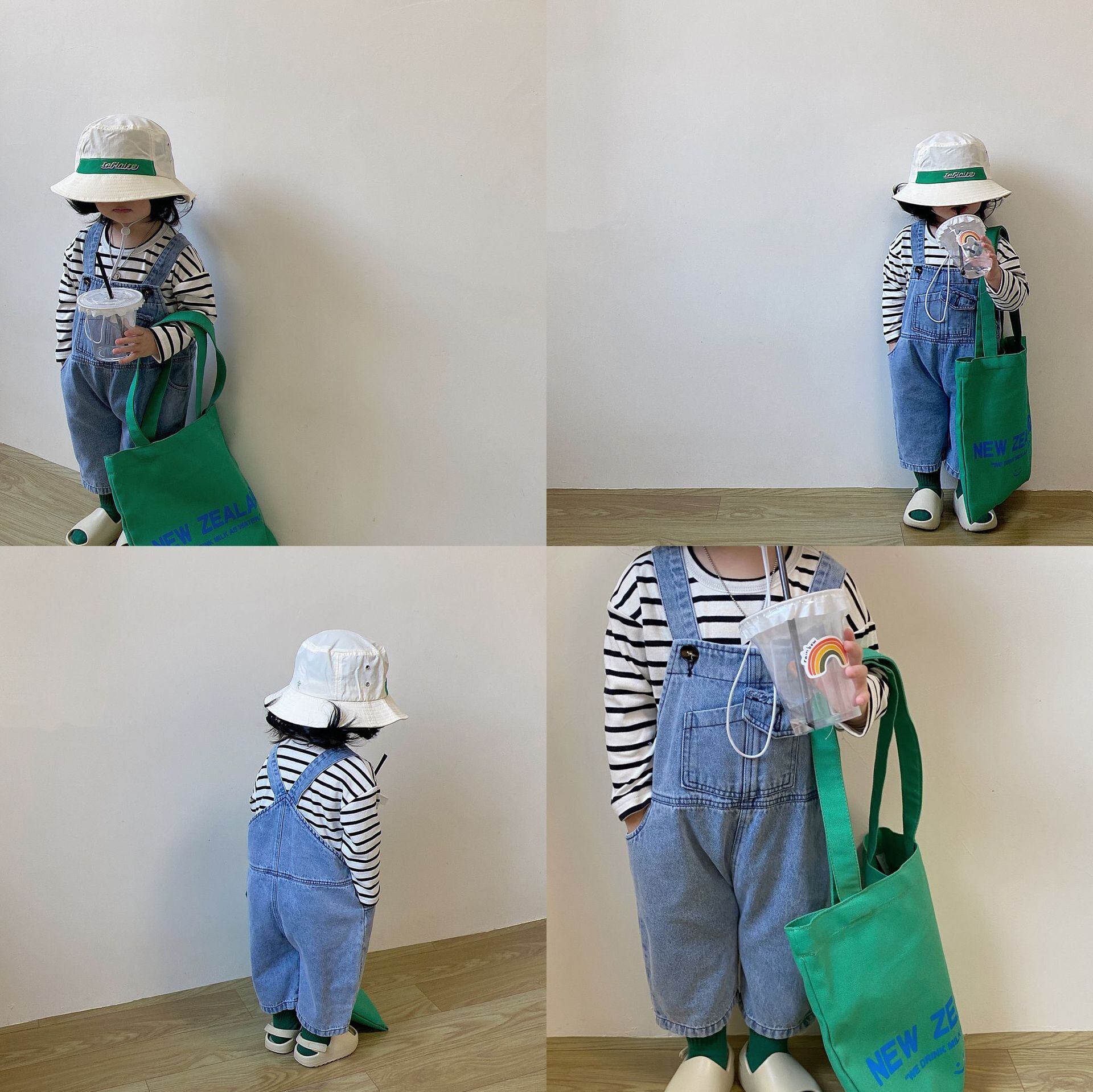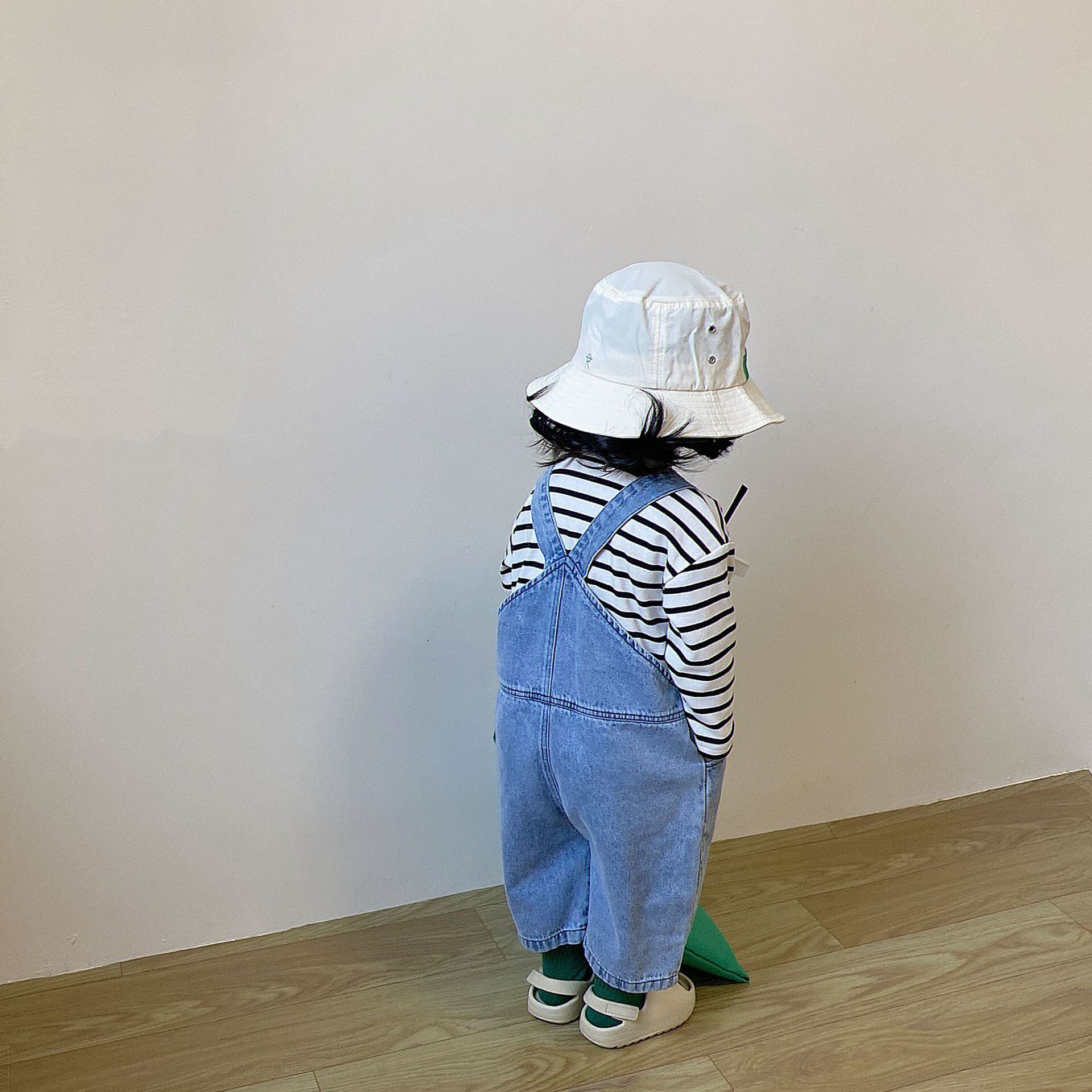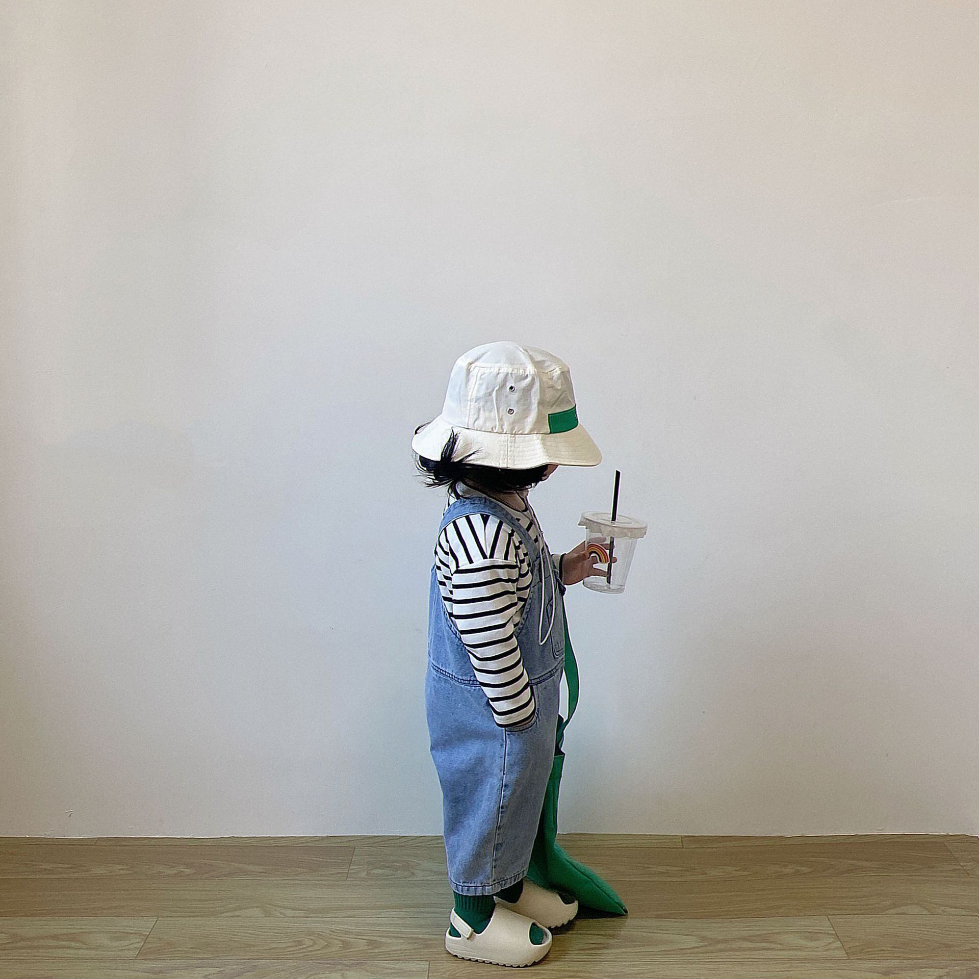 色:デニムオーバーオール(ルーズフィット),黒と白のストライプT(ルーズフィット)
