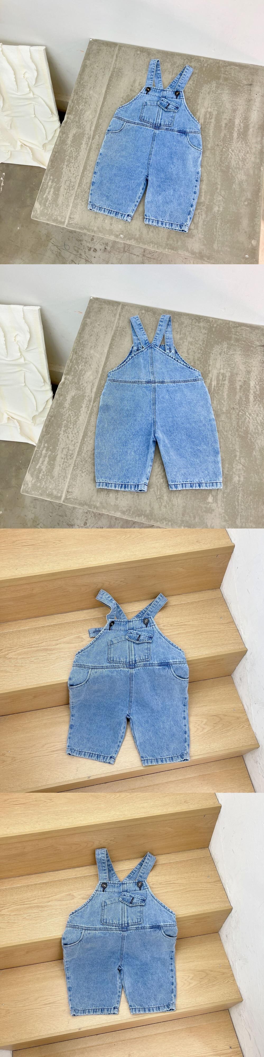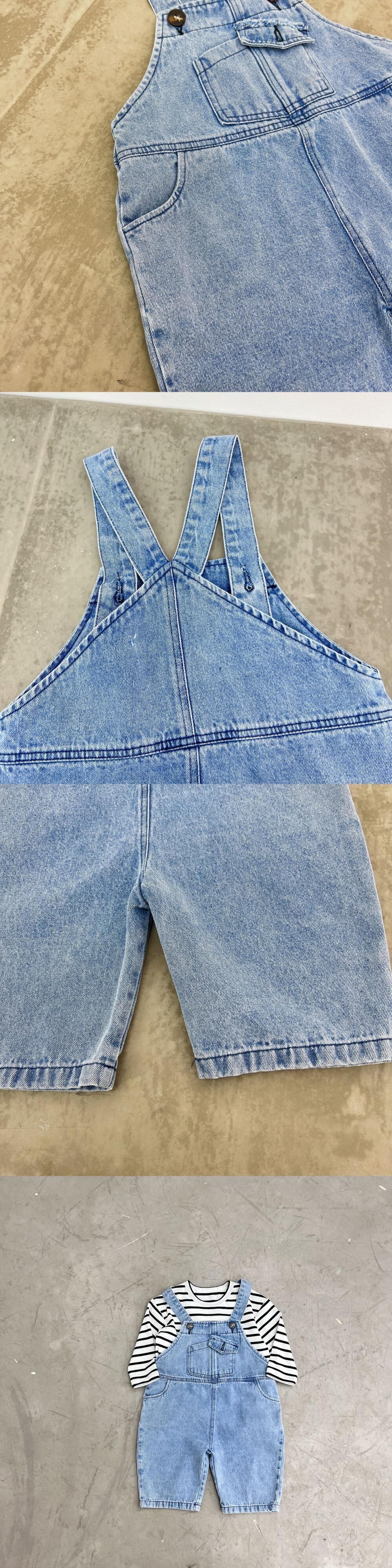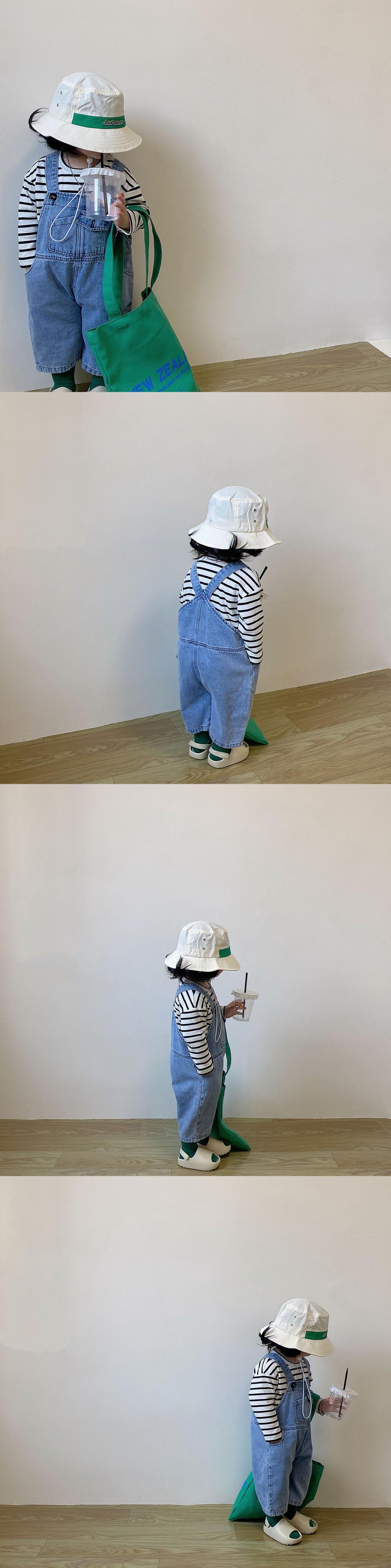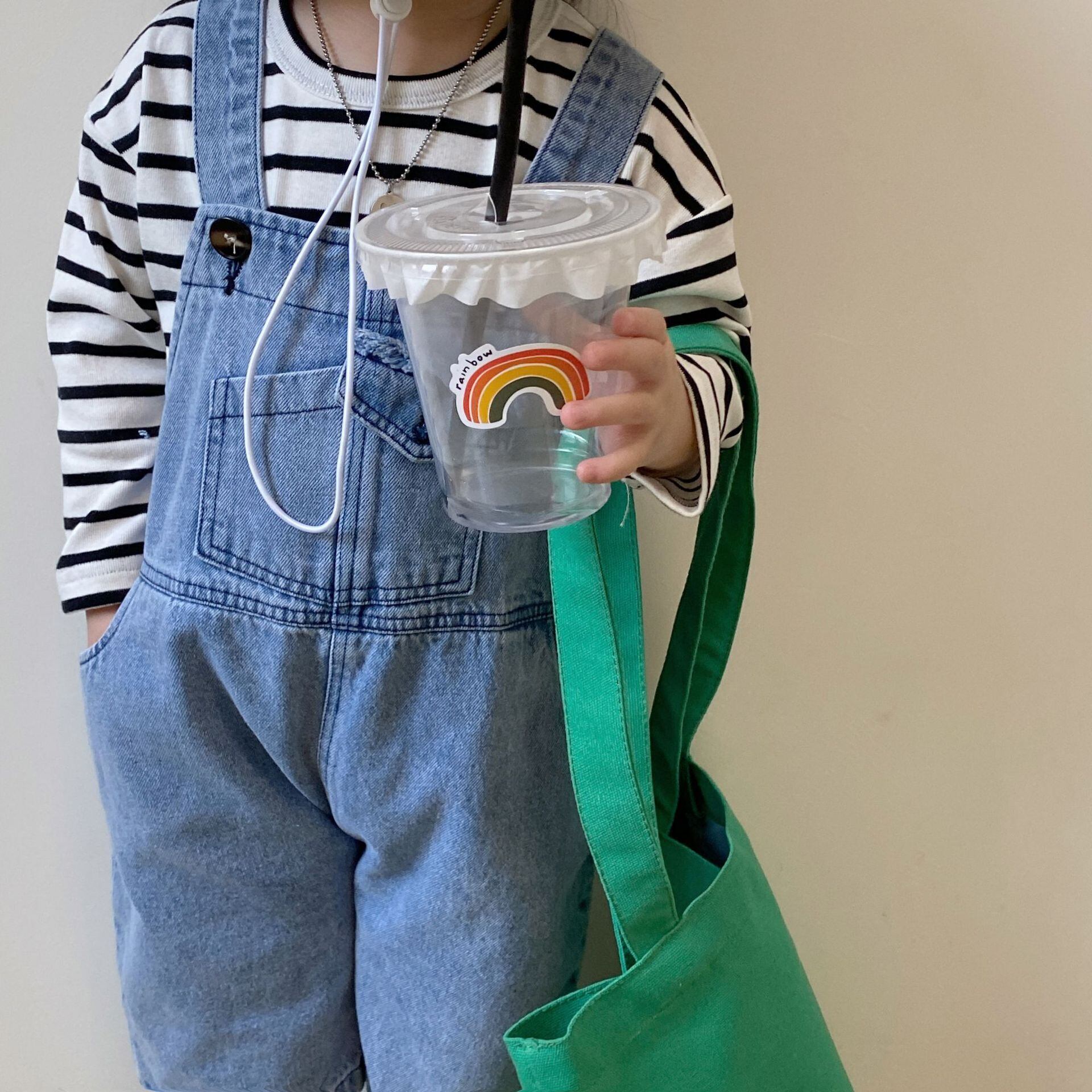 色:デニムオーバーオール(ルーズフィット),黒と白のストライプT(ルーズフィット)