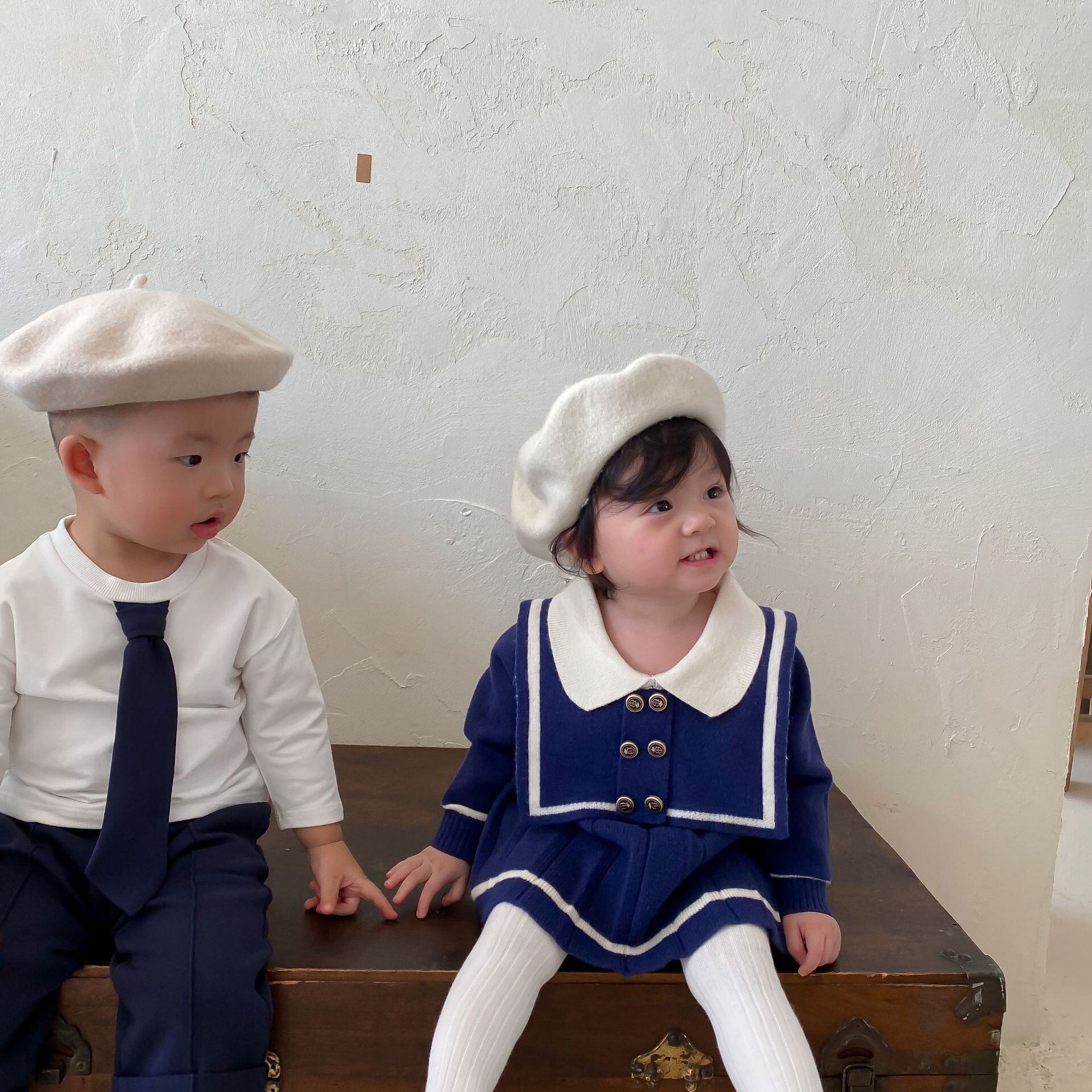 色:青い服,ベージュのドレス,オフホワイトのニット帽,黒のニット帽