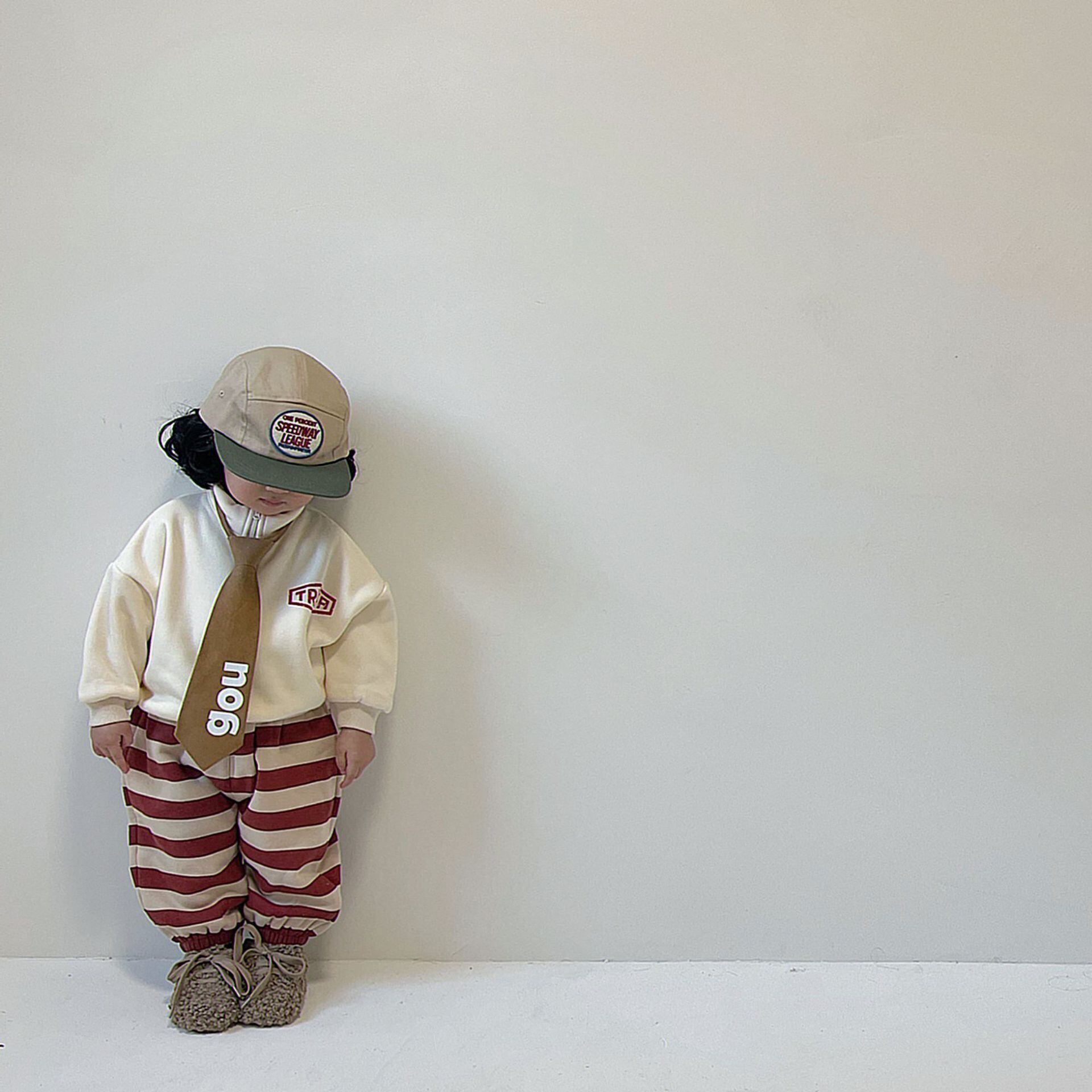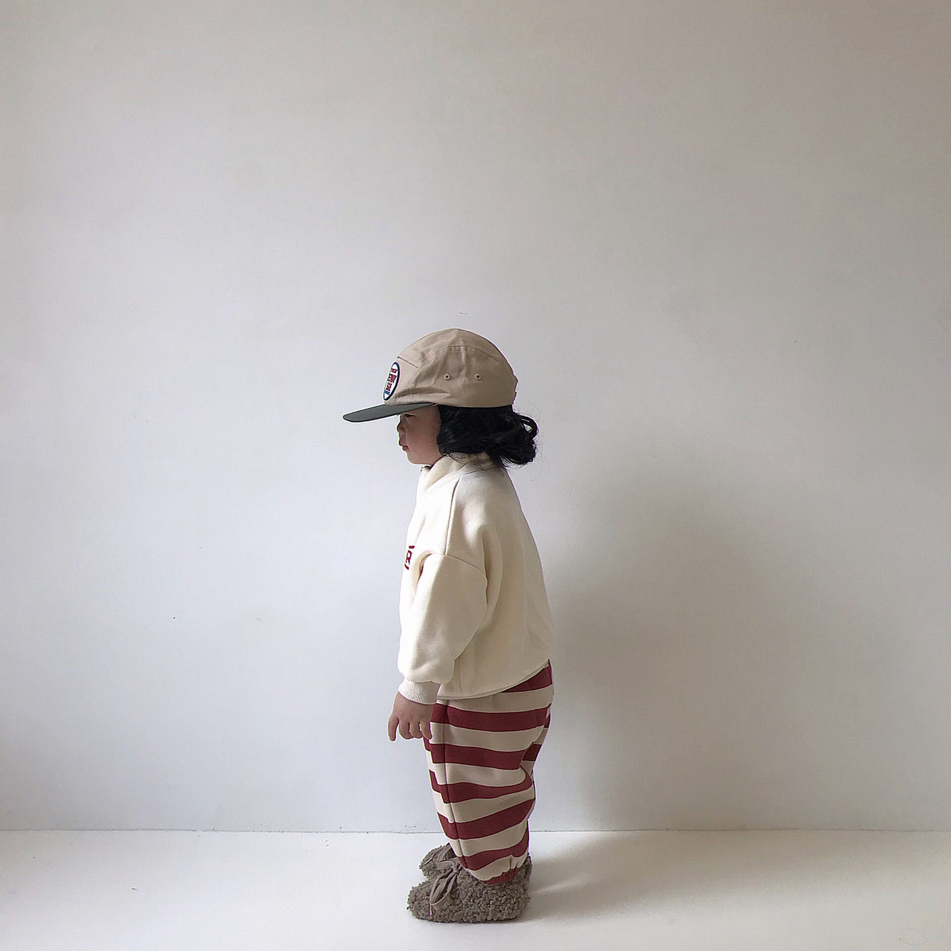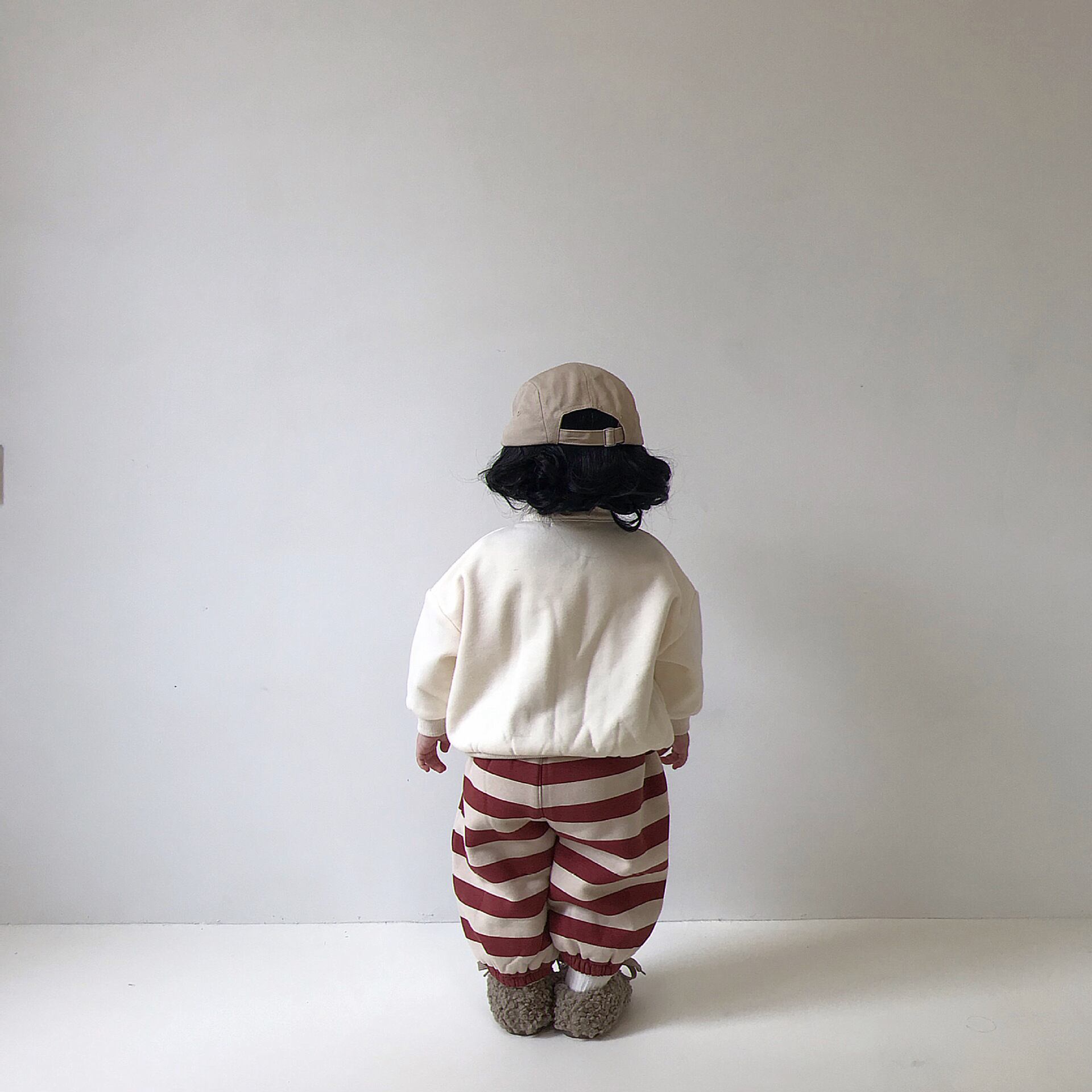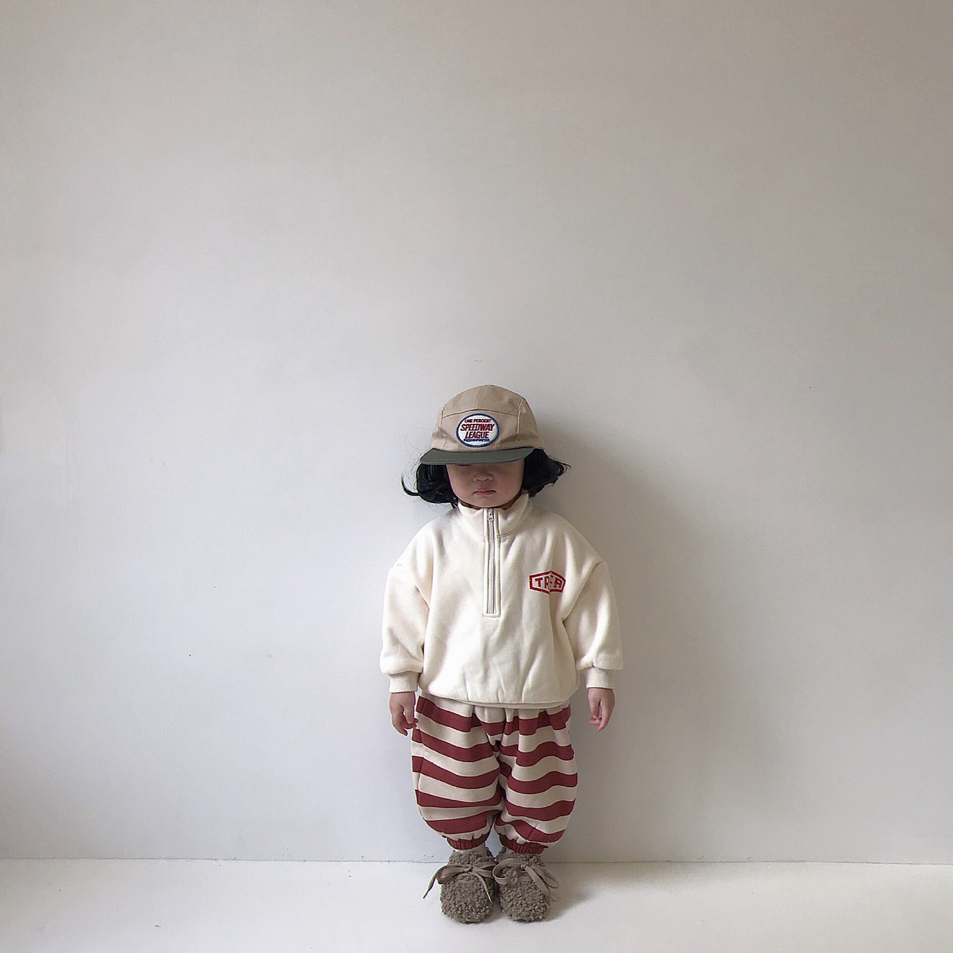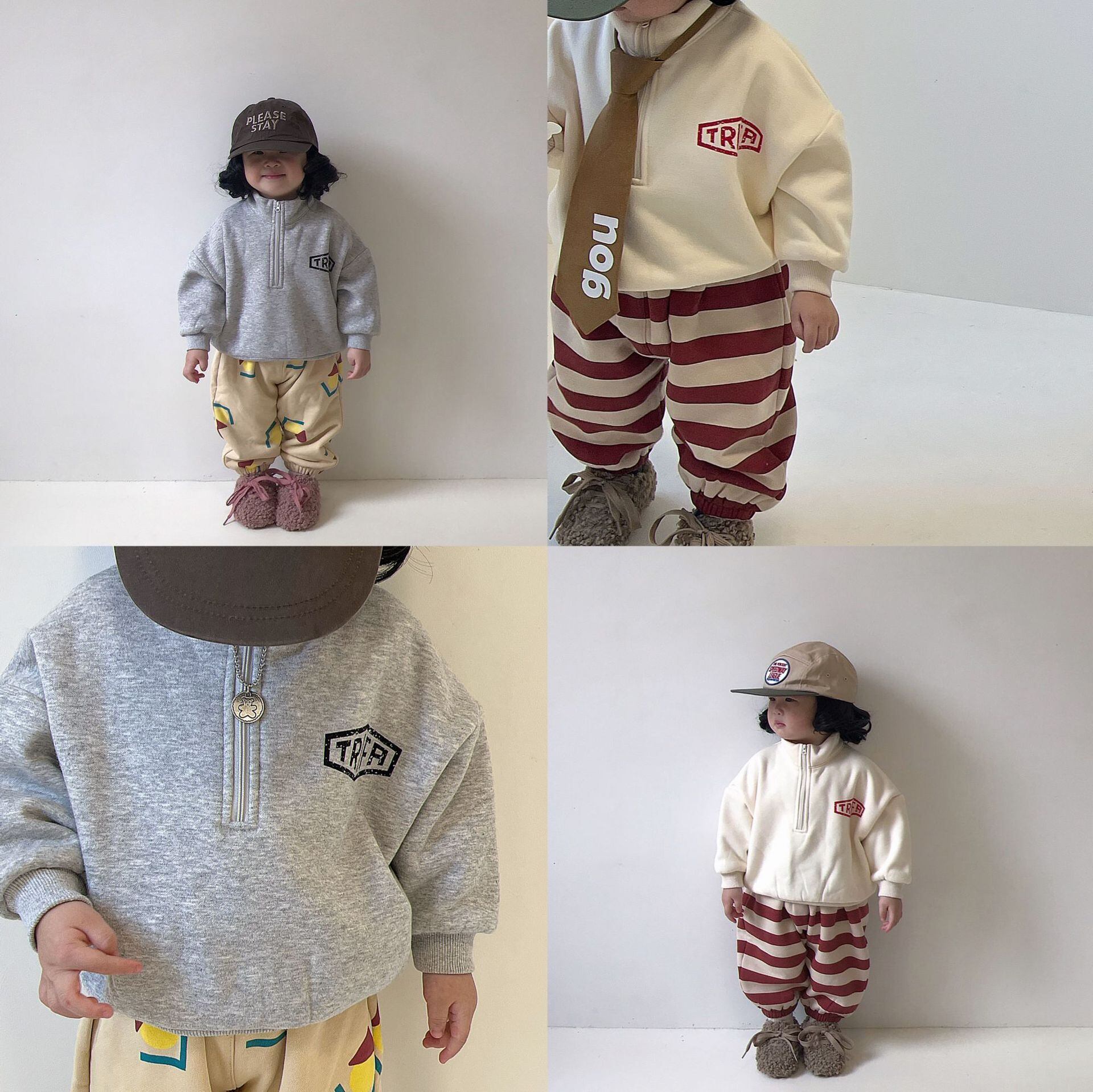 色:フリースセーター(ベージュ),フリースセーター(グレー),赤い縞模様のフリースパンツ,小さな家のフリースパンツ