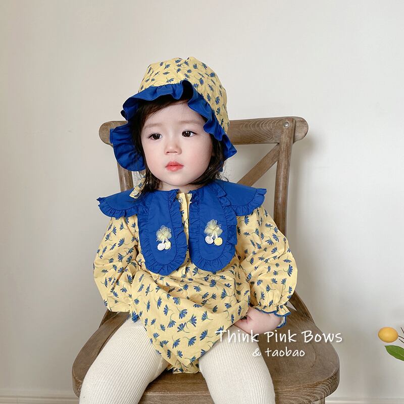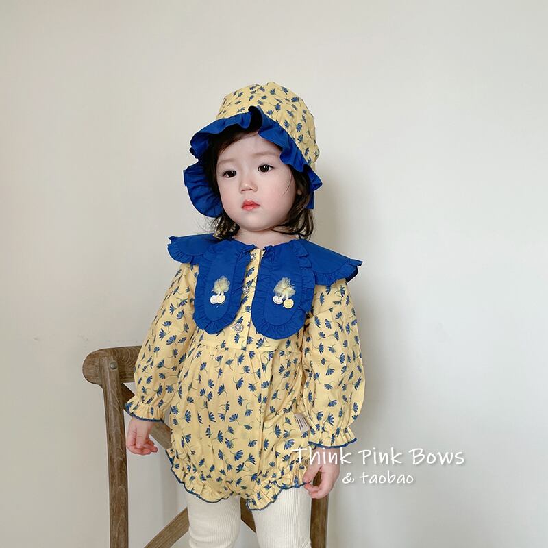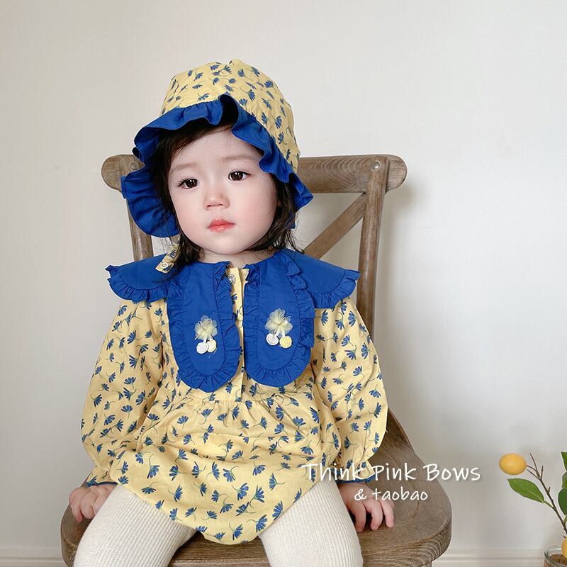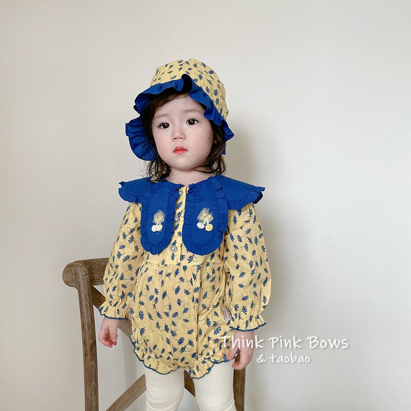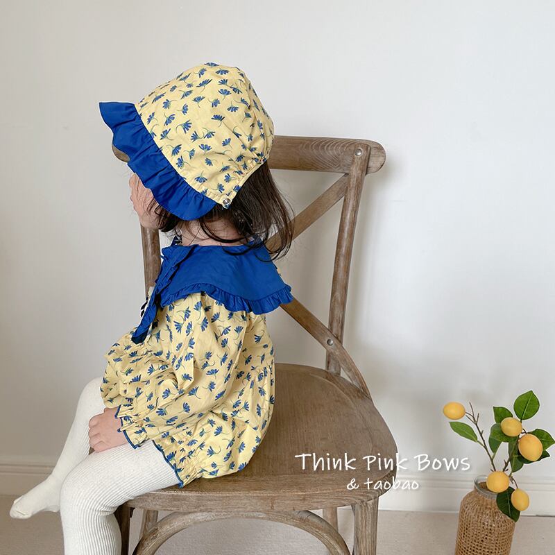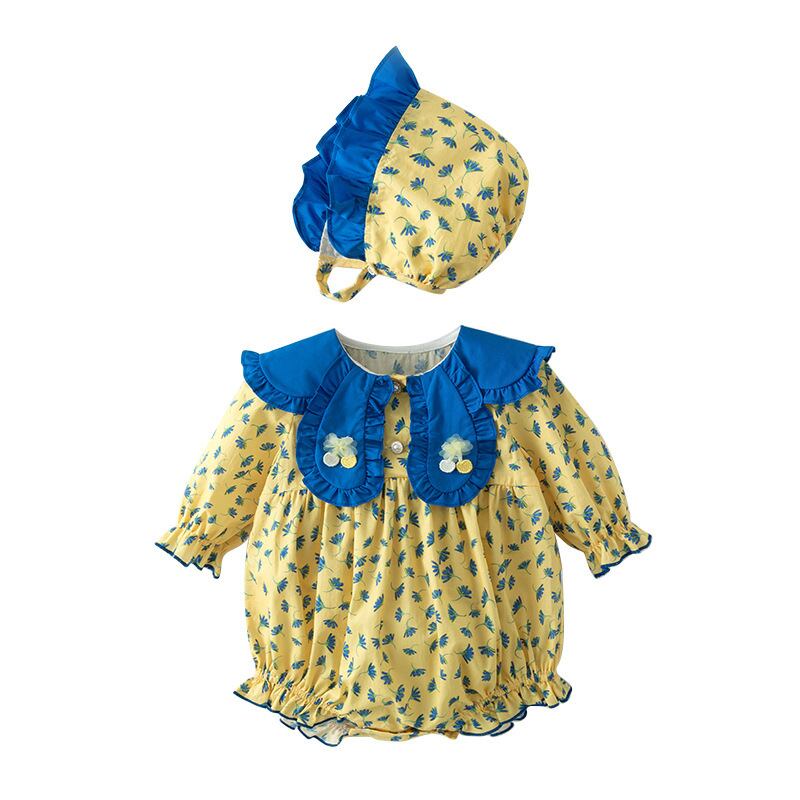 色:イエロープリント長袖ロンパース+帽子