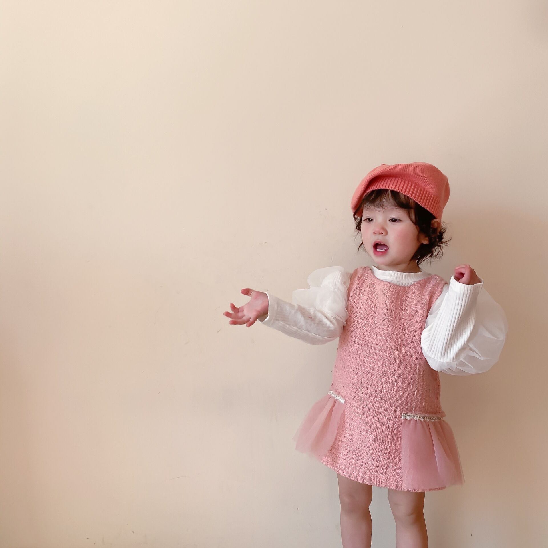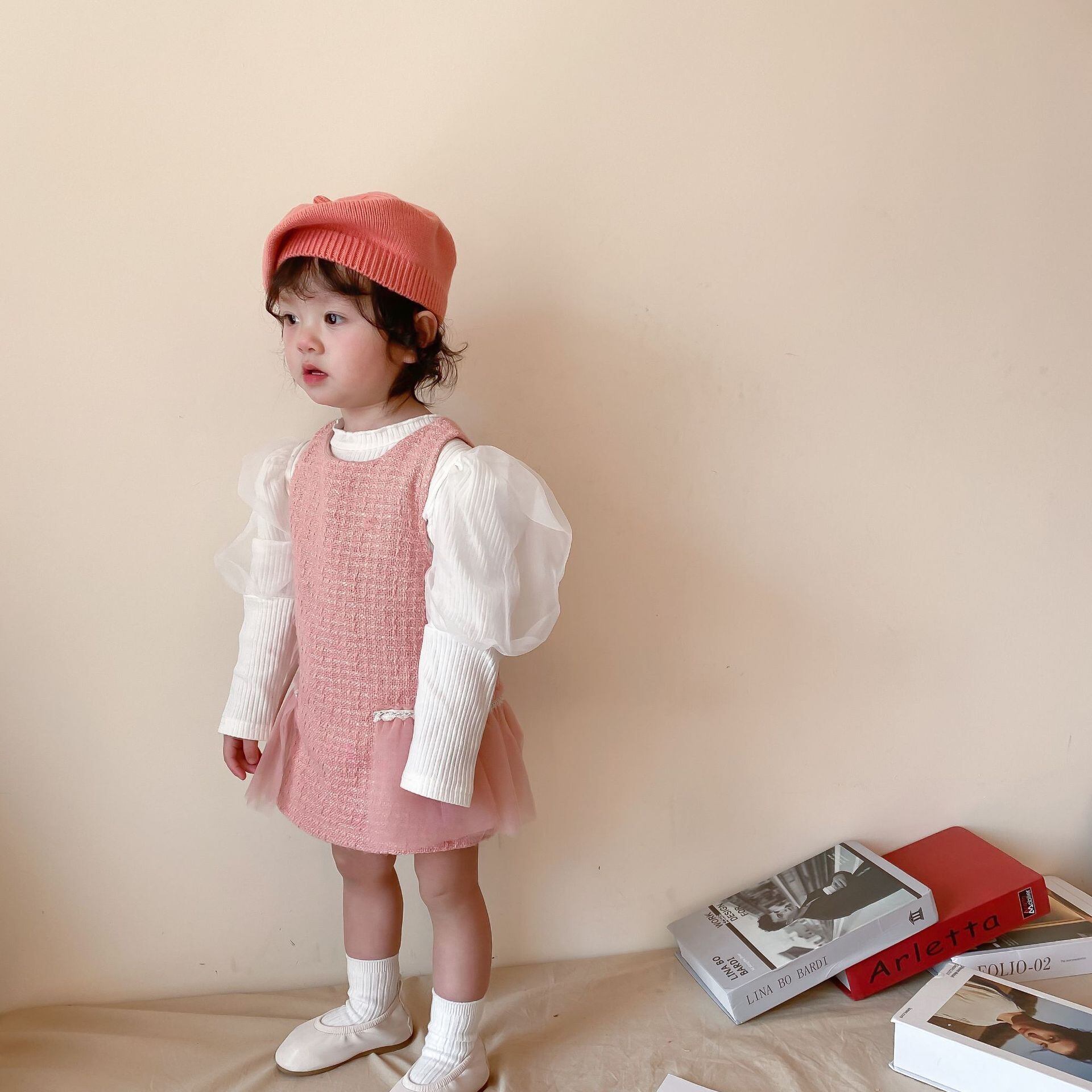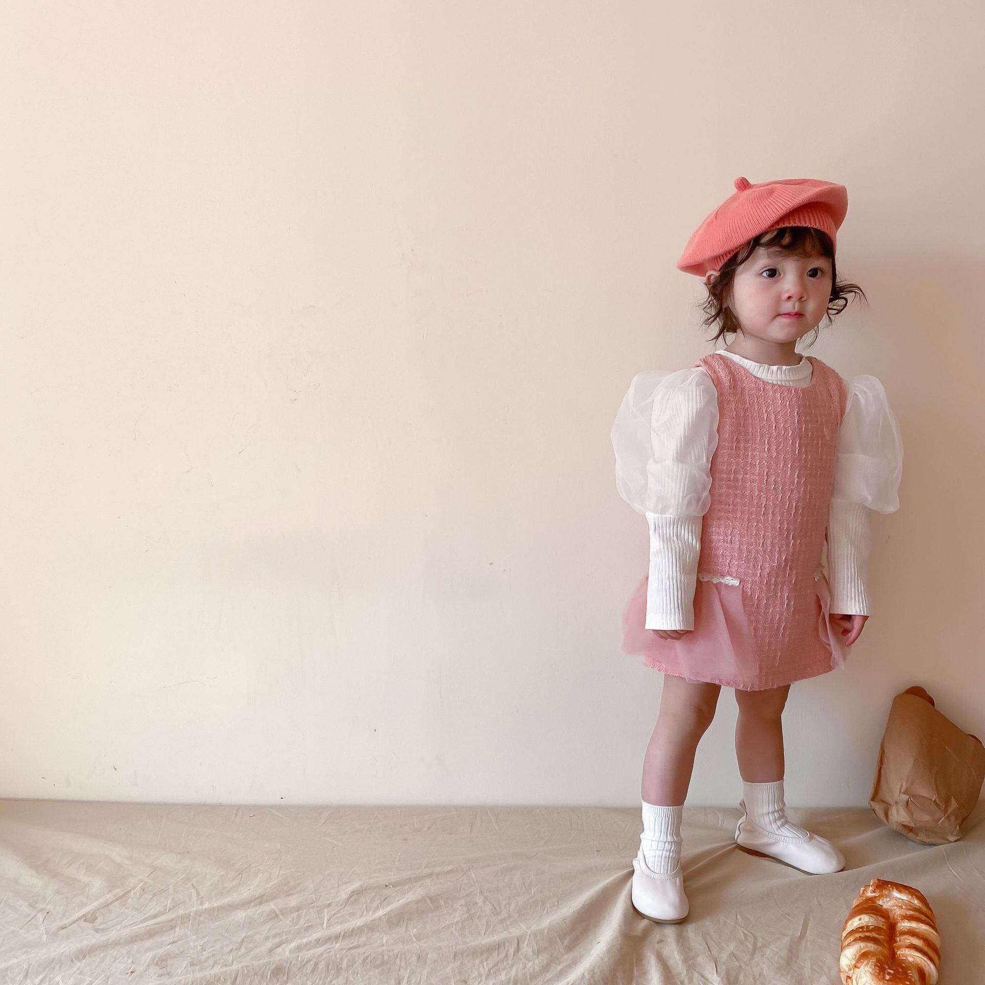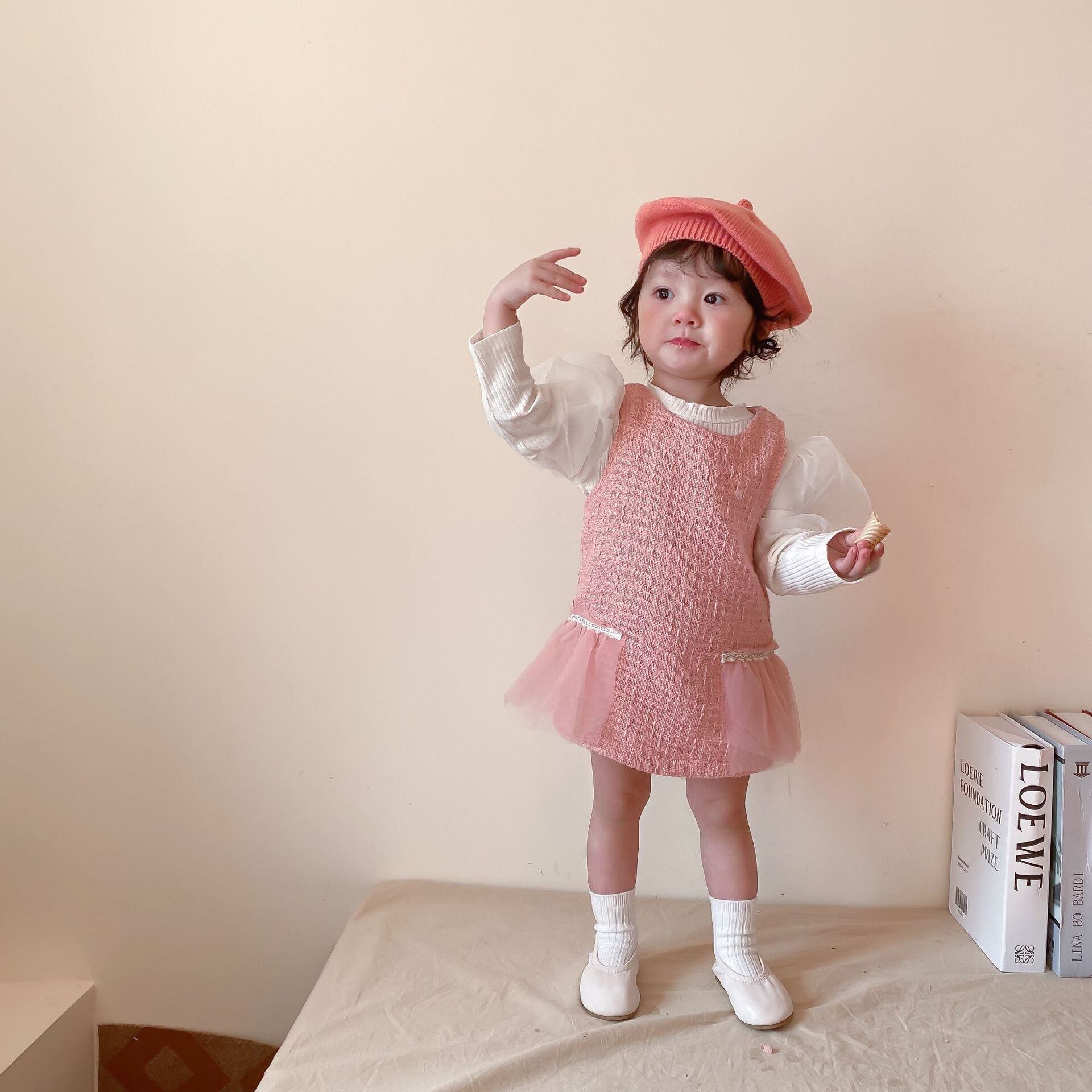 色:ピンクのスモールフレグランスベストスカート,パフスリーブボトミングシャツ