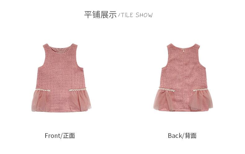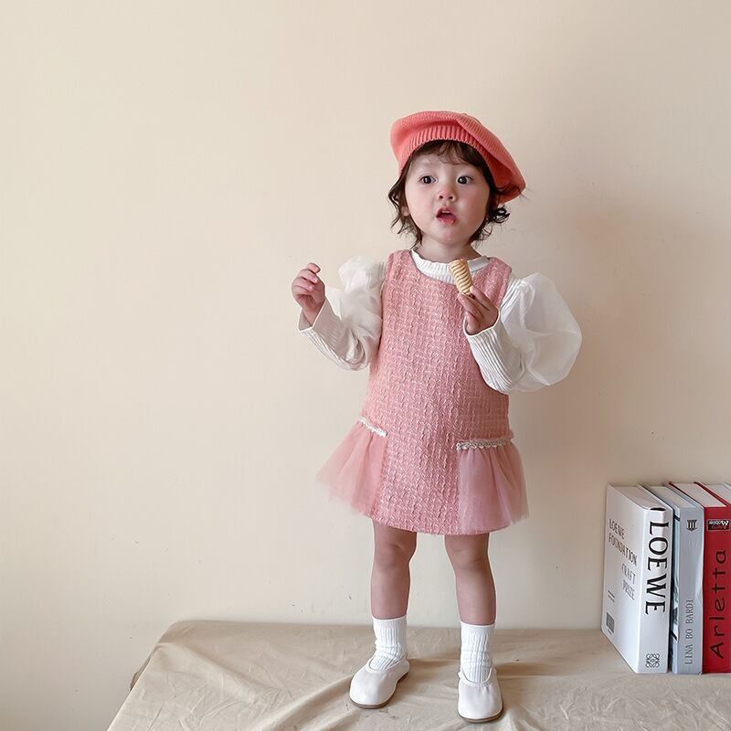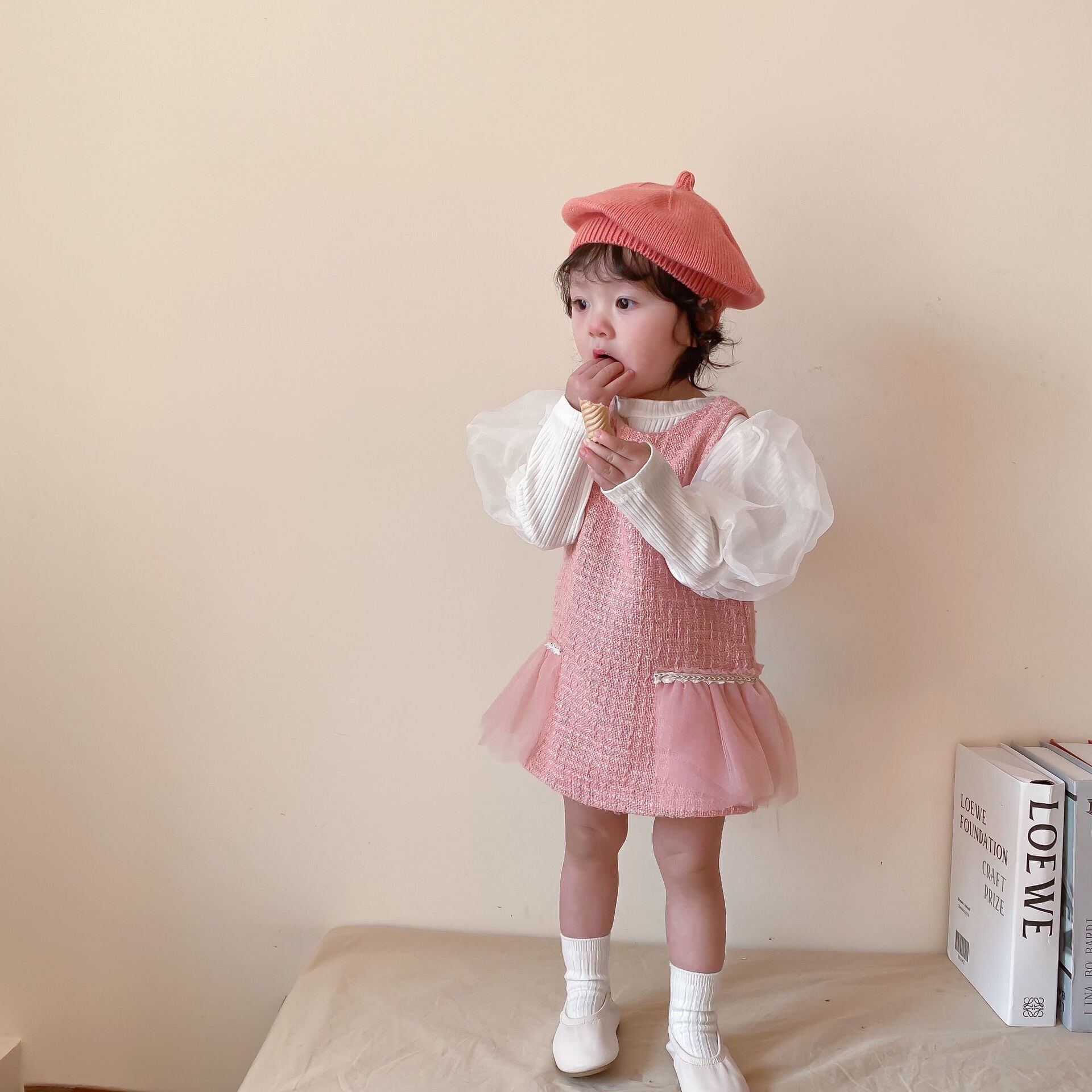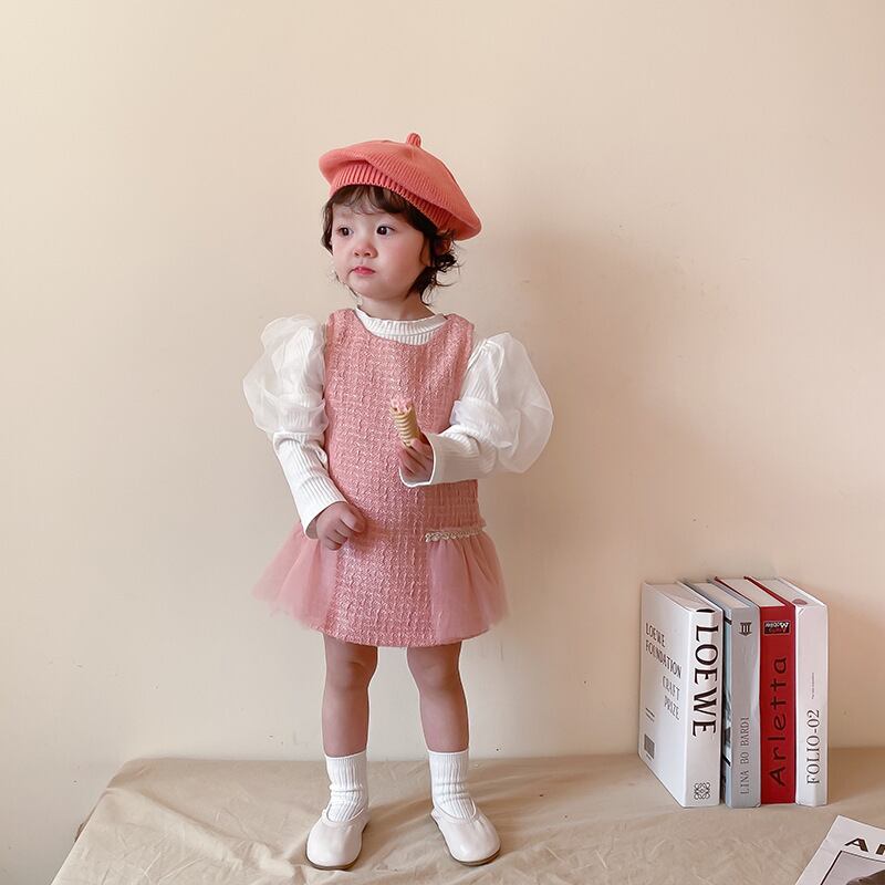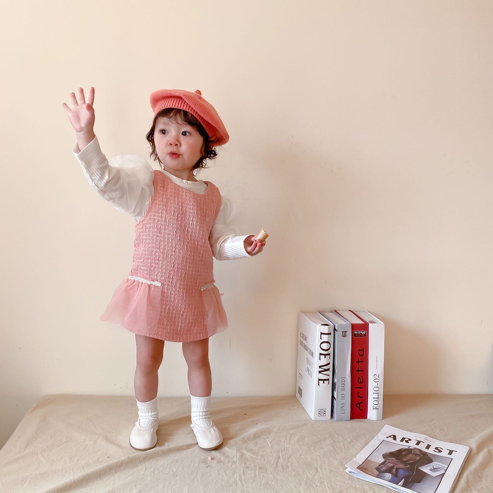 色:ピンクのスモールフレグランスベストスカート,パフスリーブボトミングシャツ
