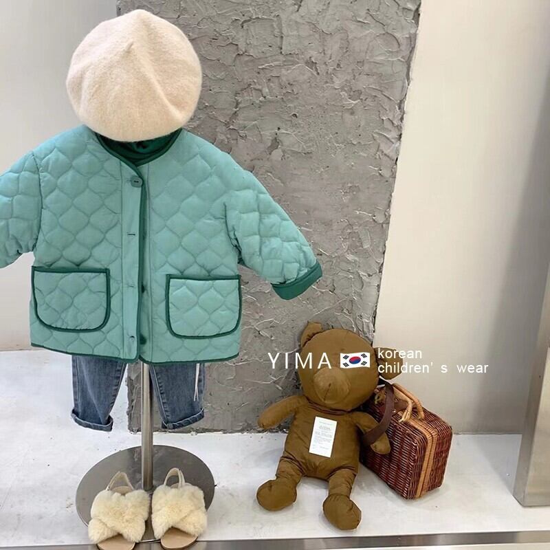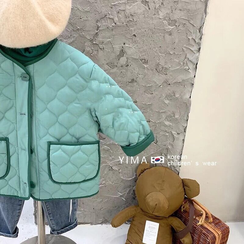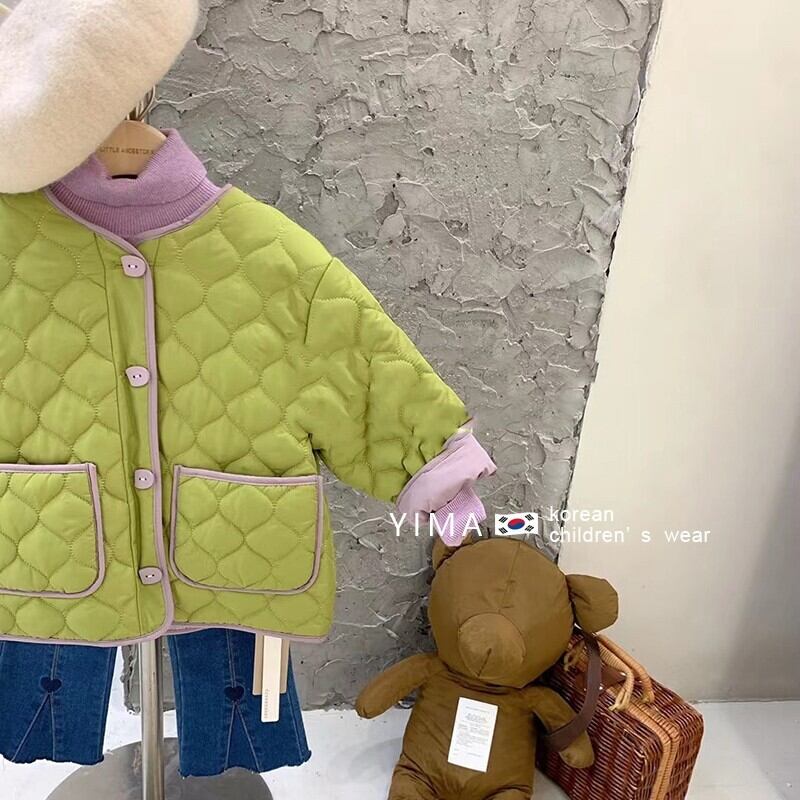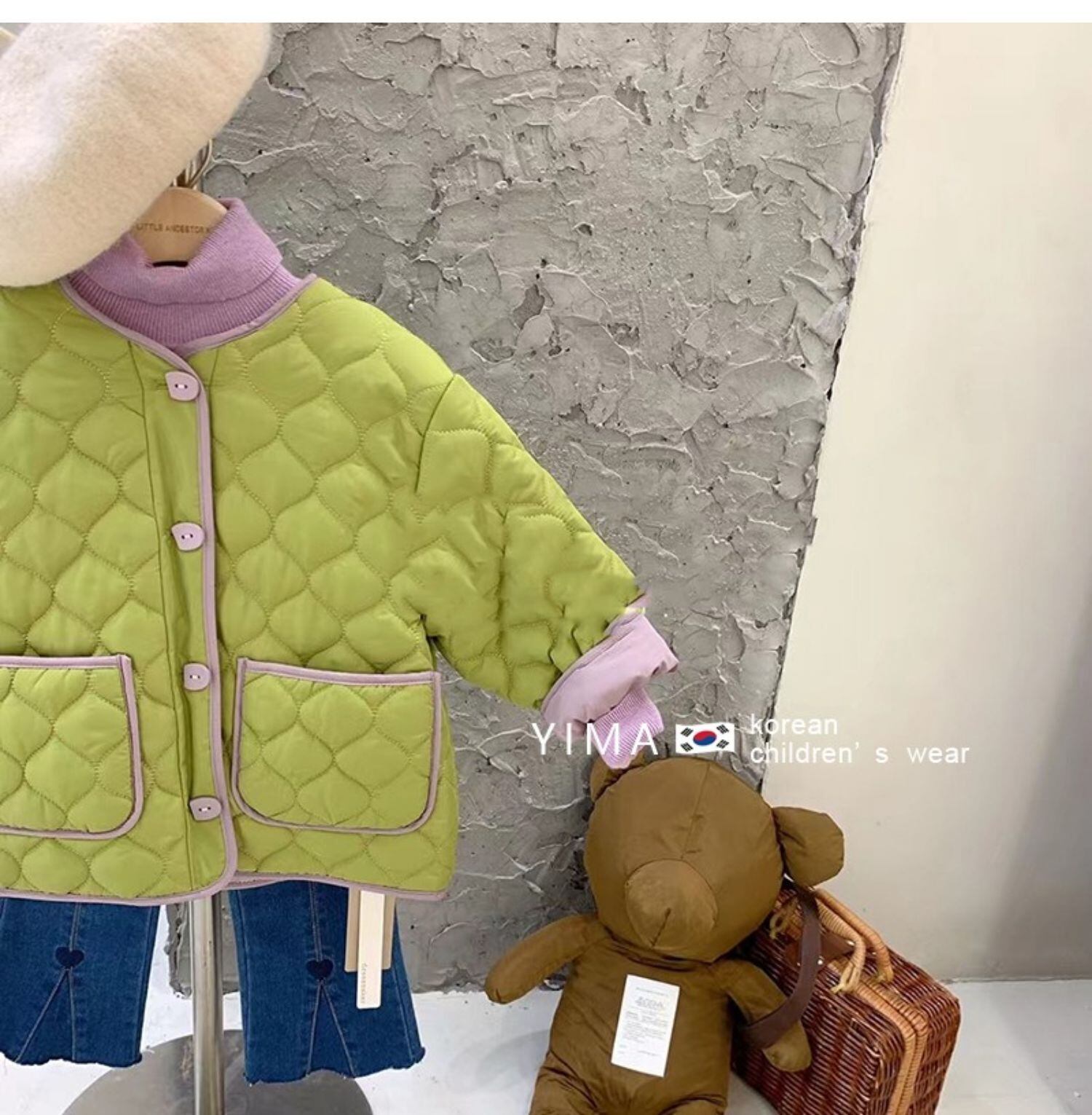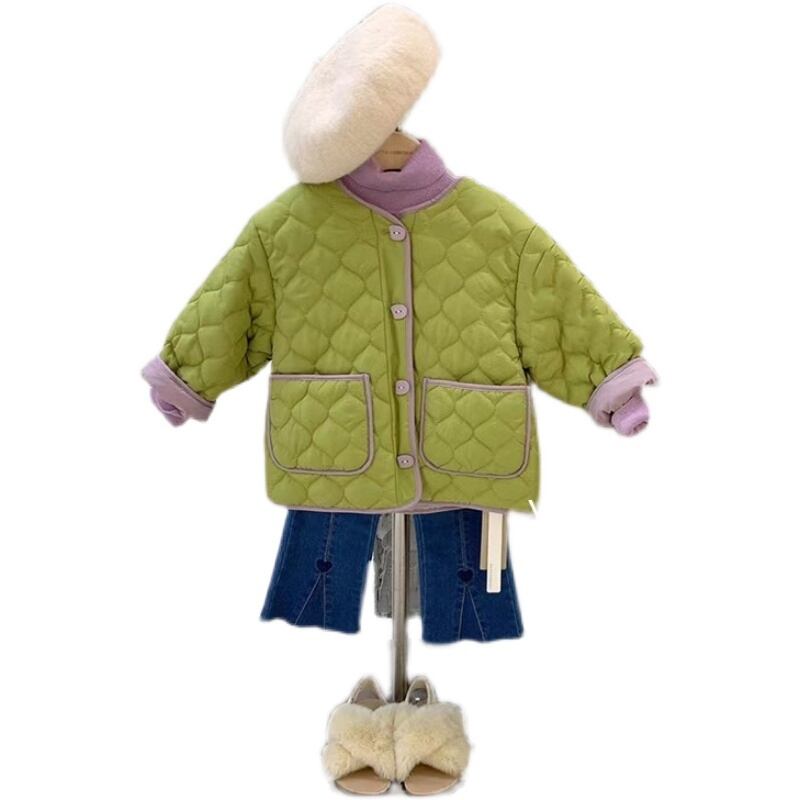 色:グリーンコットンコート,薄紫のボトミングシャツ,ダークブルージーンズ