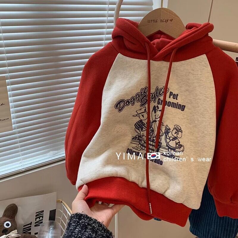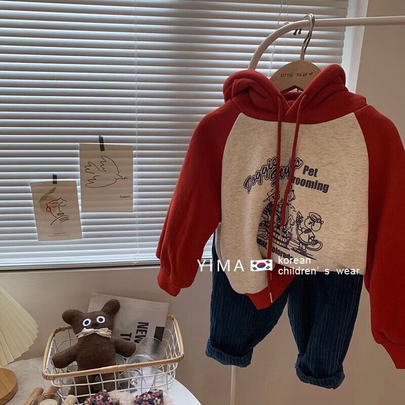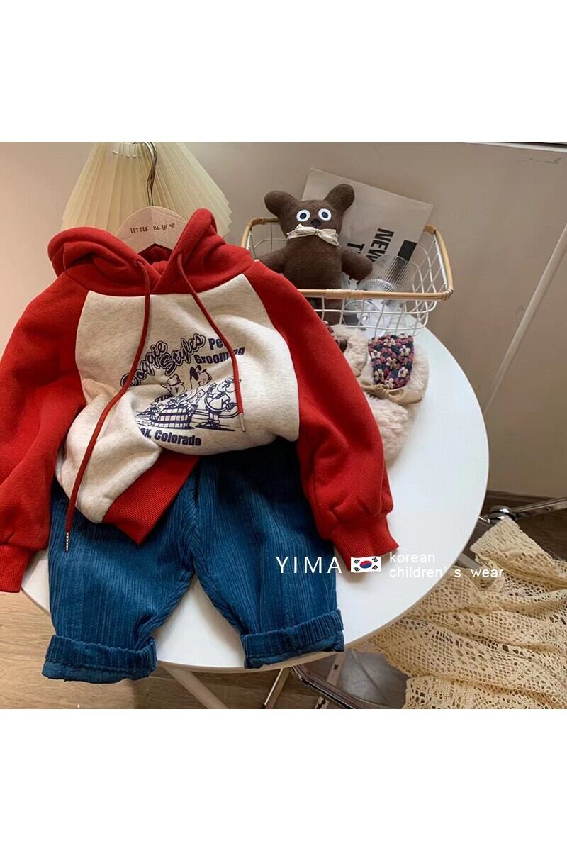 色:赤とベルベットのスウェットシャツ,ブルーコーデュロイパンツ,グレーのセーター,赤い手紙のスウェットシャツ