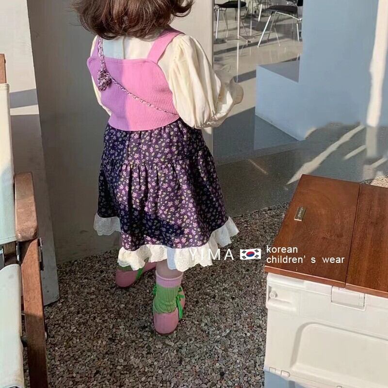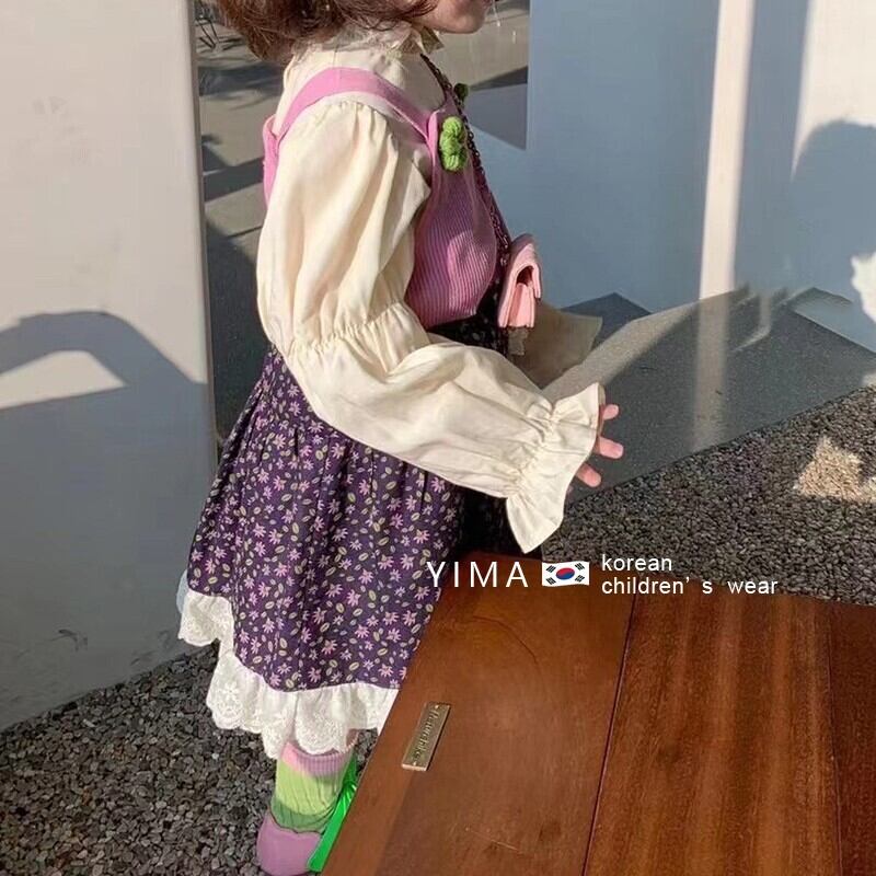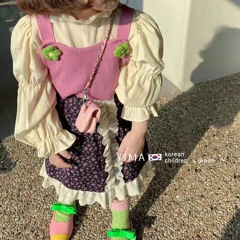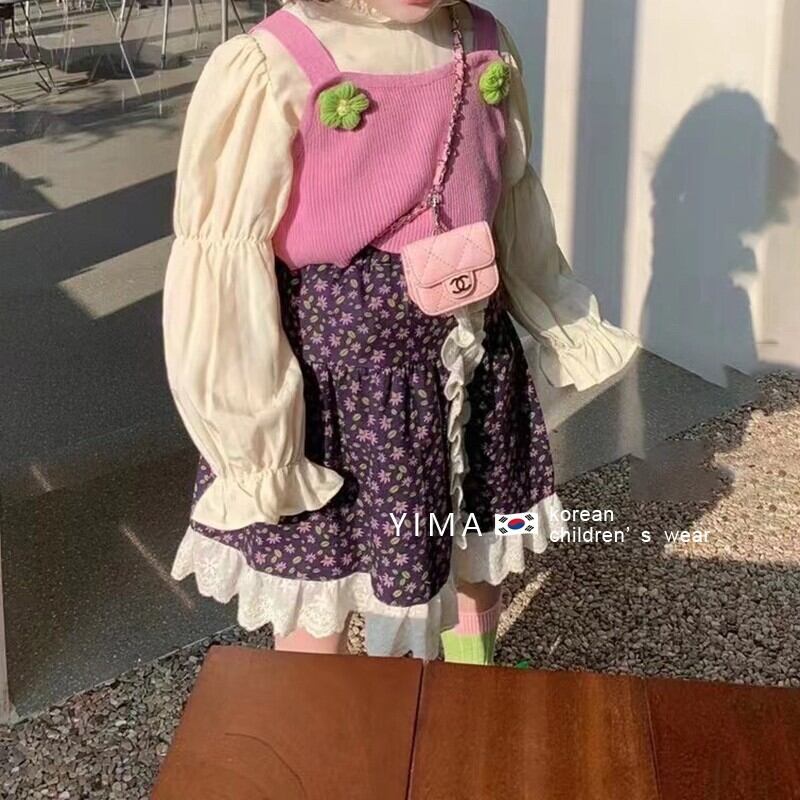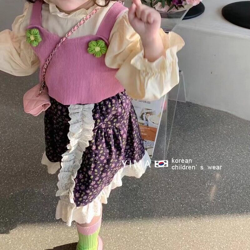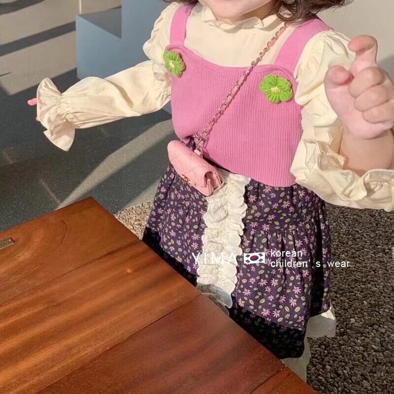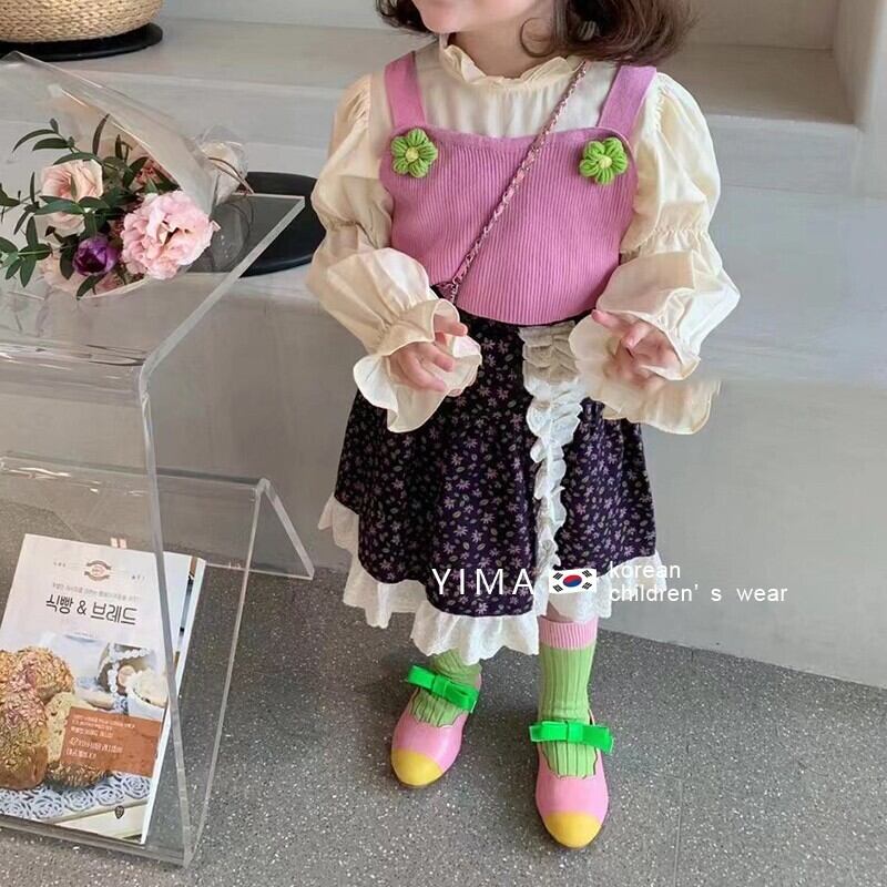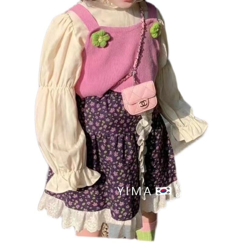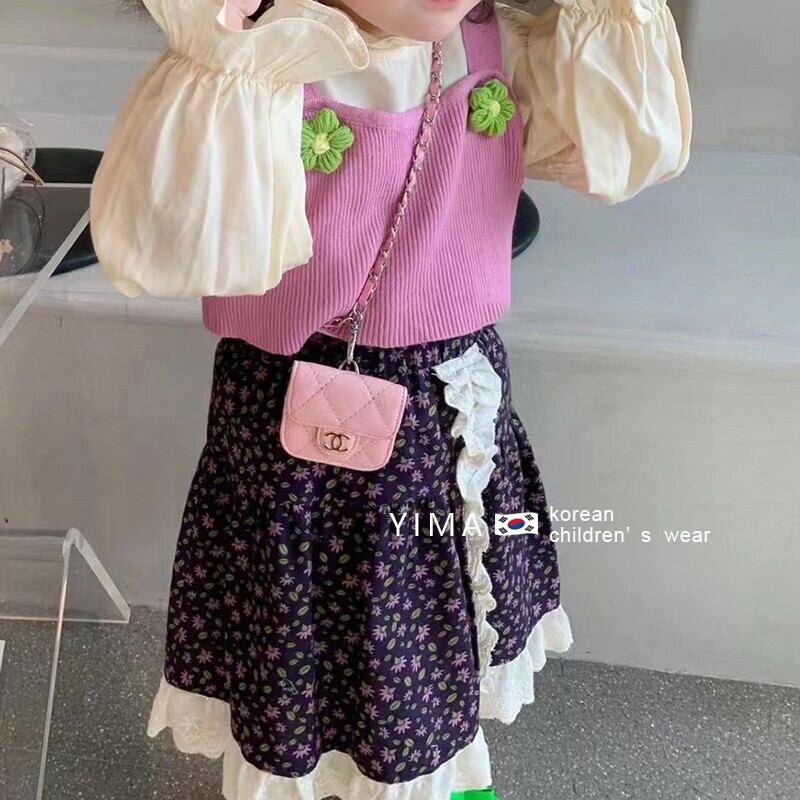 色:ピンクのニットベスト,アプリコットシャツ,紫のスカート