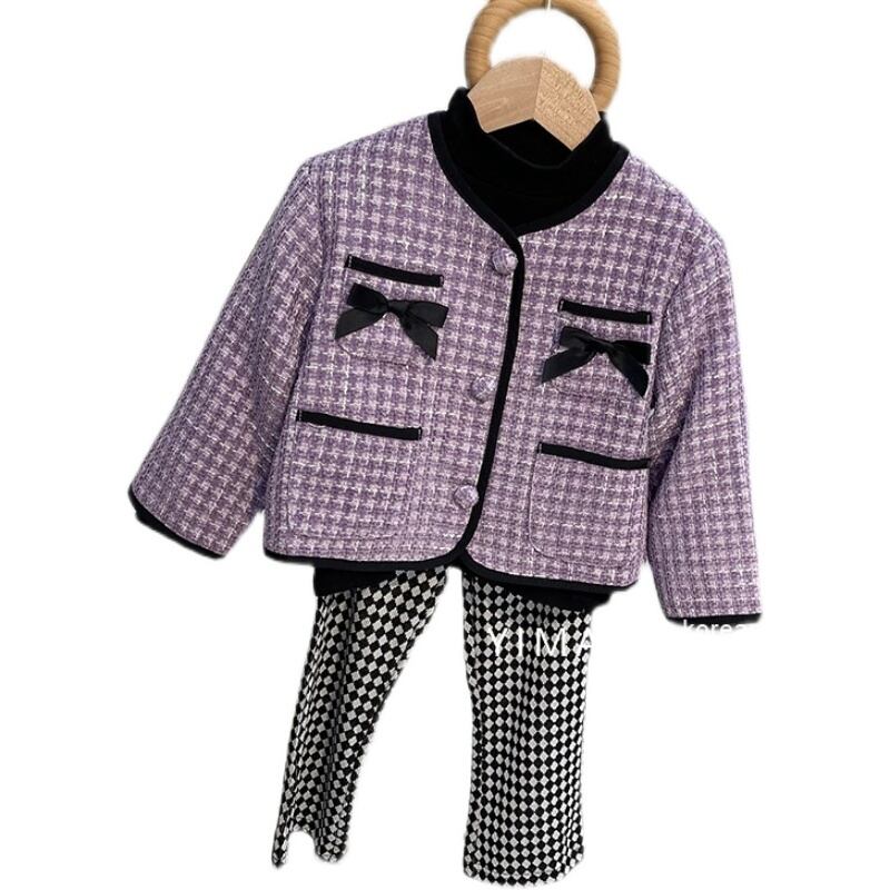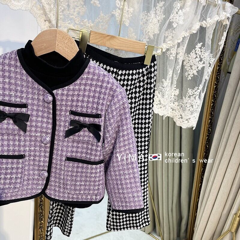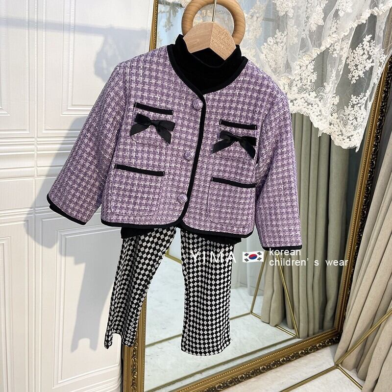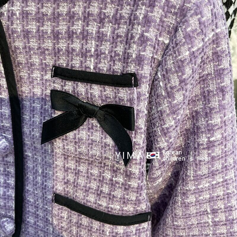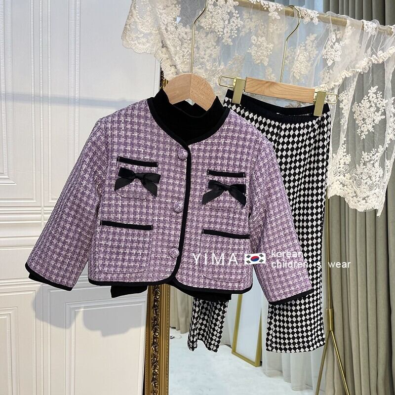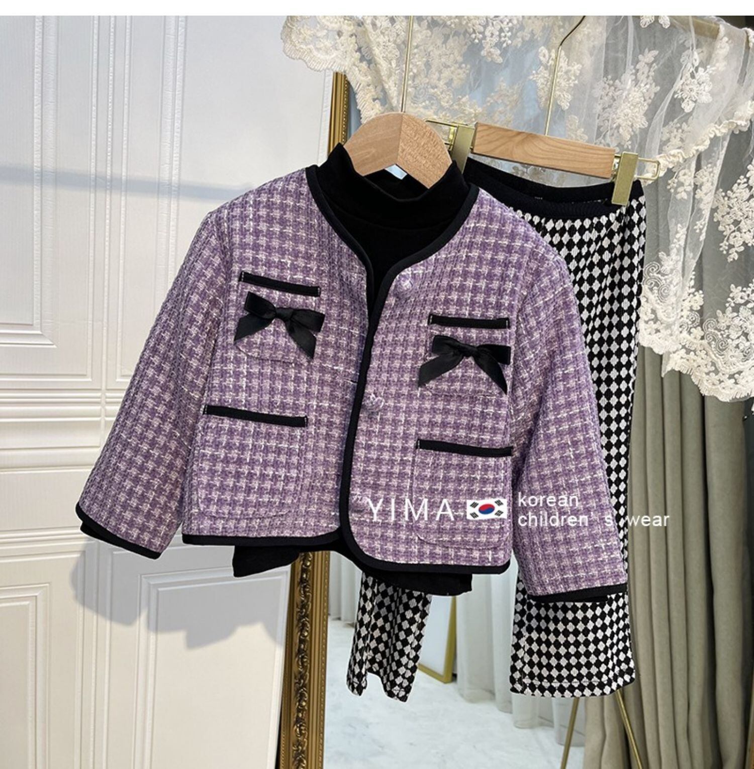色:黒底シャツ,パープルスモールフレグランスコート,ブラックダイヤモンドパンツ