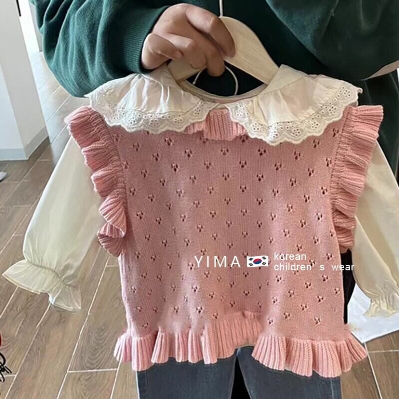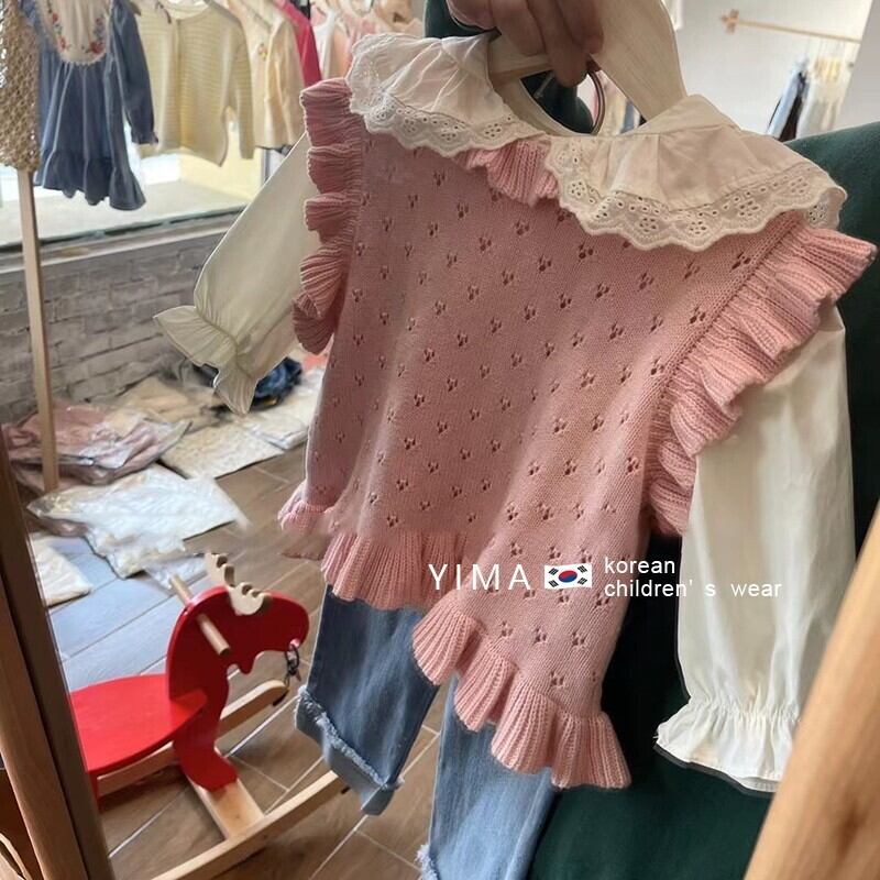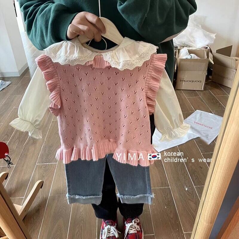色:ピンクのニットベスト,白のシャツ,ブルージーンズ