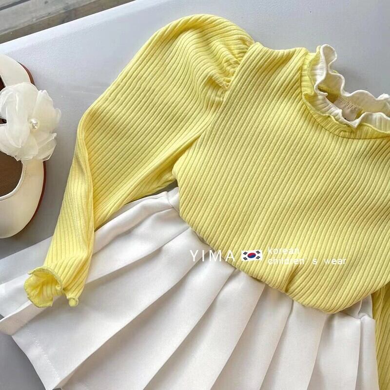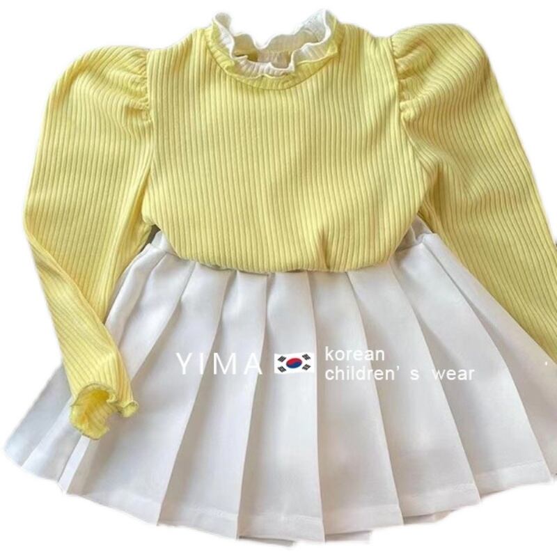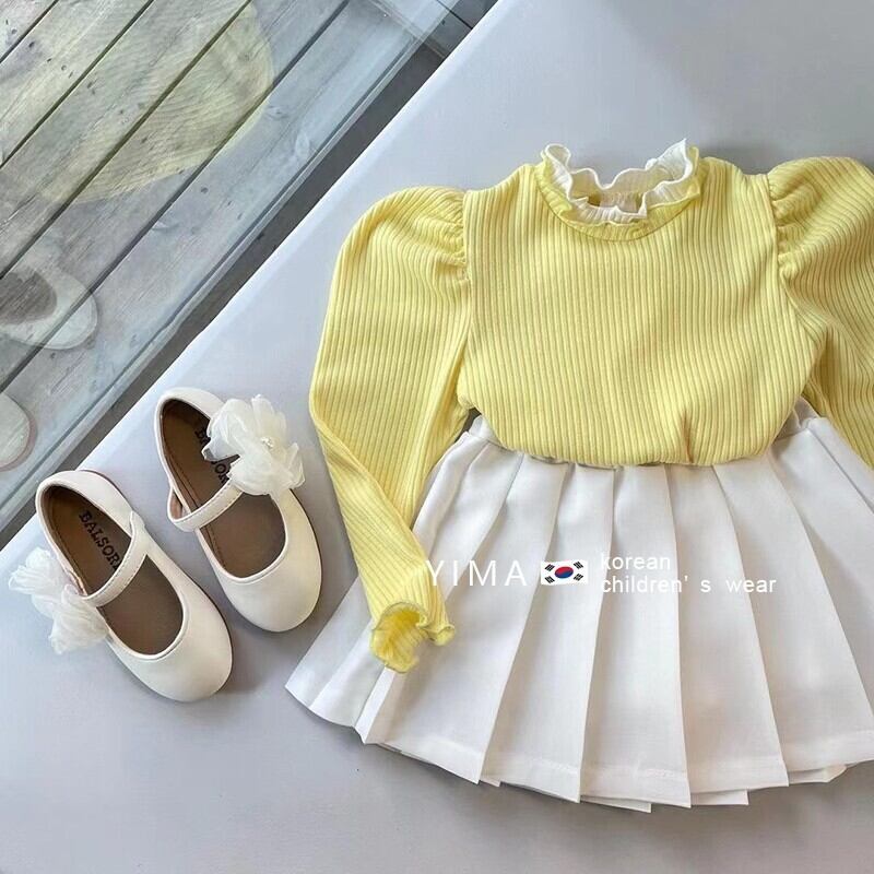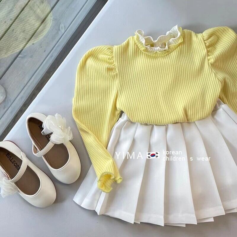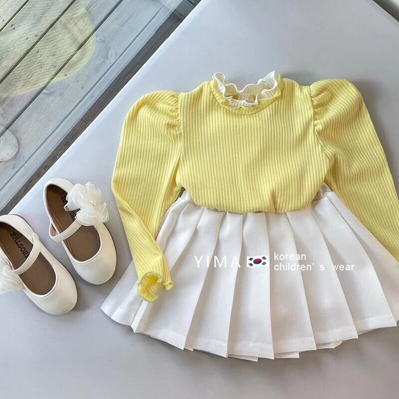 色:オフホワイトのプリーツスカート,卵黄長袖トップ