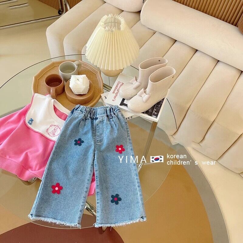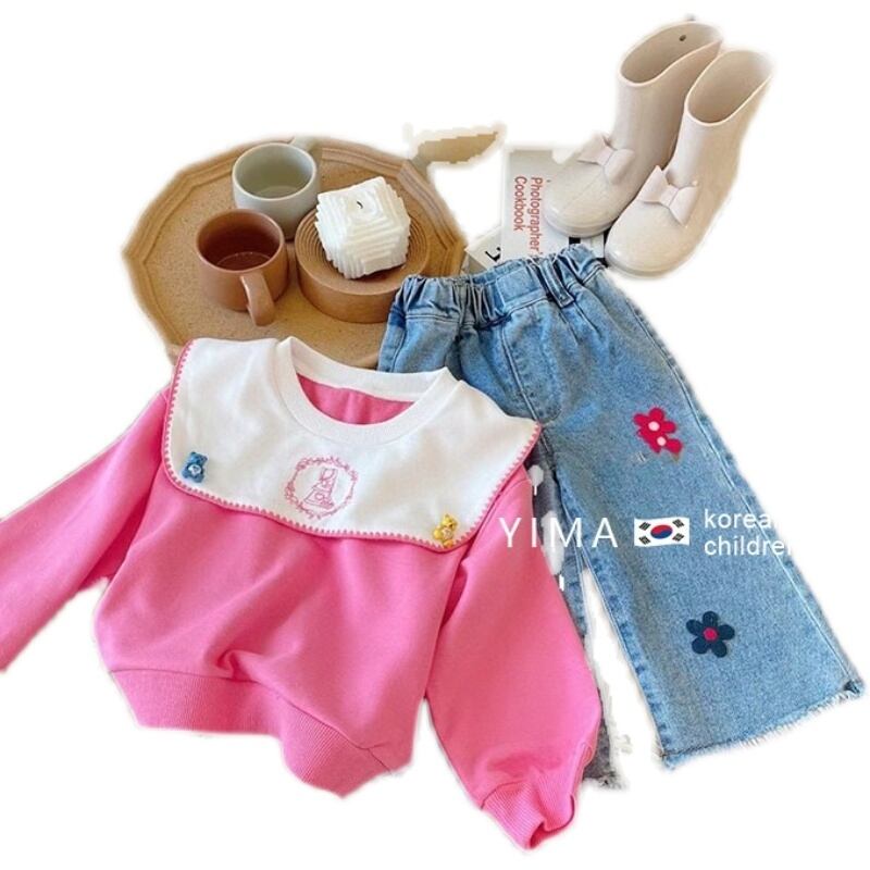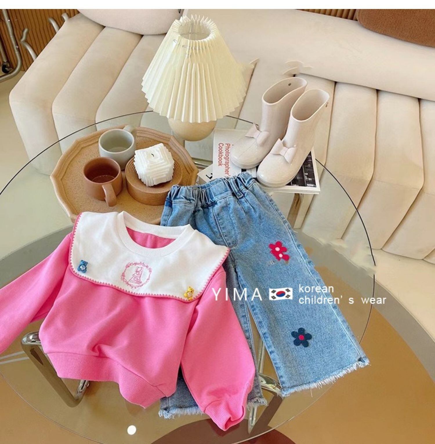 色:ピンクのセーター,ブルージーンズ