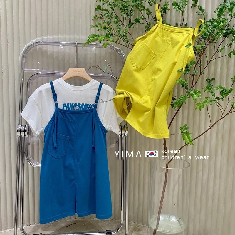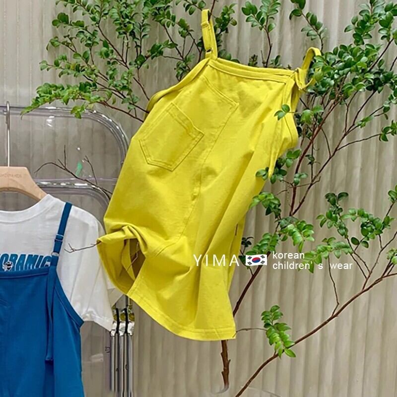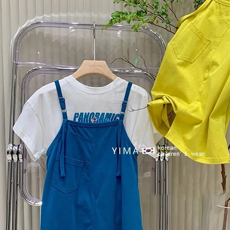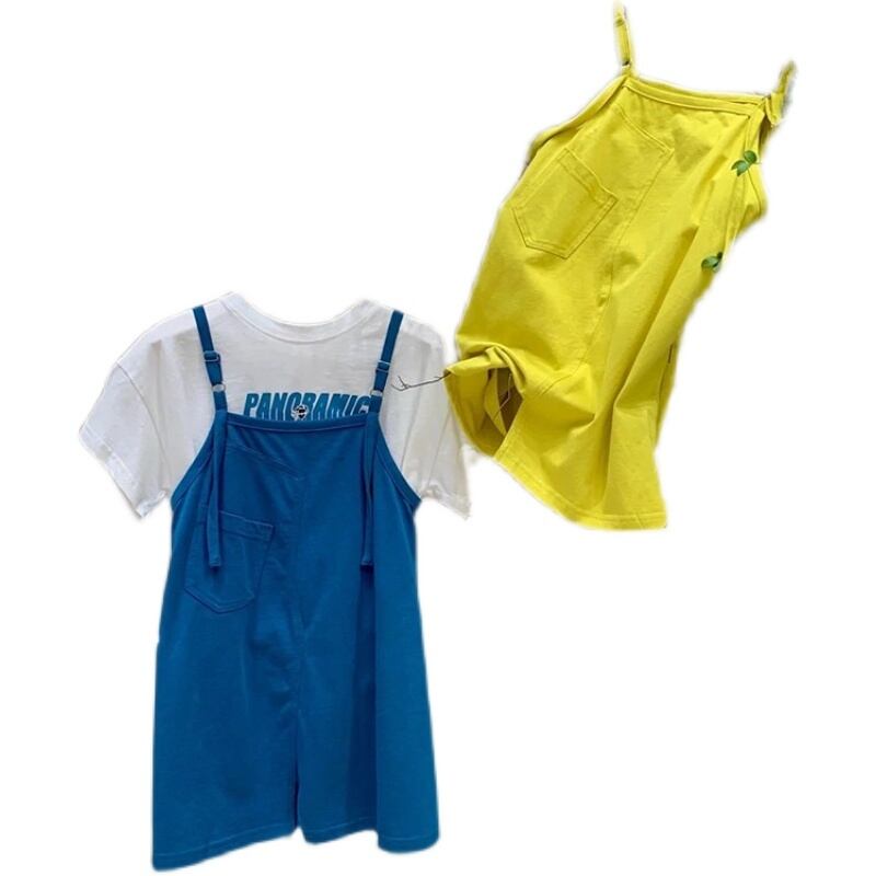 色:白い半袖,青い服,黄色のサスペンダースカート