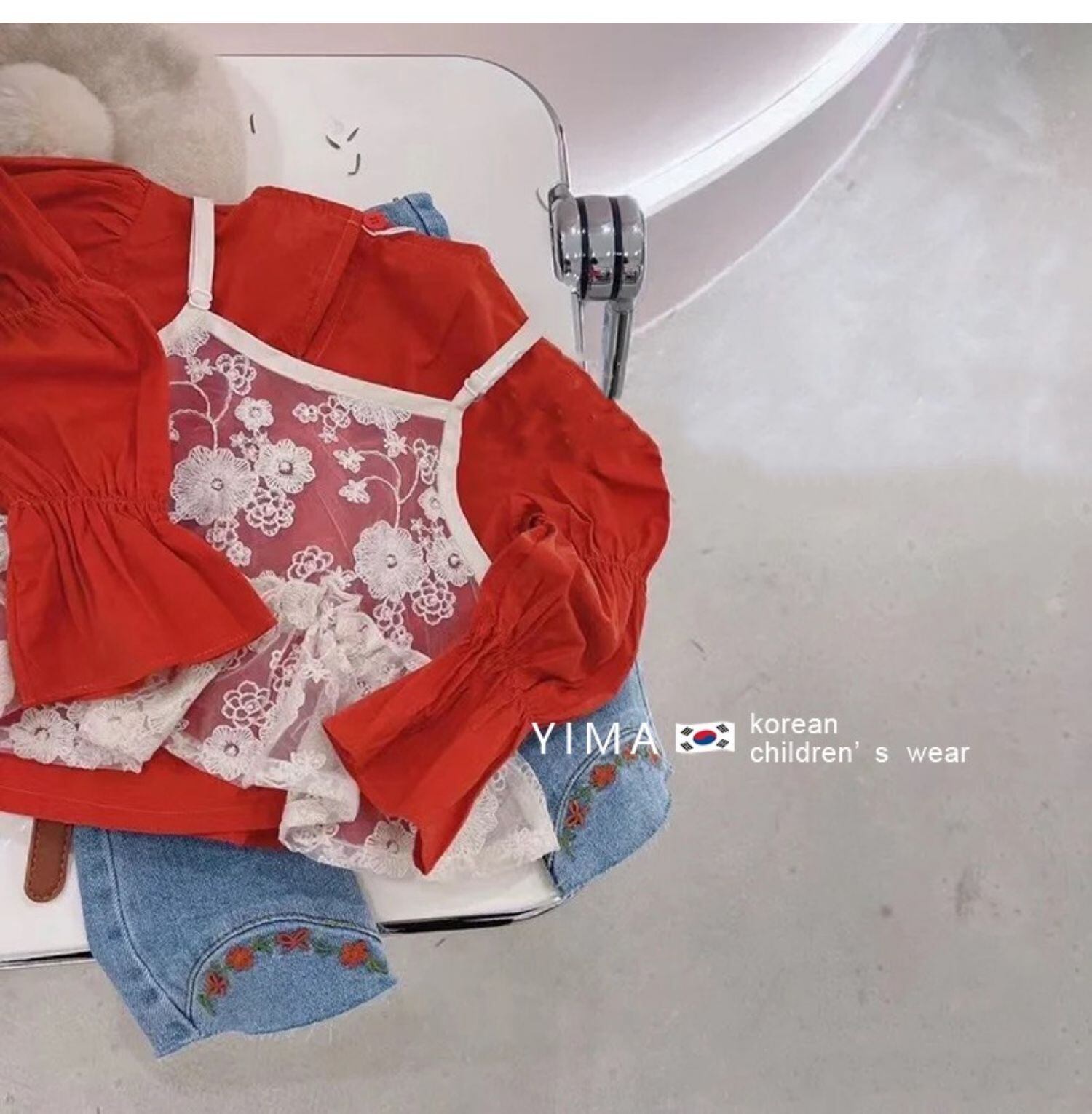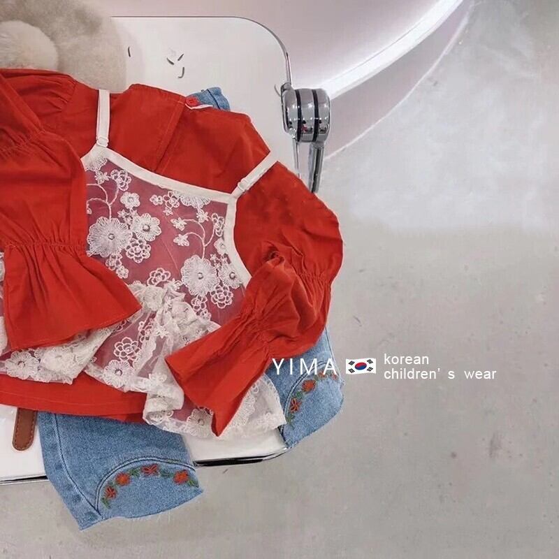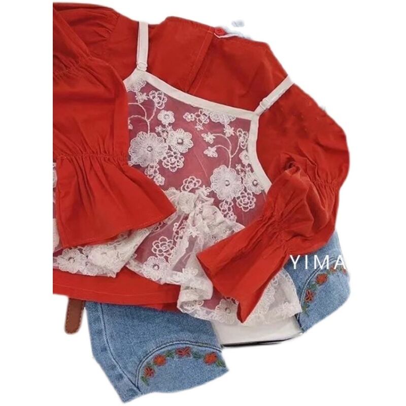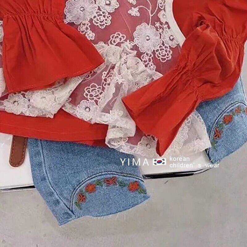 色:レッドトップ,レースホルタートップ,ブルージーンズ
