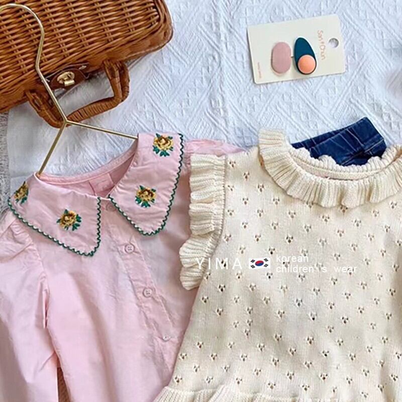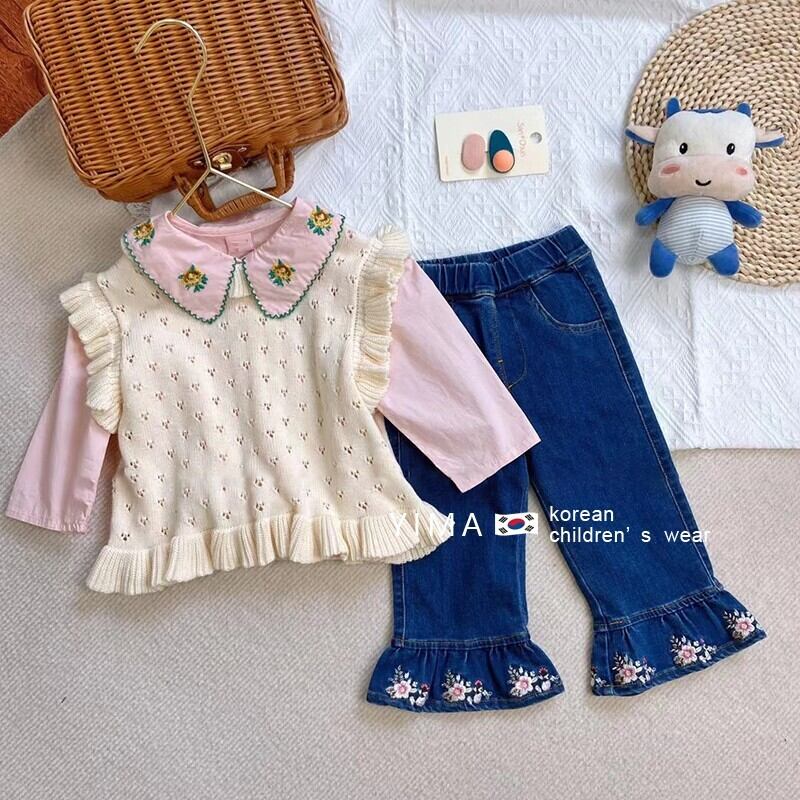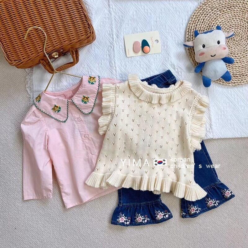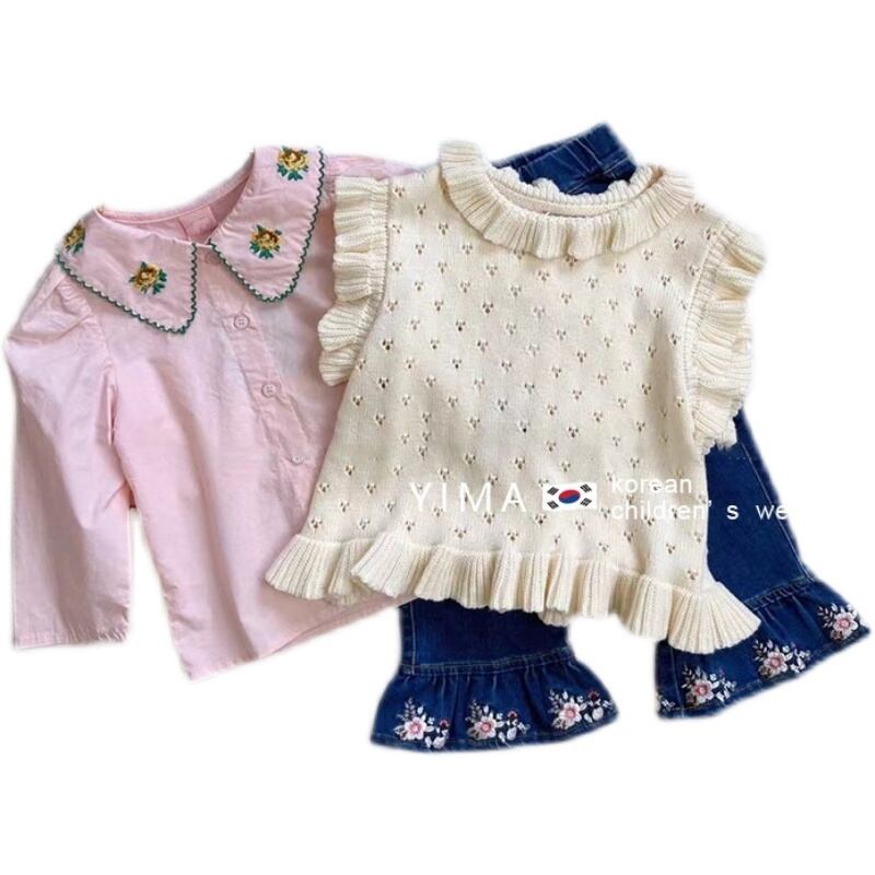 色:オフホワイトのニットベスト,ピンクのシャツ,ブルージーンズ,青いシャツ