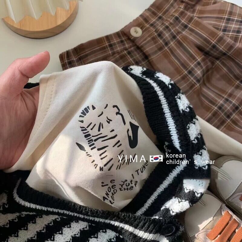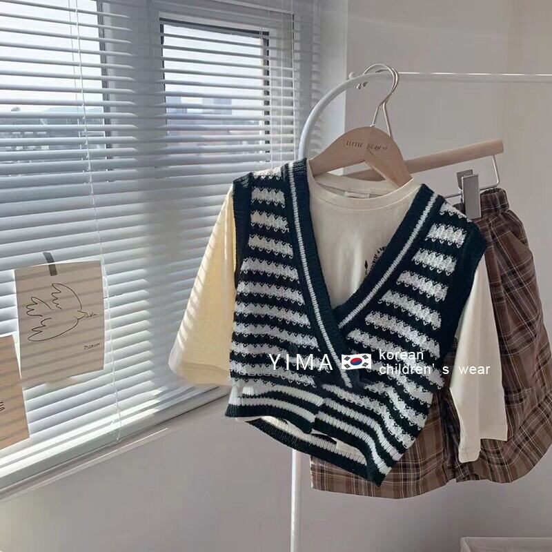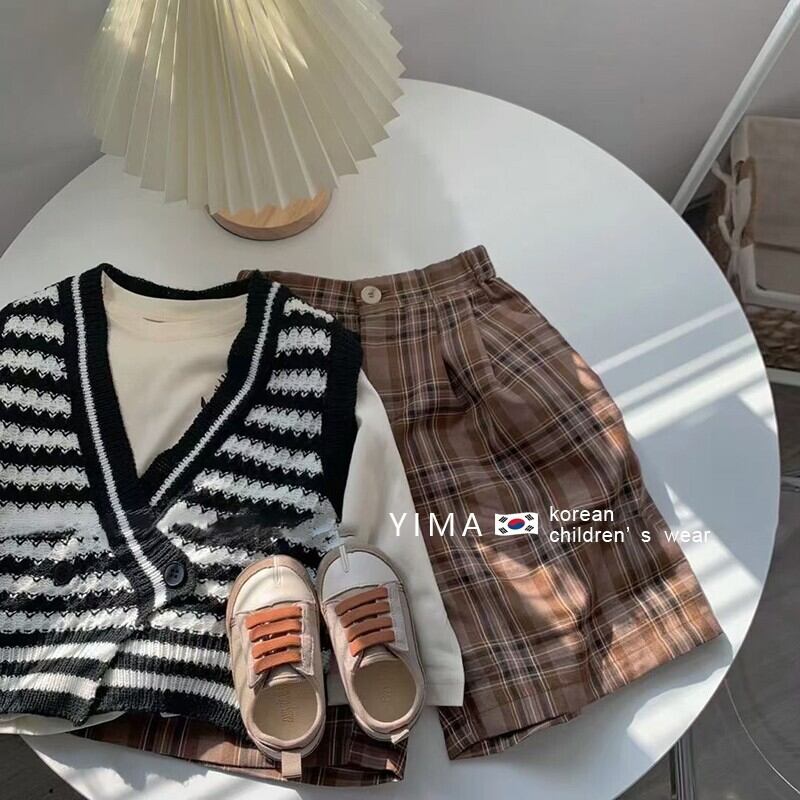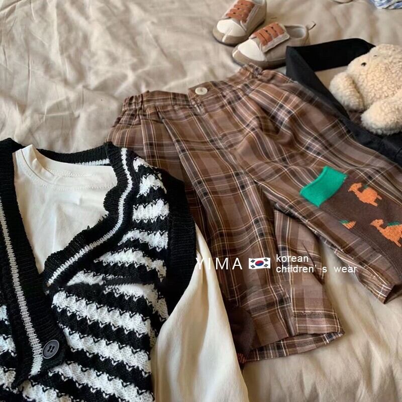 色:ストライプベスト,ベージュ長袖,チェック柄パンツ