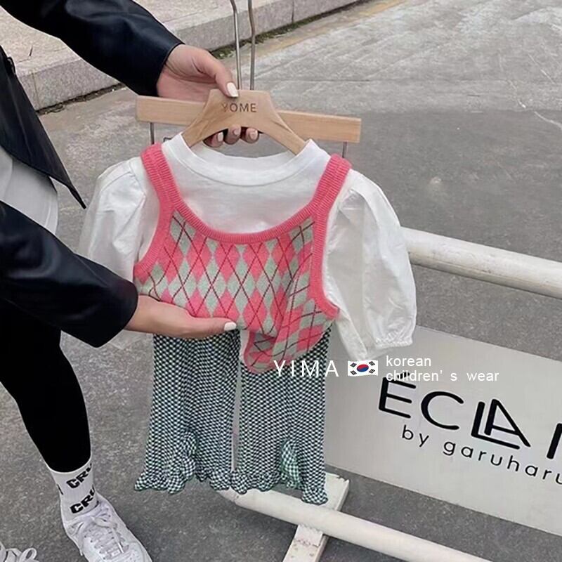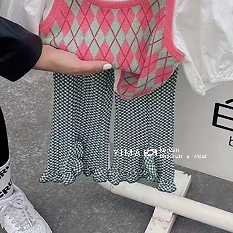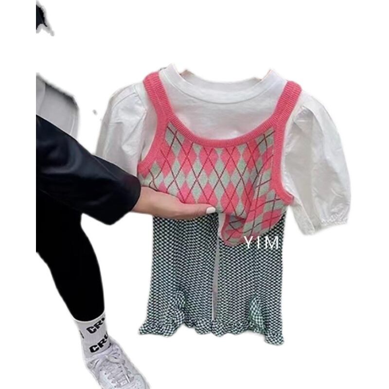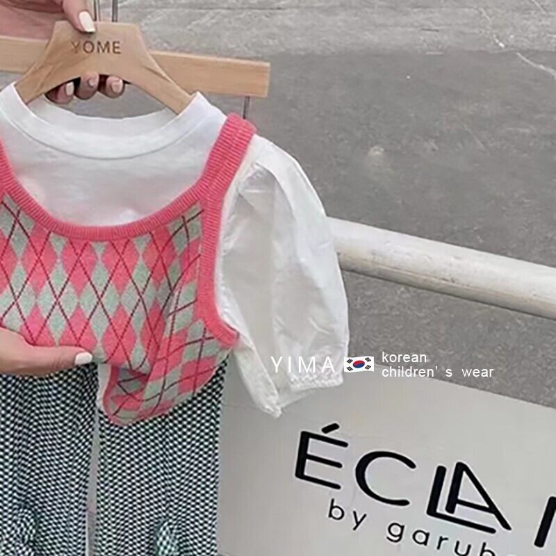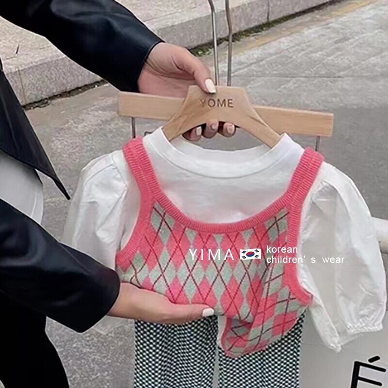 色:ピンクのアーガイルベスト,白いTシャツ,格子縞のズボン