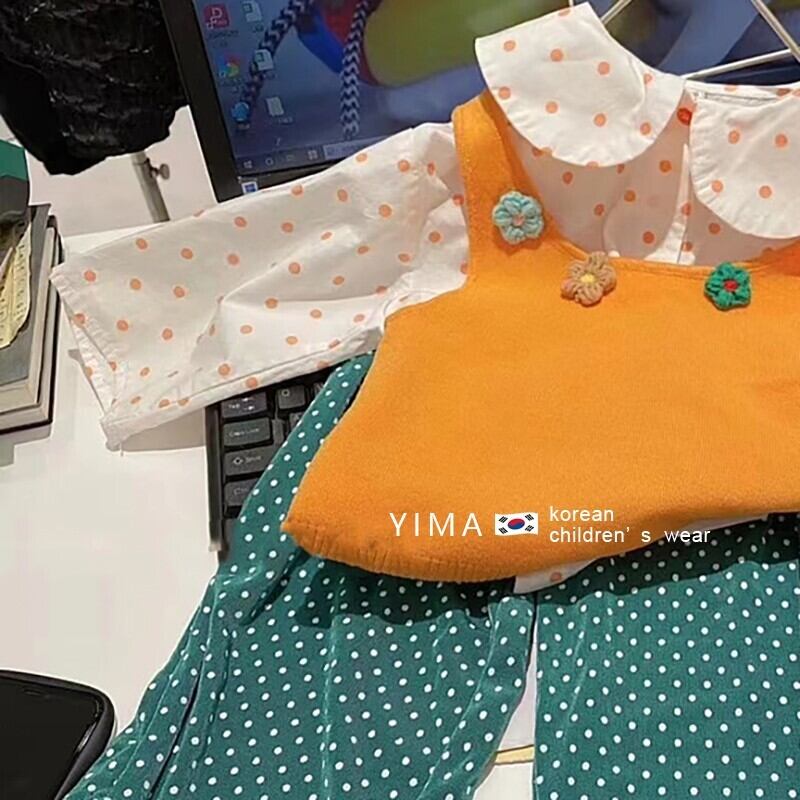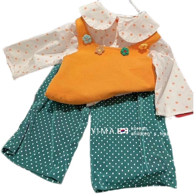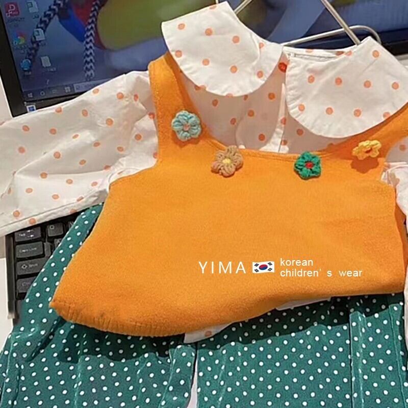 色:黄色のニットベスト,ホワイトポルカドットシャツ,グリーン水玉パンツ
