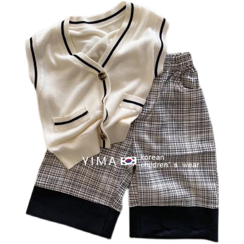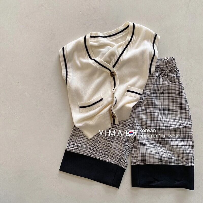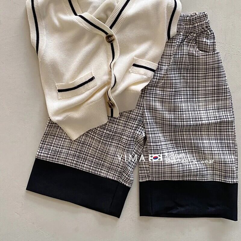 色:オフホワイトのノースリーブニットセーター,チェック柄ワイドレッグパンツ