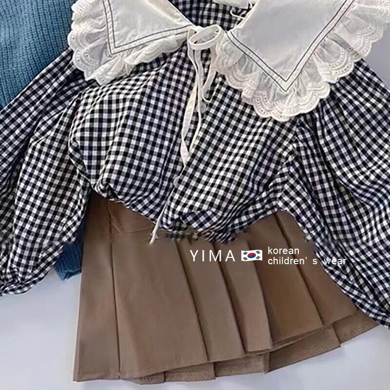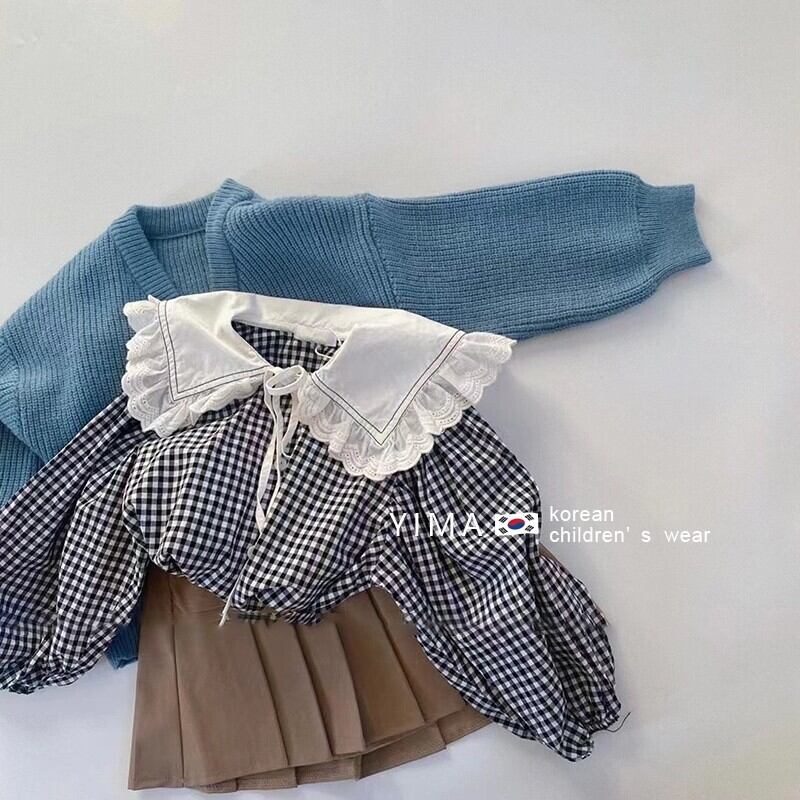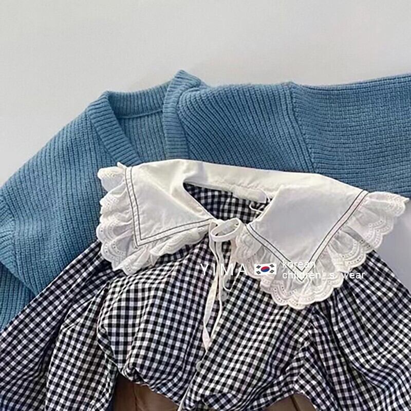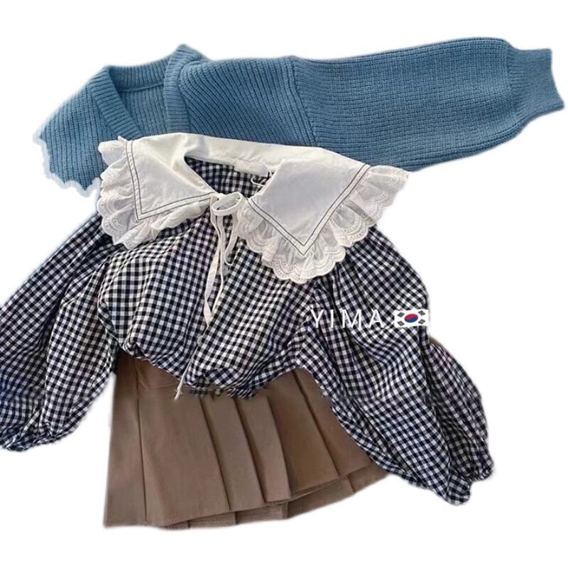 色:ドールカラーチェック柄シャツ,茶色のスカート,ピーコックブルーのセーター