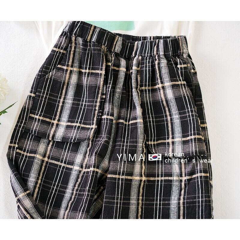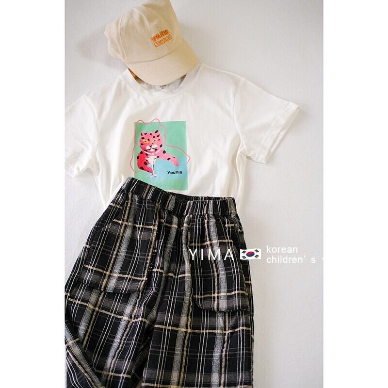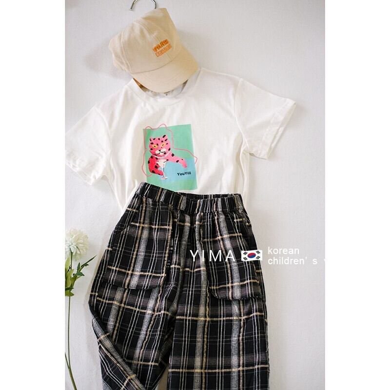 色:白い半袖トップ,黒のチェック柄パンツ