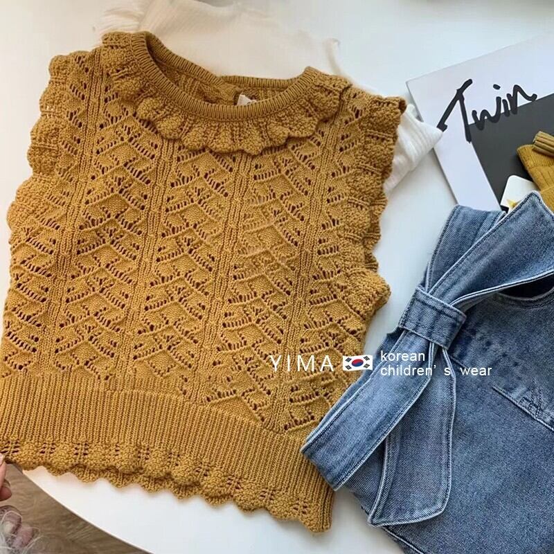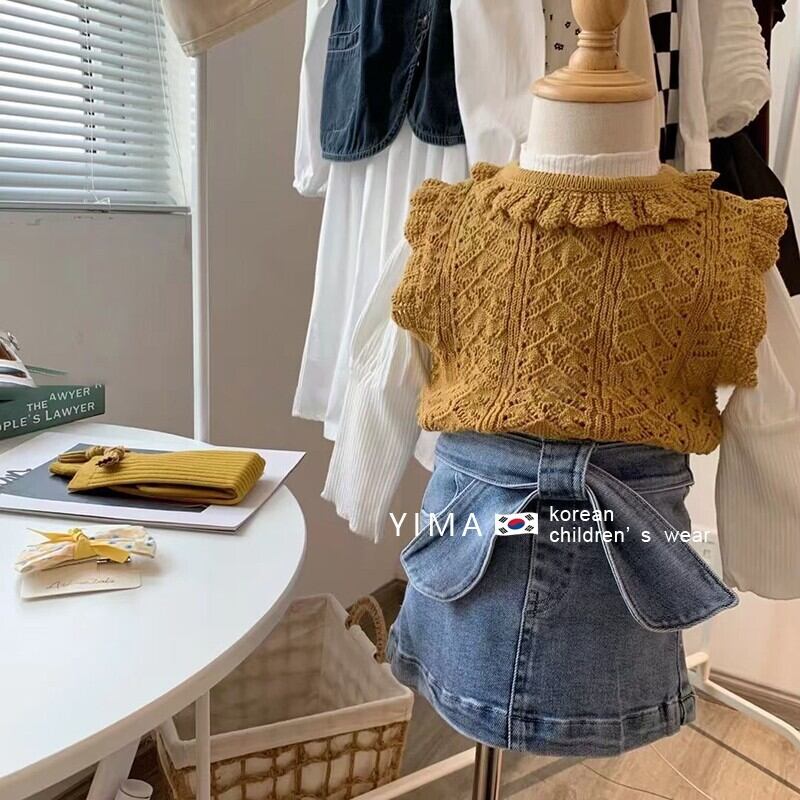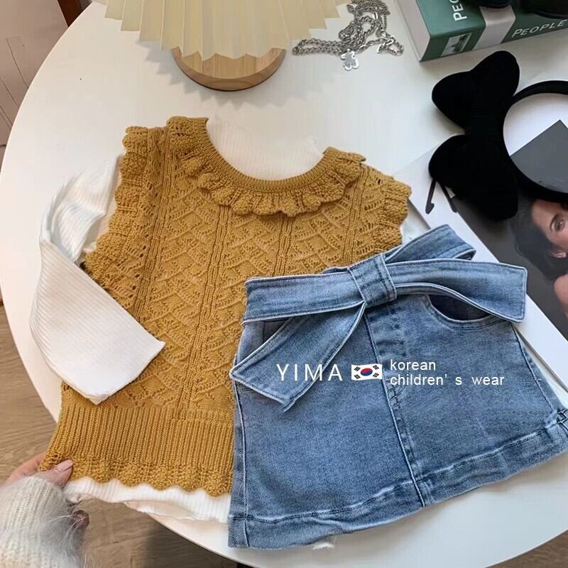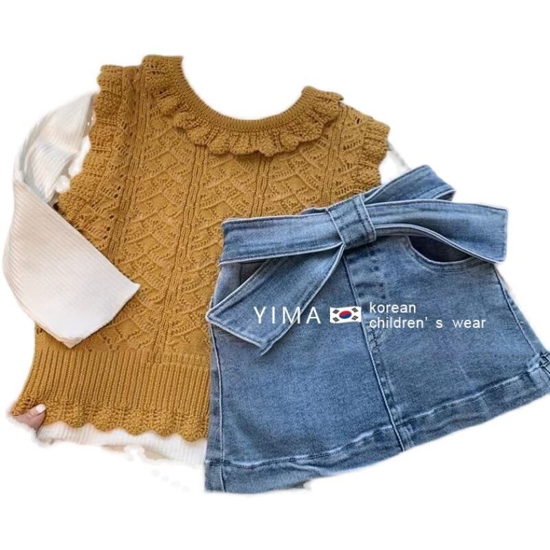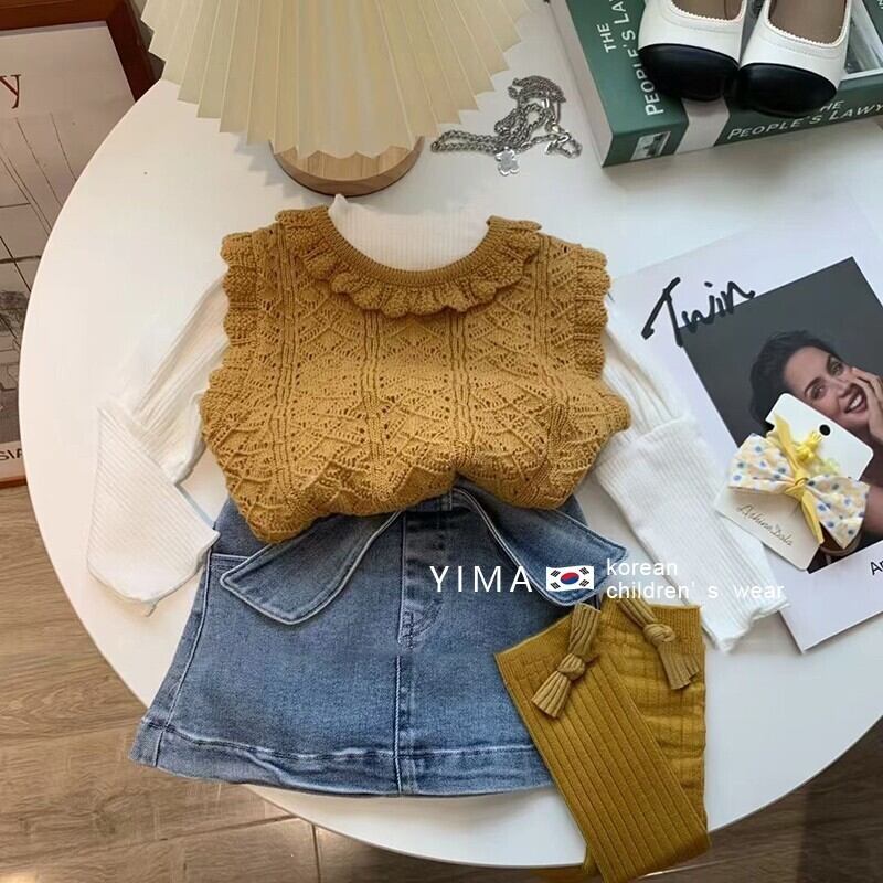 色:Ceeカラーニットベスト,ホワイトボトミングシャツ,ブルーデニムスカート