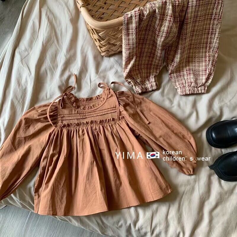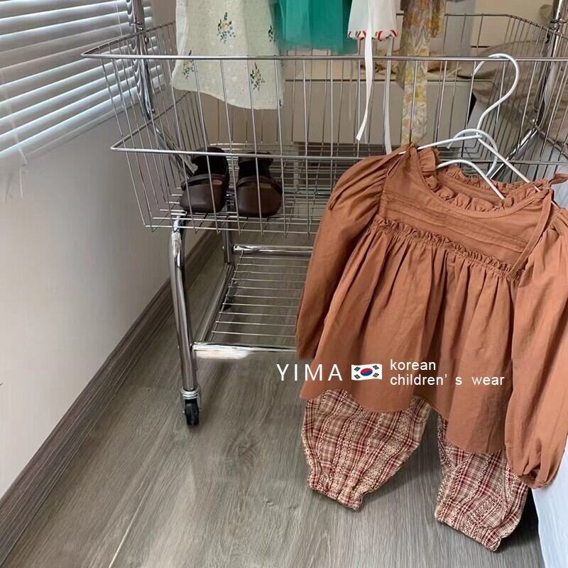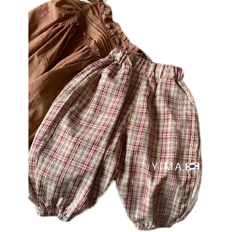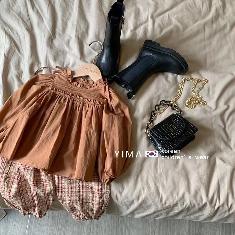 色:茶色のシャツ,赤いチェック柄パンツ