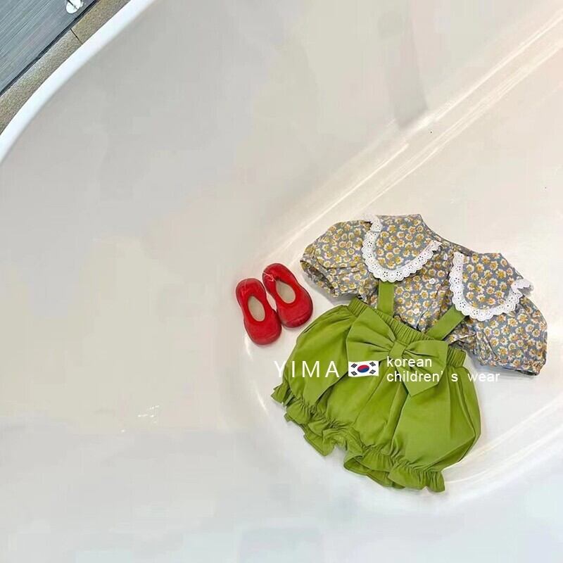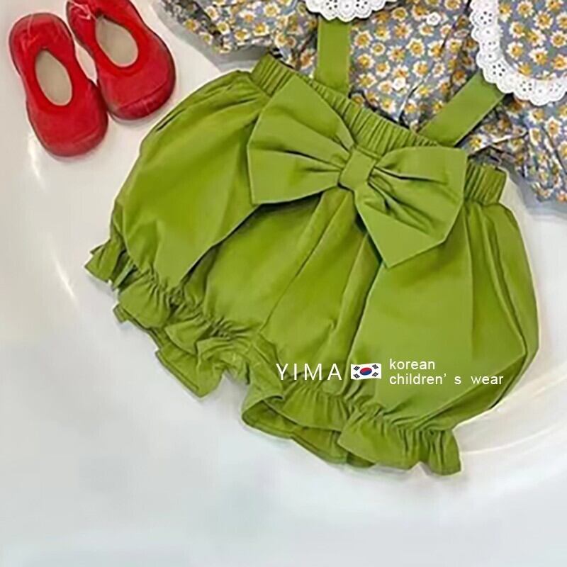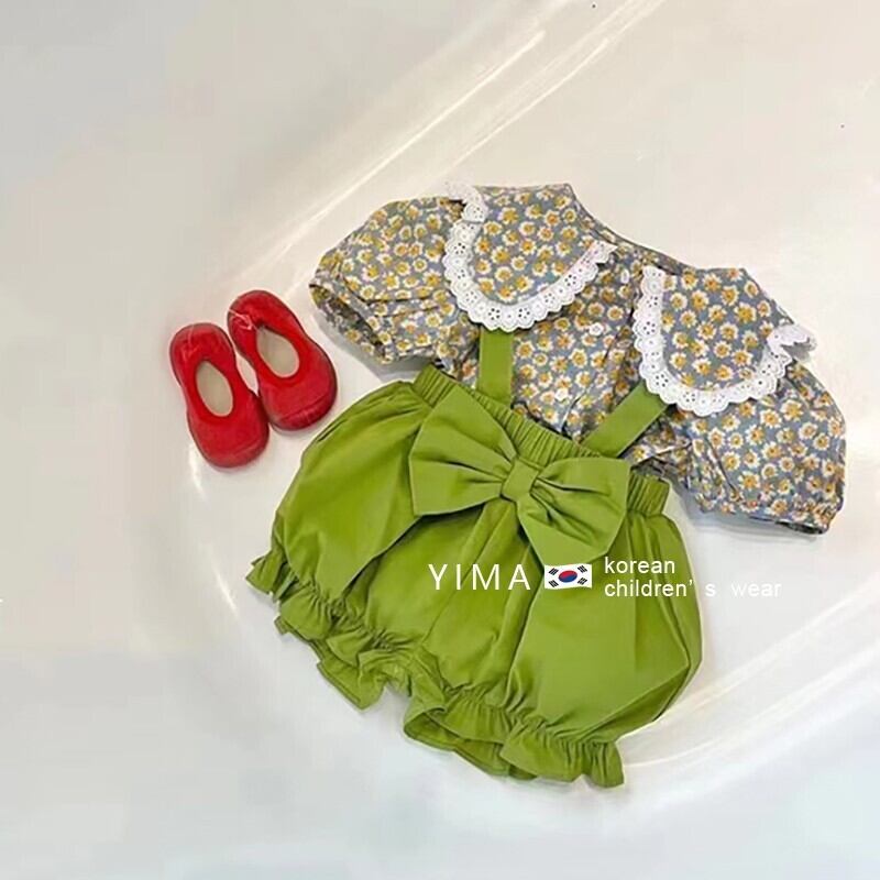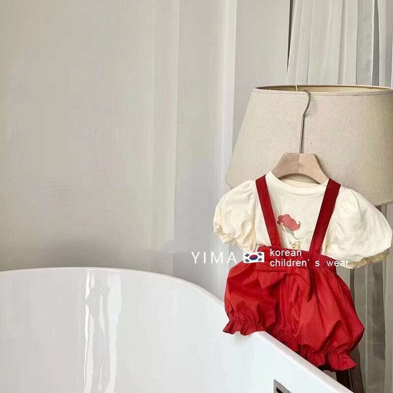 色:フルーツグリーンランタンのオーバーオール,レッドボウブルマ,白いTシャツ,フローラルドールカラーシャツ