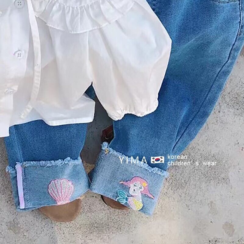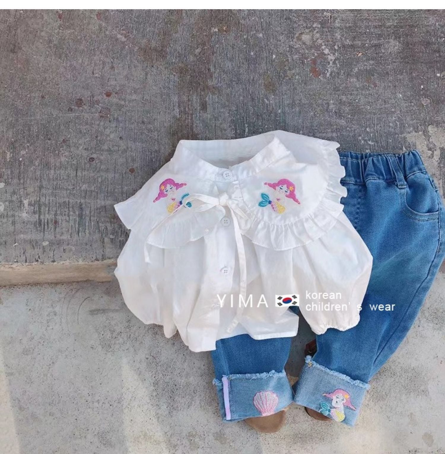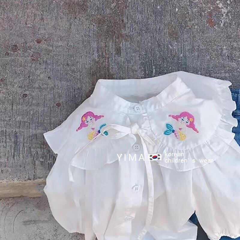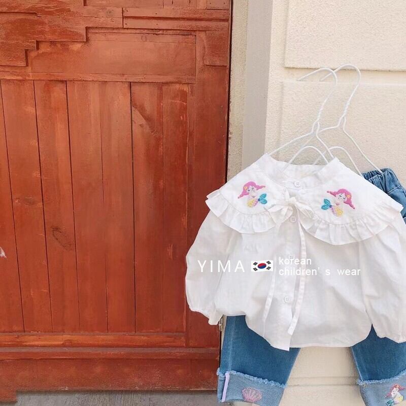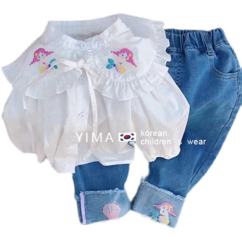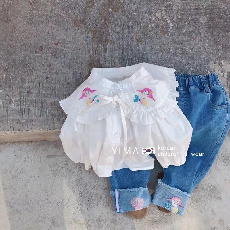 色:白のシャツ,ブルー刺繍ジーンズ