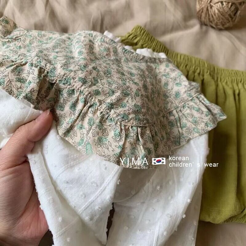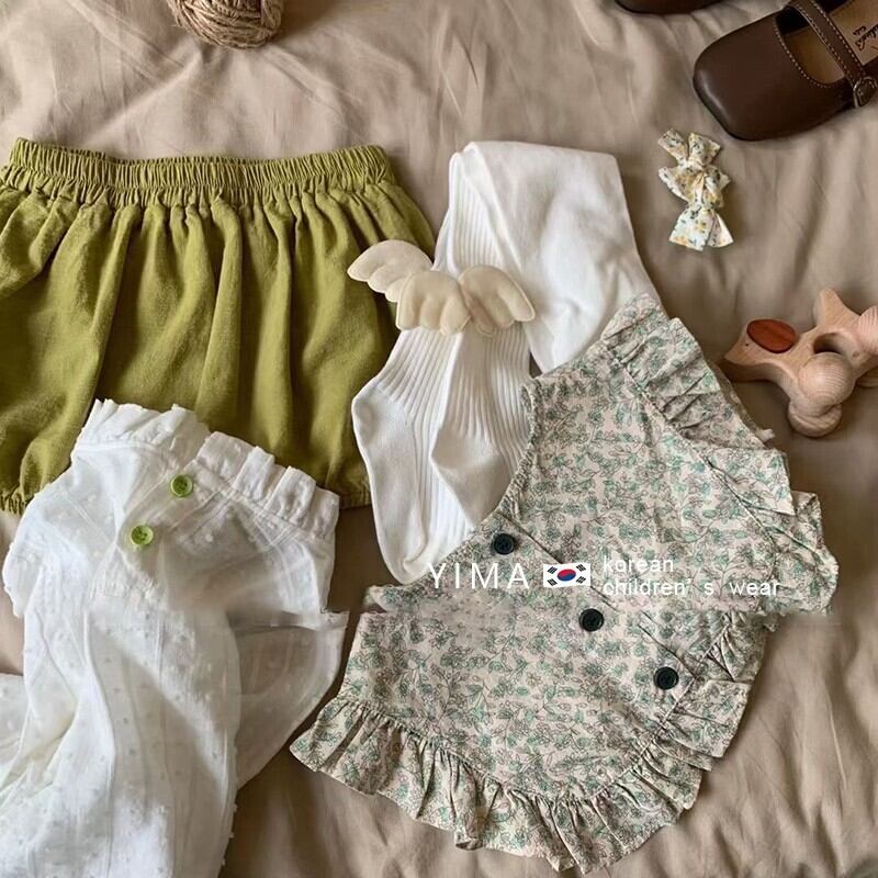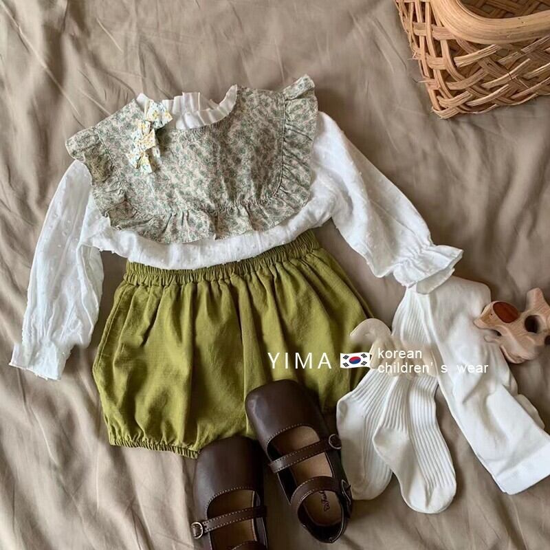 色:白のシャツ,花柄フリルチョッキ,オリーブグリーンのショートパンツ